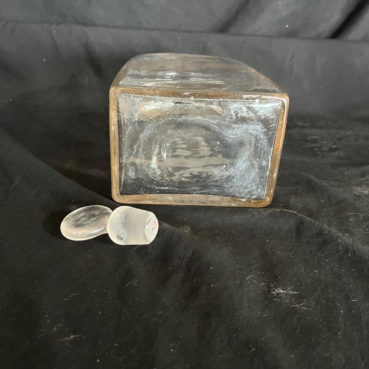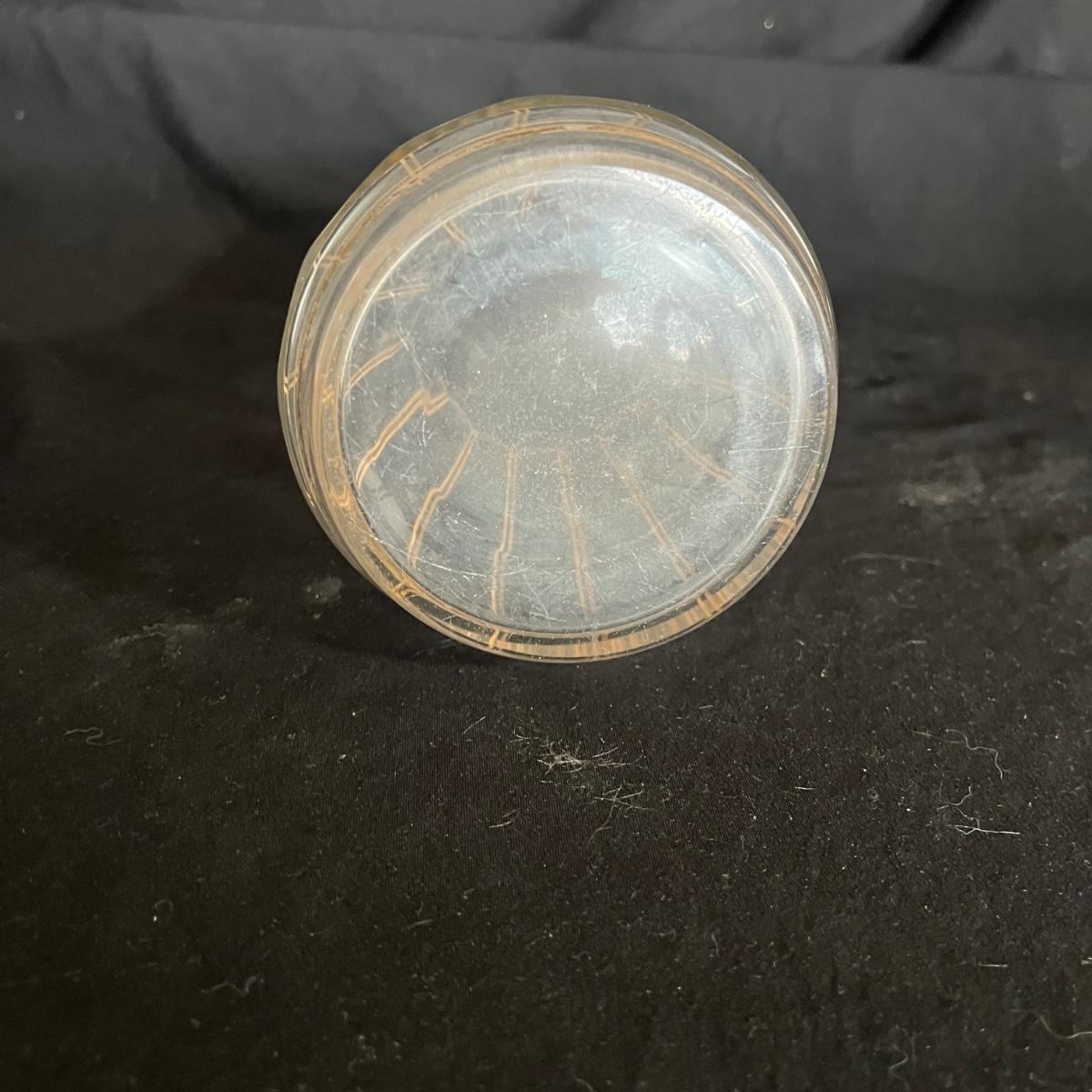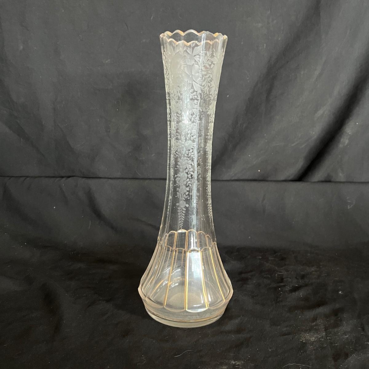 Three gold accented glass pieces. The alcohol containers with glass stoppers measure approximately 5” x 3” x 10”H. The floral etched vase measures 2.5”D x 11”H.