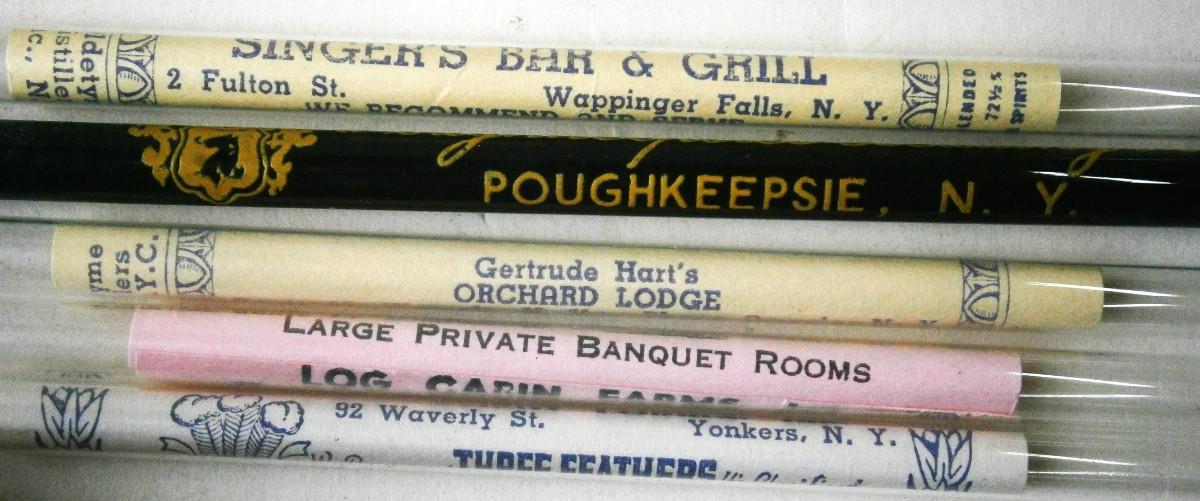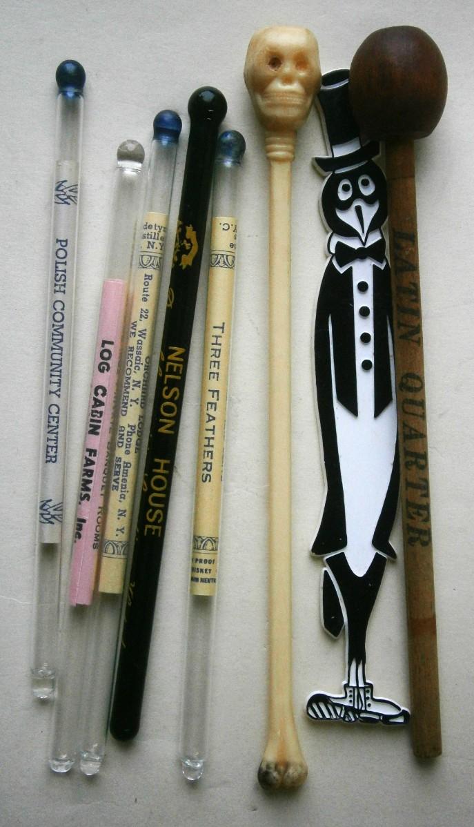 Assorted Bar Drink Swizzle Stir Sticks, some local advertising, and nifty skull stick.