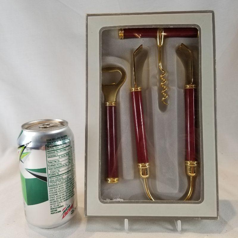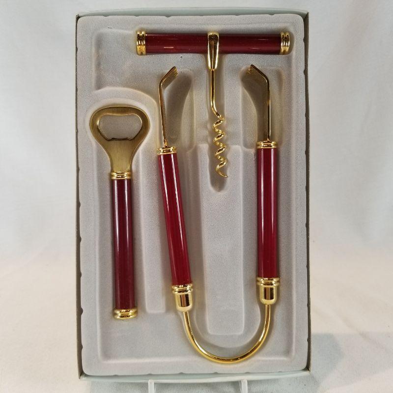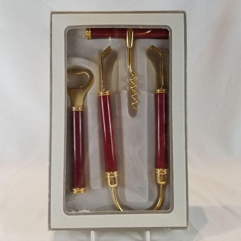 Bar Tools. New in a box - gold tone metal with burgundy-handles. Pair these tools with a favorite bottle of wine and you have a nice hostess gift. Appears new and unused. All in very good condition.