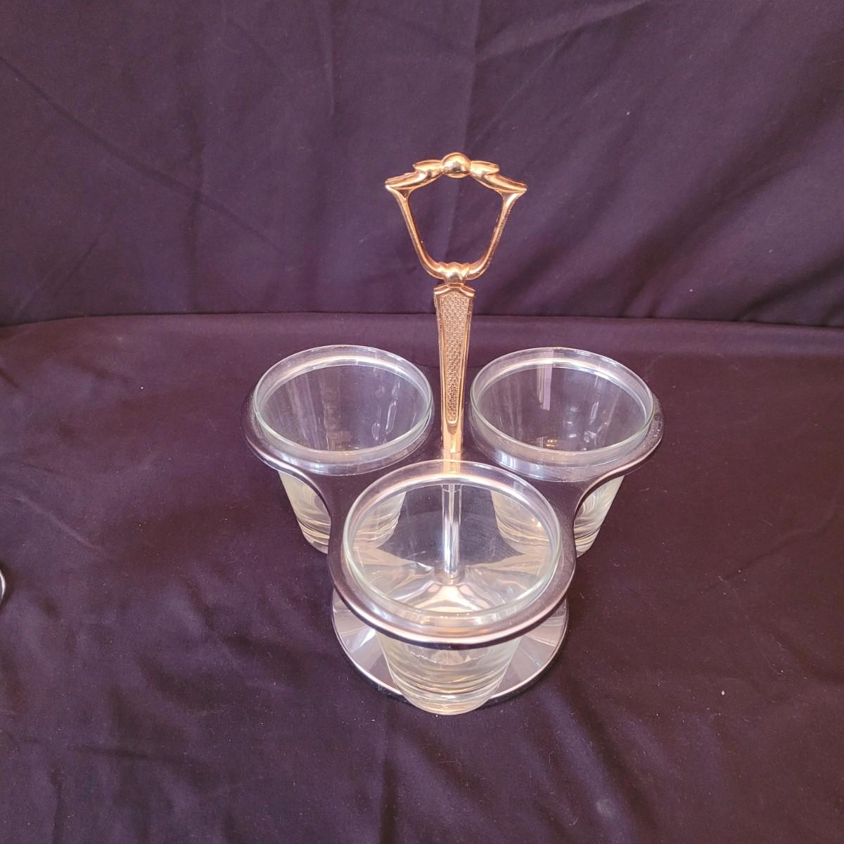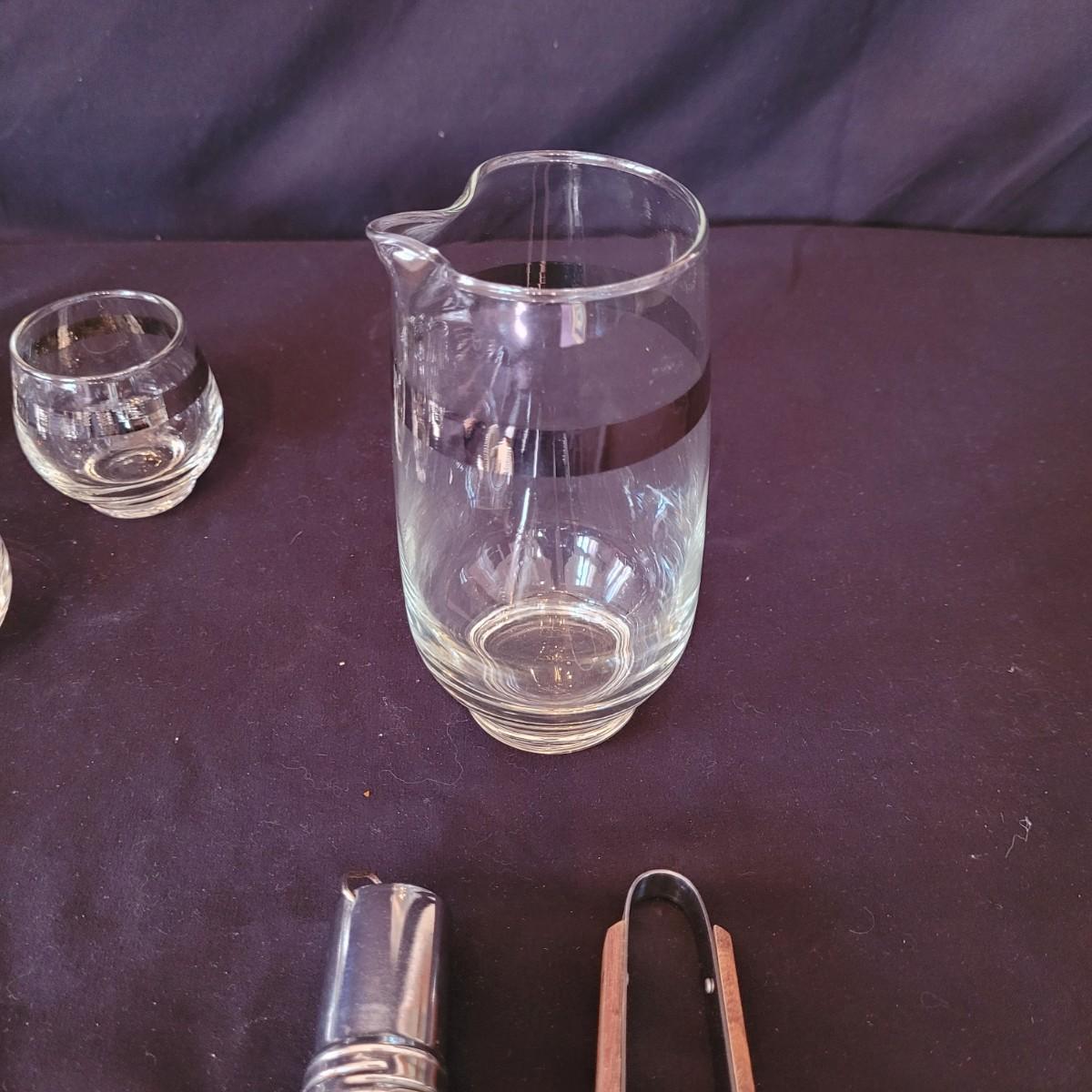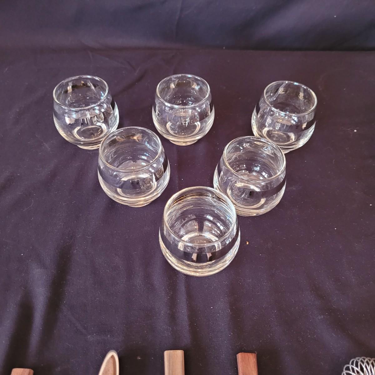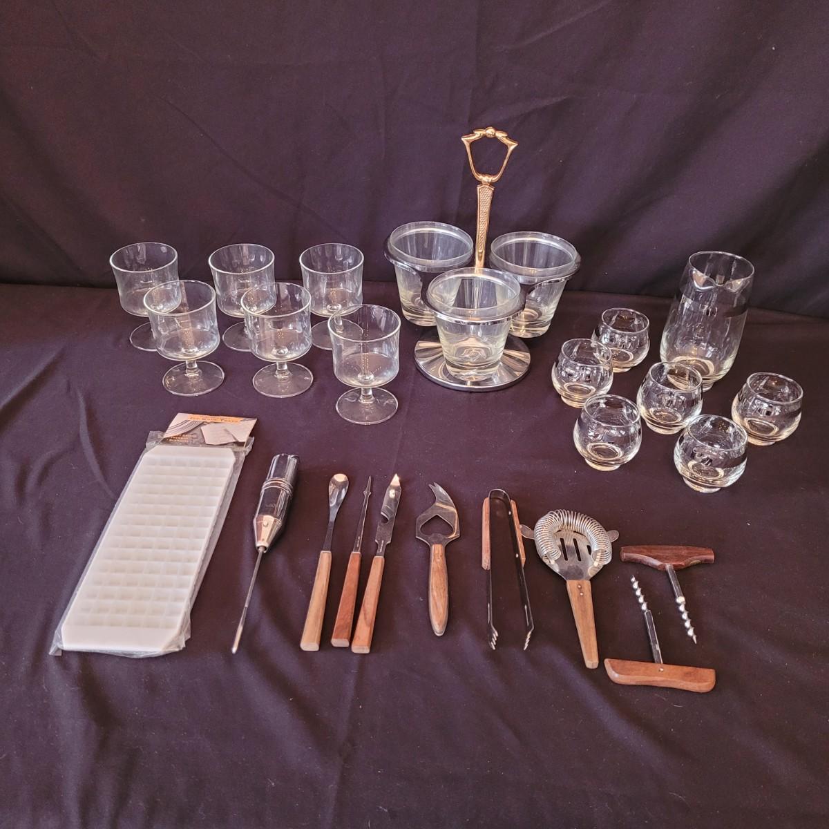 This collection of bar items includes six small glasses, a karaff, garnish server, six goblet style glasses, a mini ice cube tray and several tools. Battery powered stirring tool not tested. Shipping available.