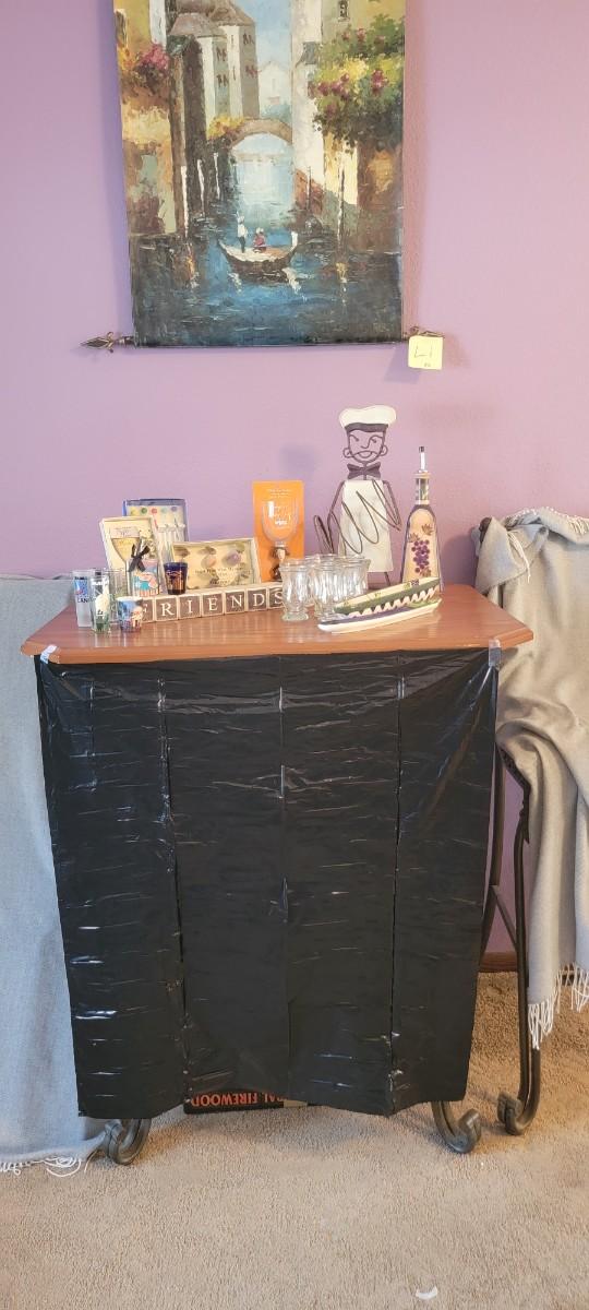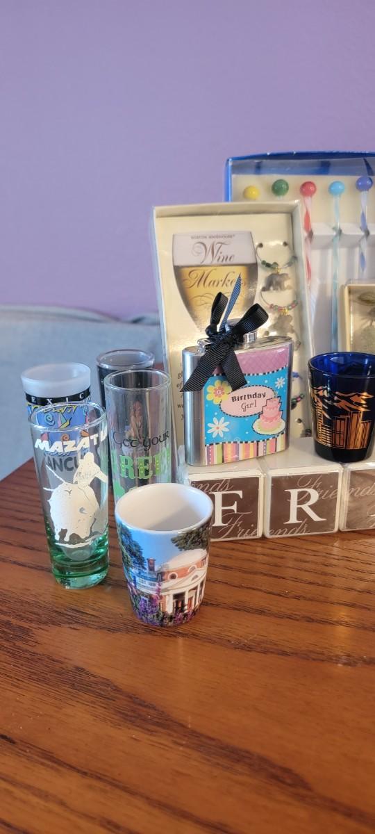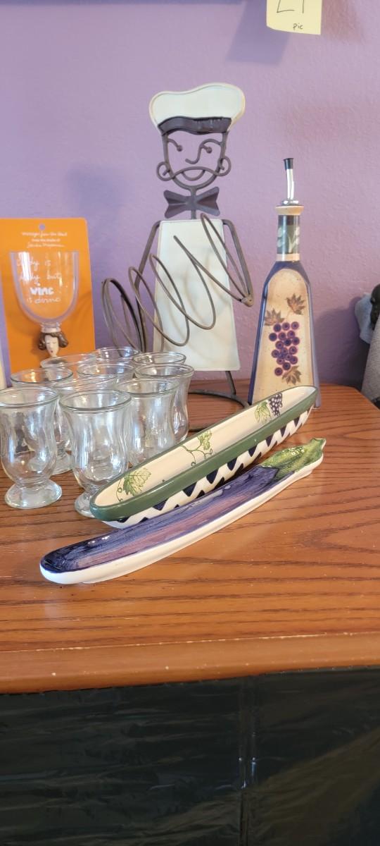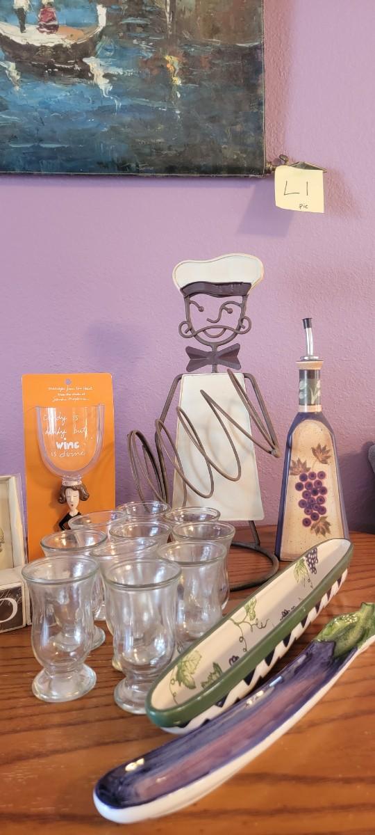 Fun bar related items! Wine holder, stir sticks, wine glass markers, olive trays, plus. Does nit include art on wall.