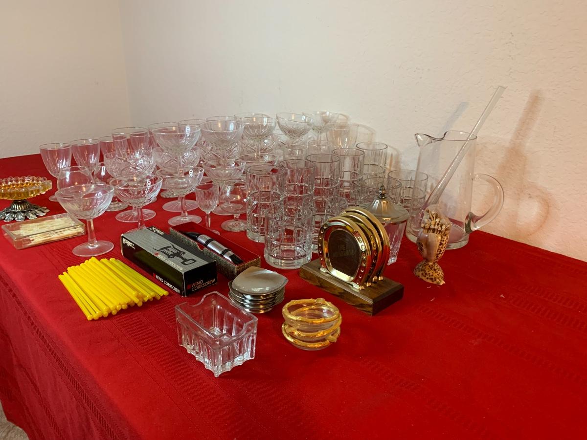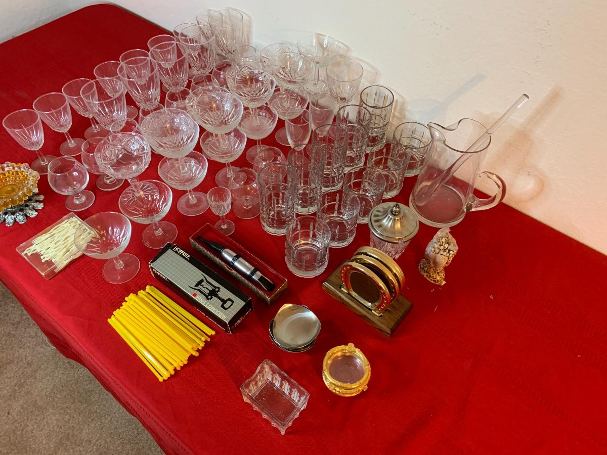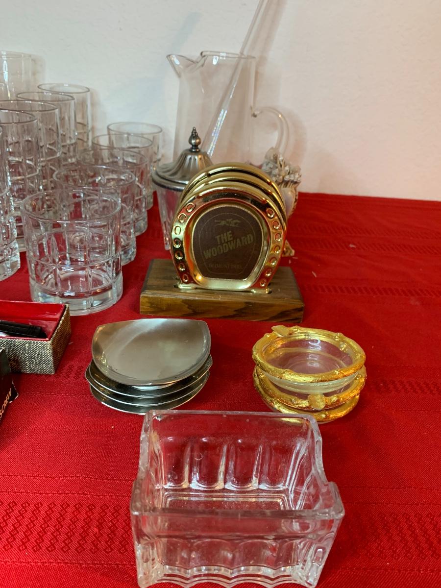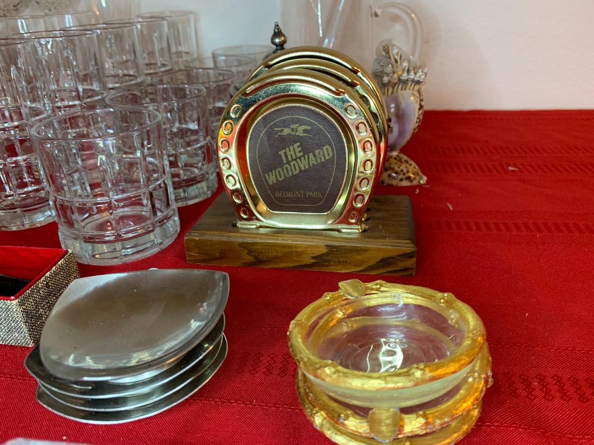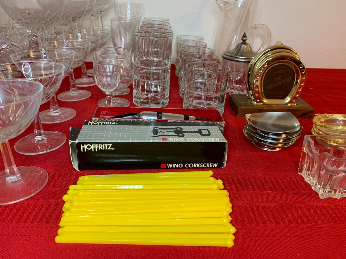 Includes a cat tail pitcher with glass stir rod, Set of The Woodward Belmont Park horseshoe coasters, Vintage Cork Ace, ash trays, cocktail picks and a large selection of stemware, snifters, highballs and lowball glassware.