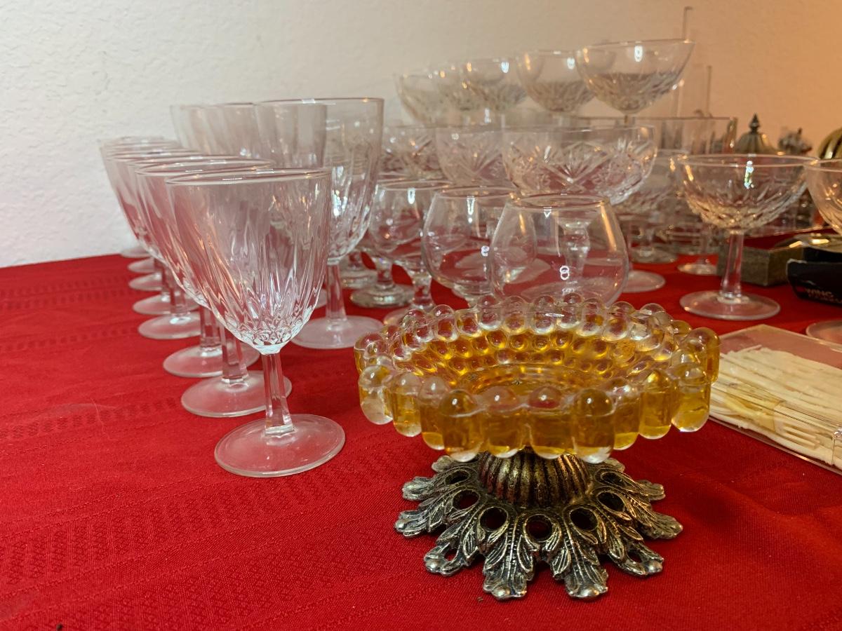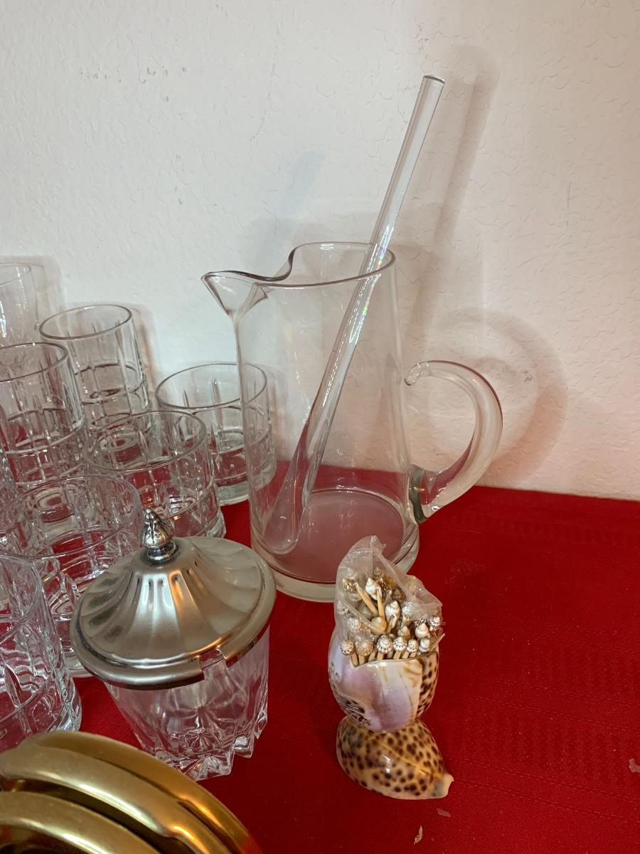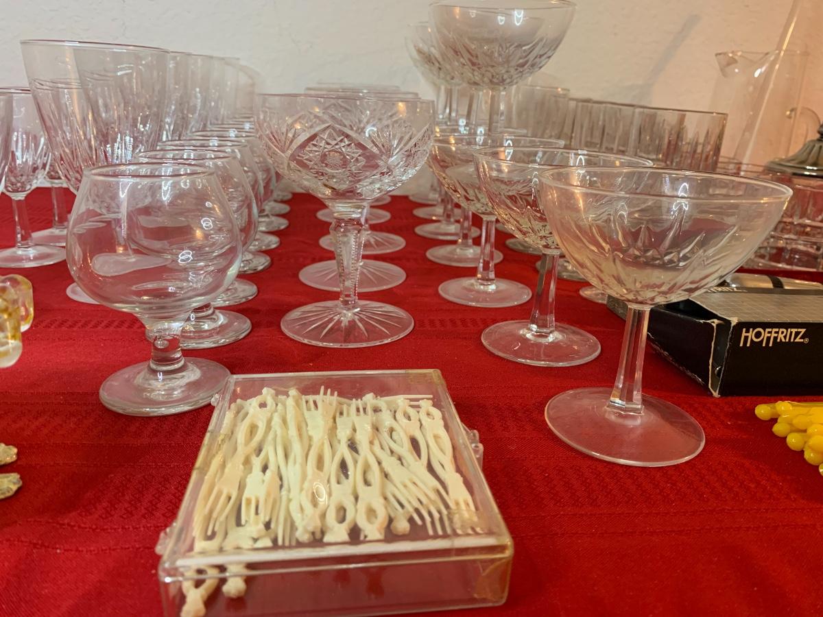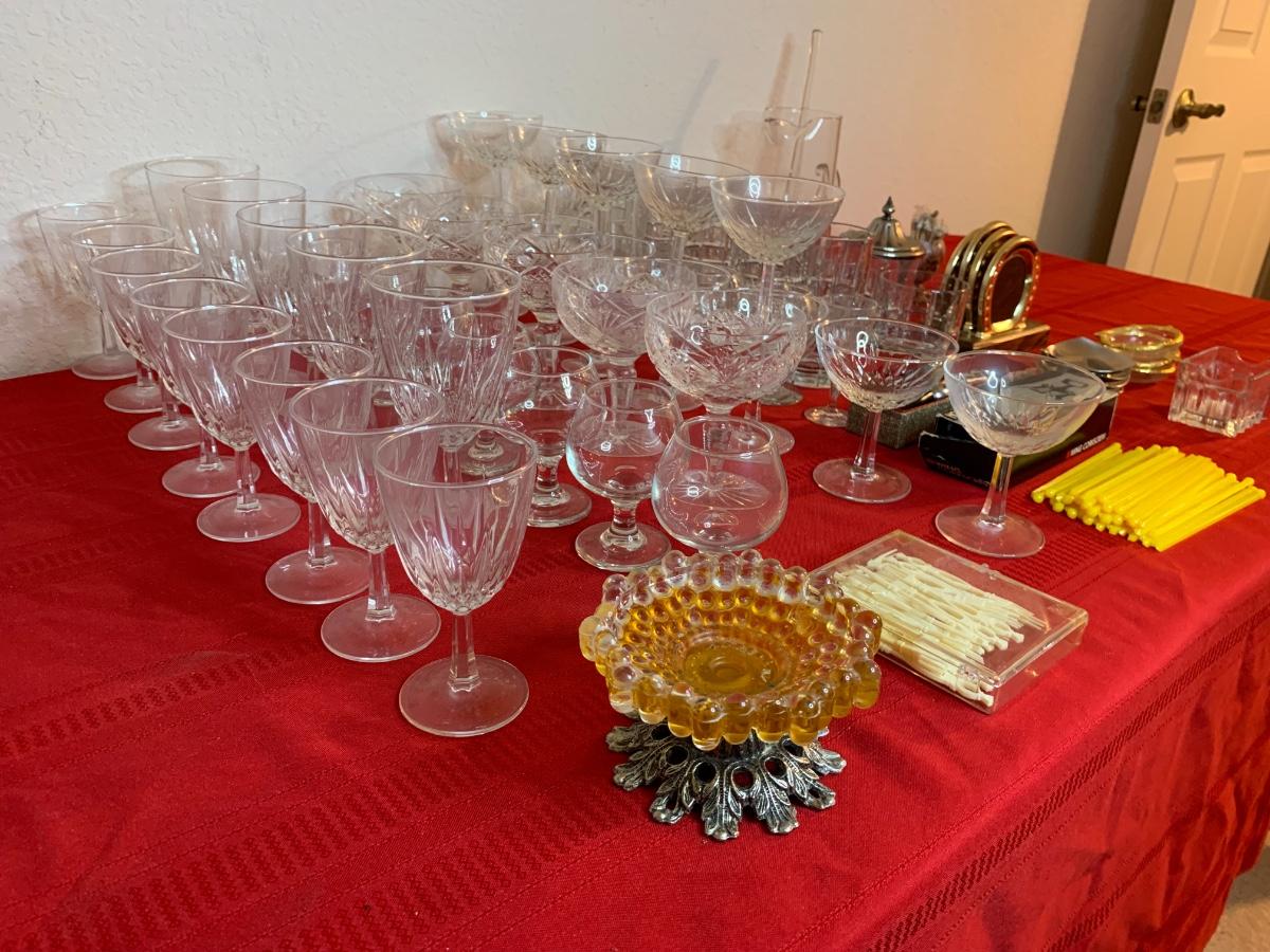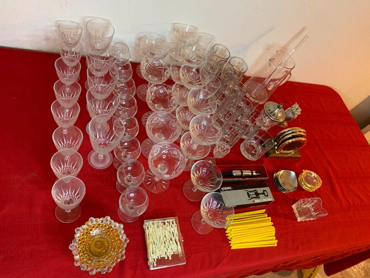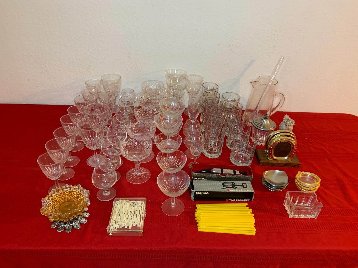 Includes a cat tail pitcher with glass stir rod, Set of The Woodward Belmont Park horseshoe coasters, Vintage Cork Ace, ash trays, cocktail picks and a large selection of stemware, snifters, highballs and lowball glassware.