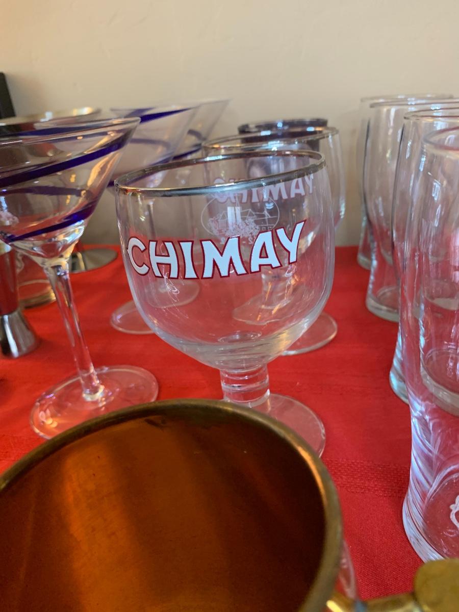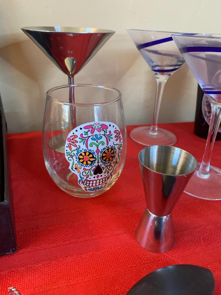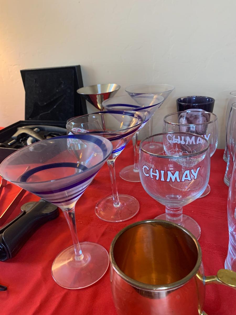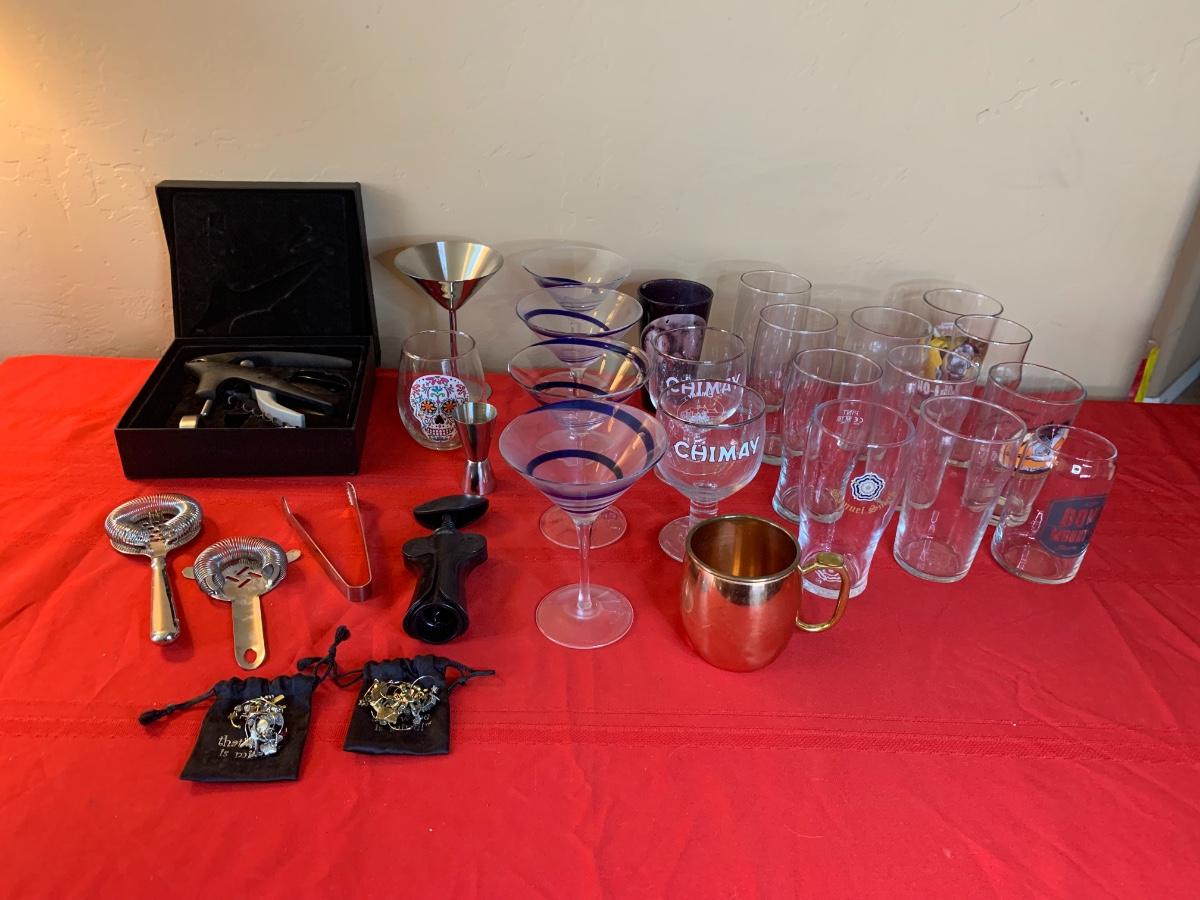 All the essentials you need to stock your bar including beer glasses, blue swirl martini glasses. screw pull wine opener, oxo wine opener and chimay glasses. Also includes wine glass charms and a Vinturi wine airator. All in good to great material