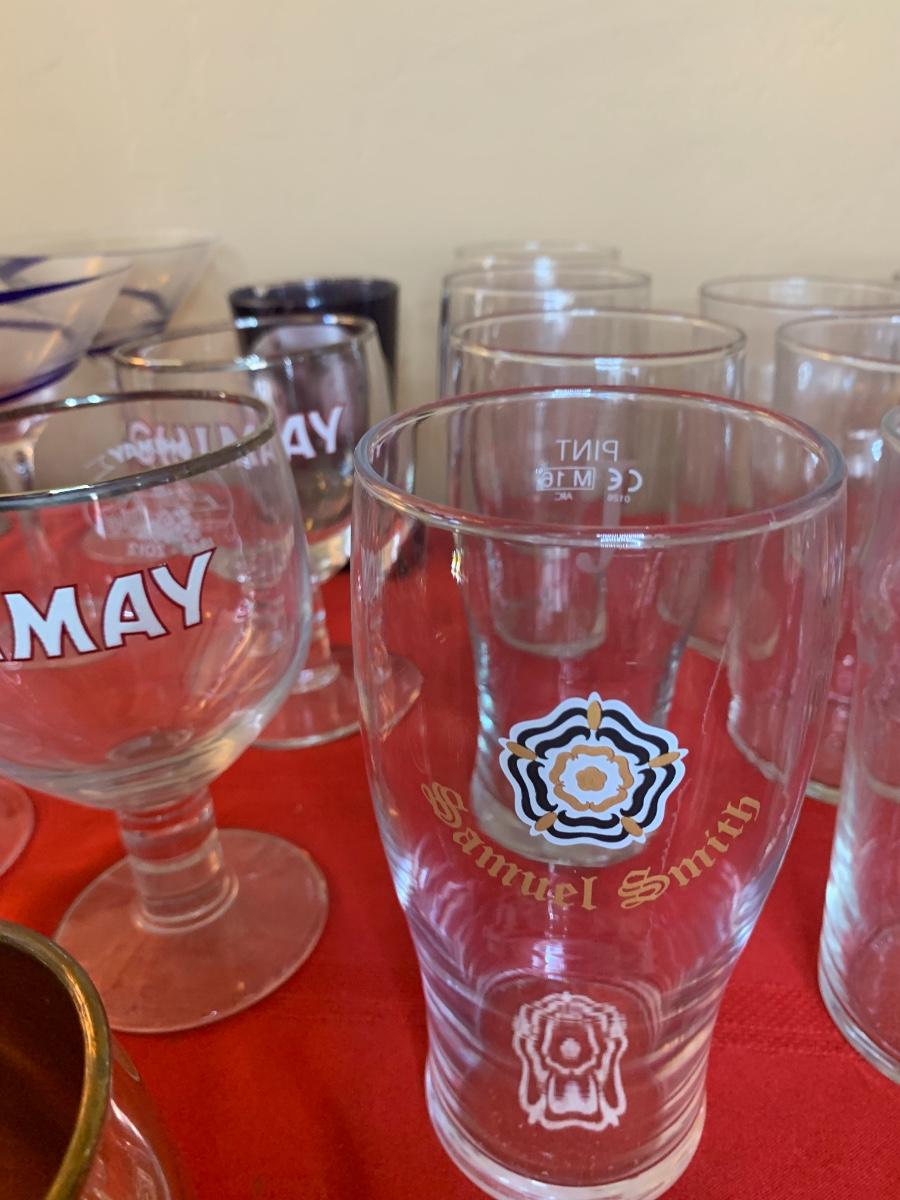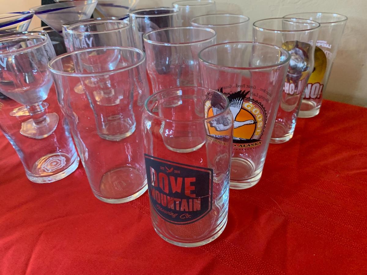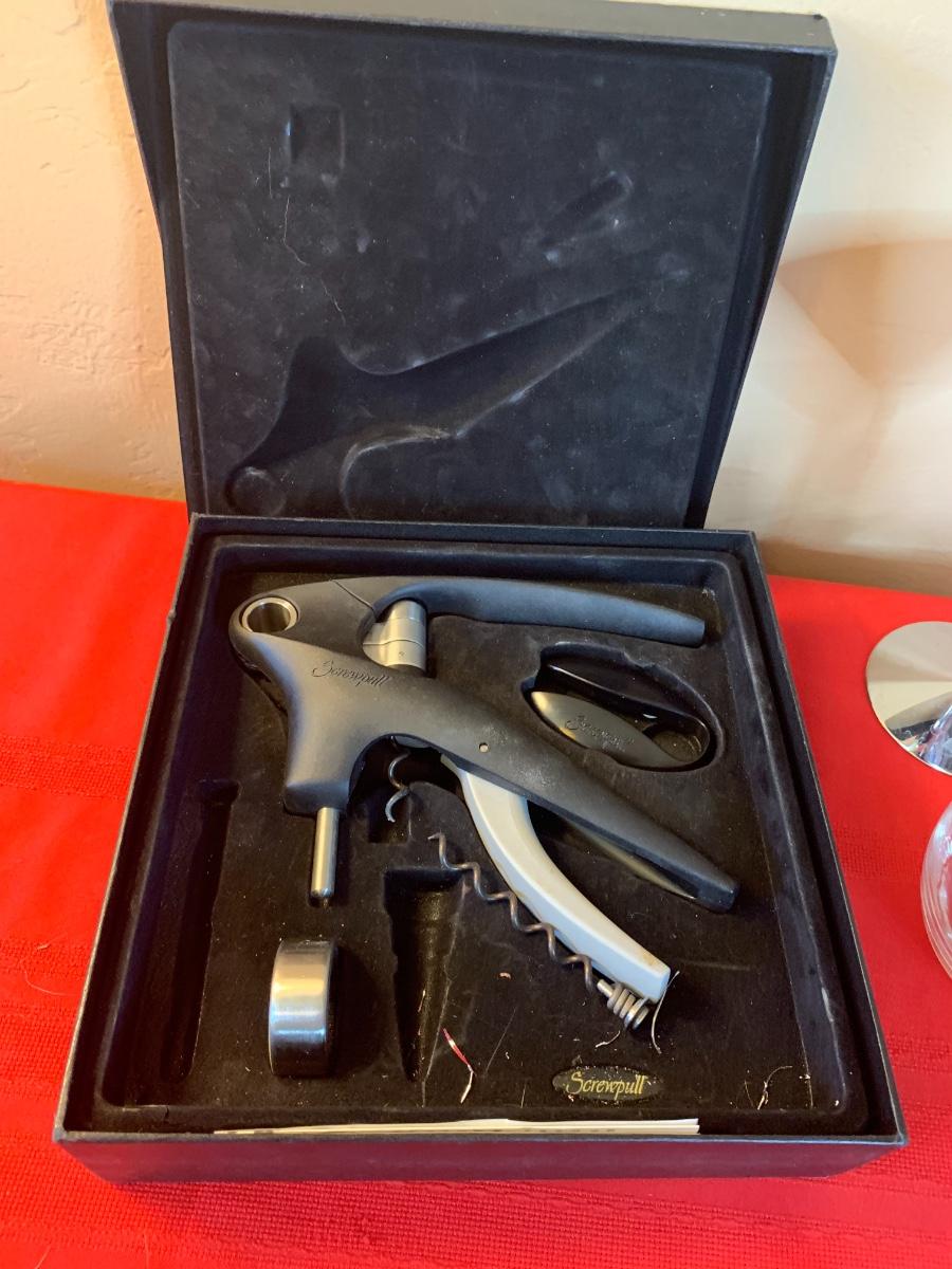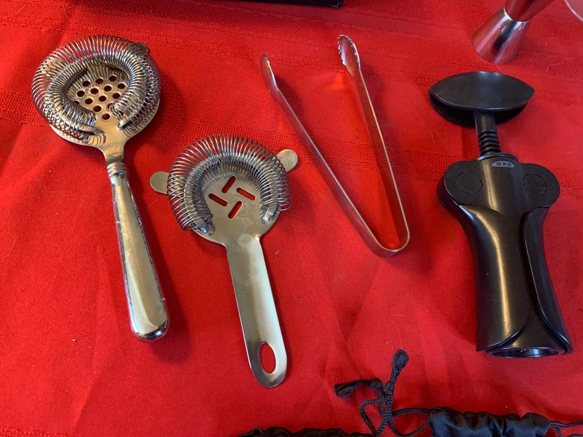 All the essentials you need to stock your bar including beer glasses, blue swirl martini glasses. screw pull wine opener, oxo wine opener and chimay glasses. Also includes wine glass charms and a Vinturi wine airator. All in good to great material