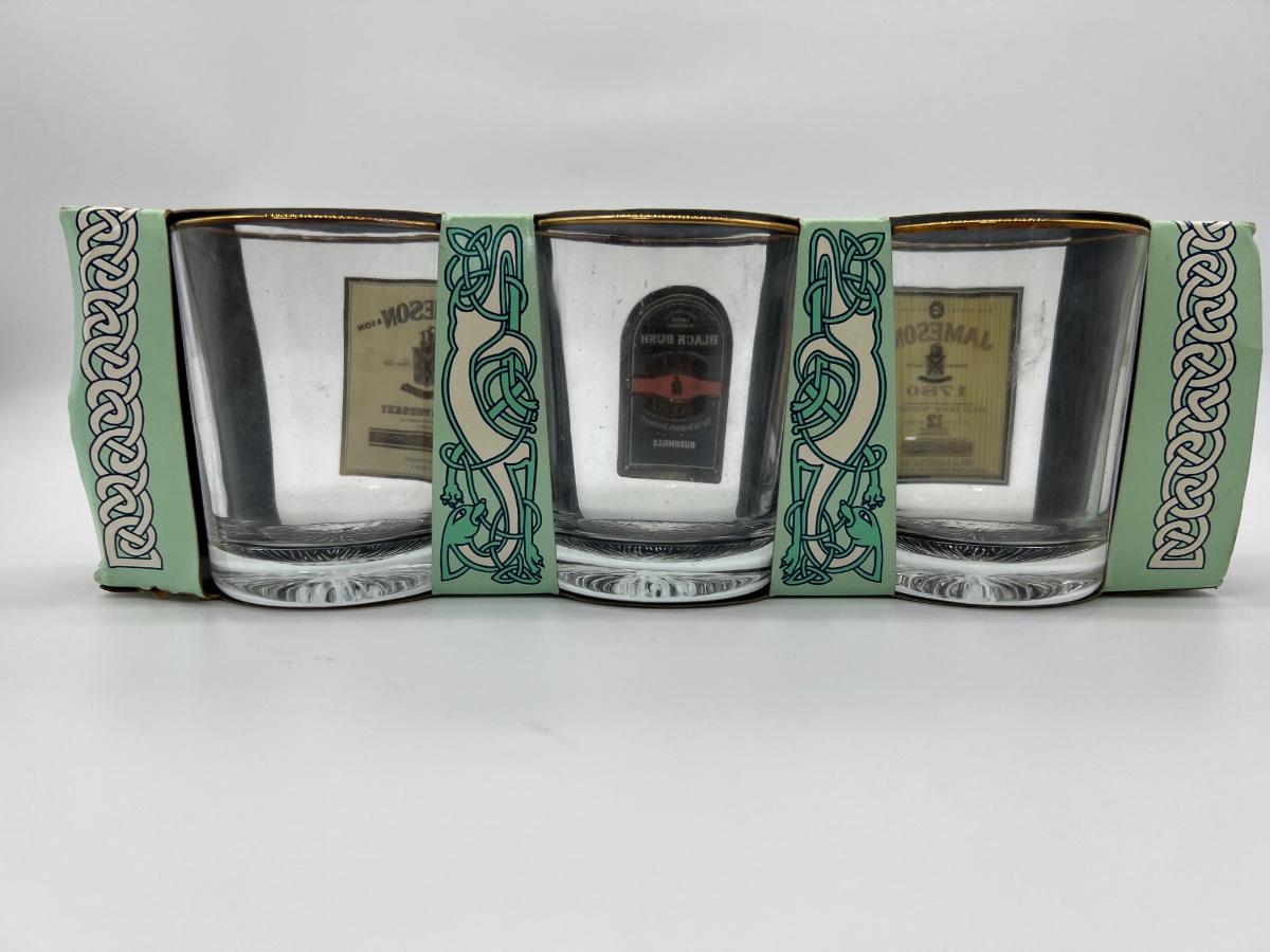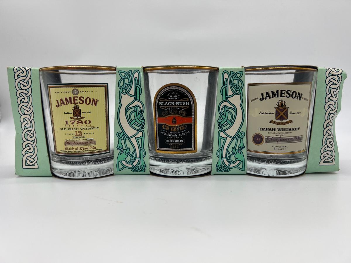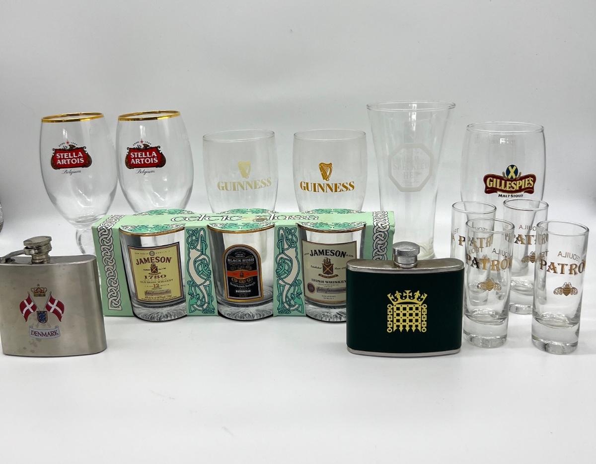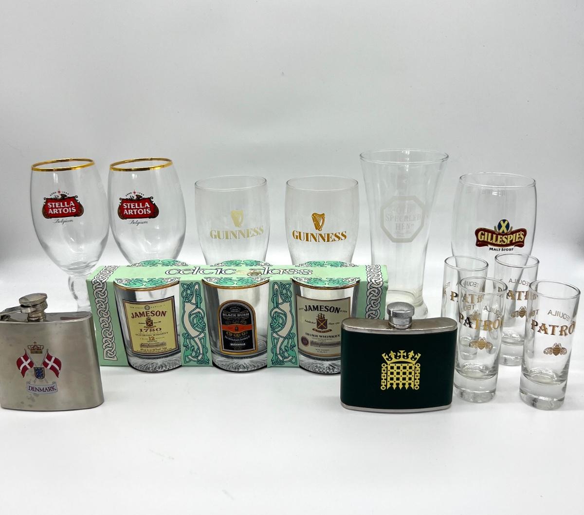 Perfect set up for your home bar! Set includes three Jameson Celtic glasses, two Stella rose glasses, three GUINNESS glasses, one GILLESPIES stout, for Patrone shot glasses and two flasks.