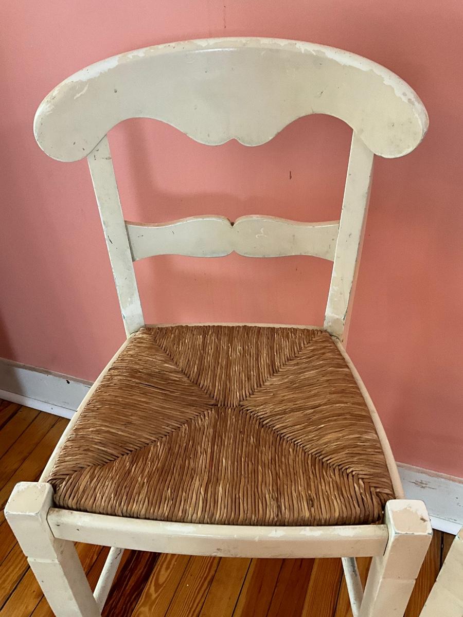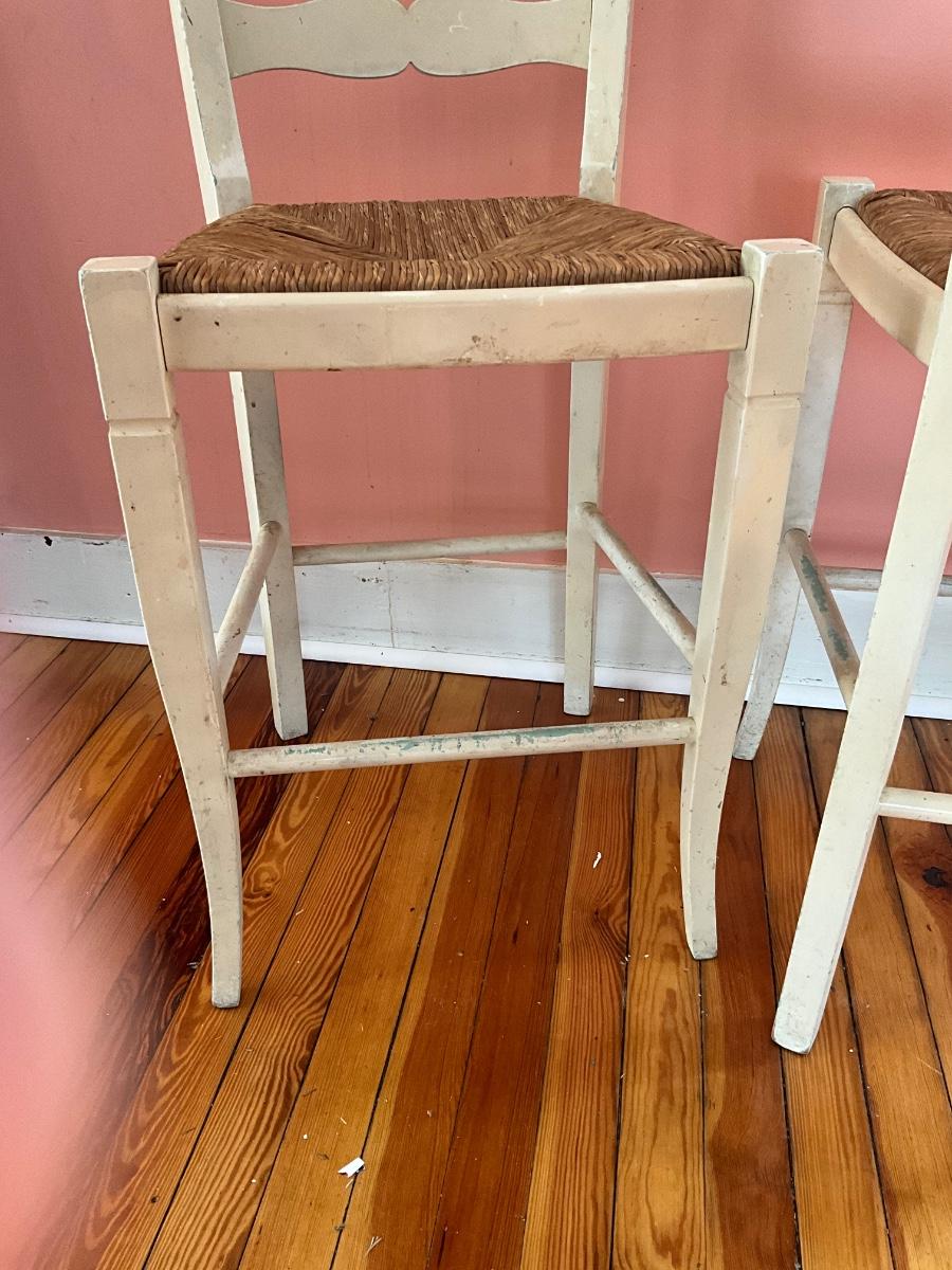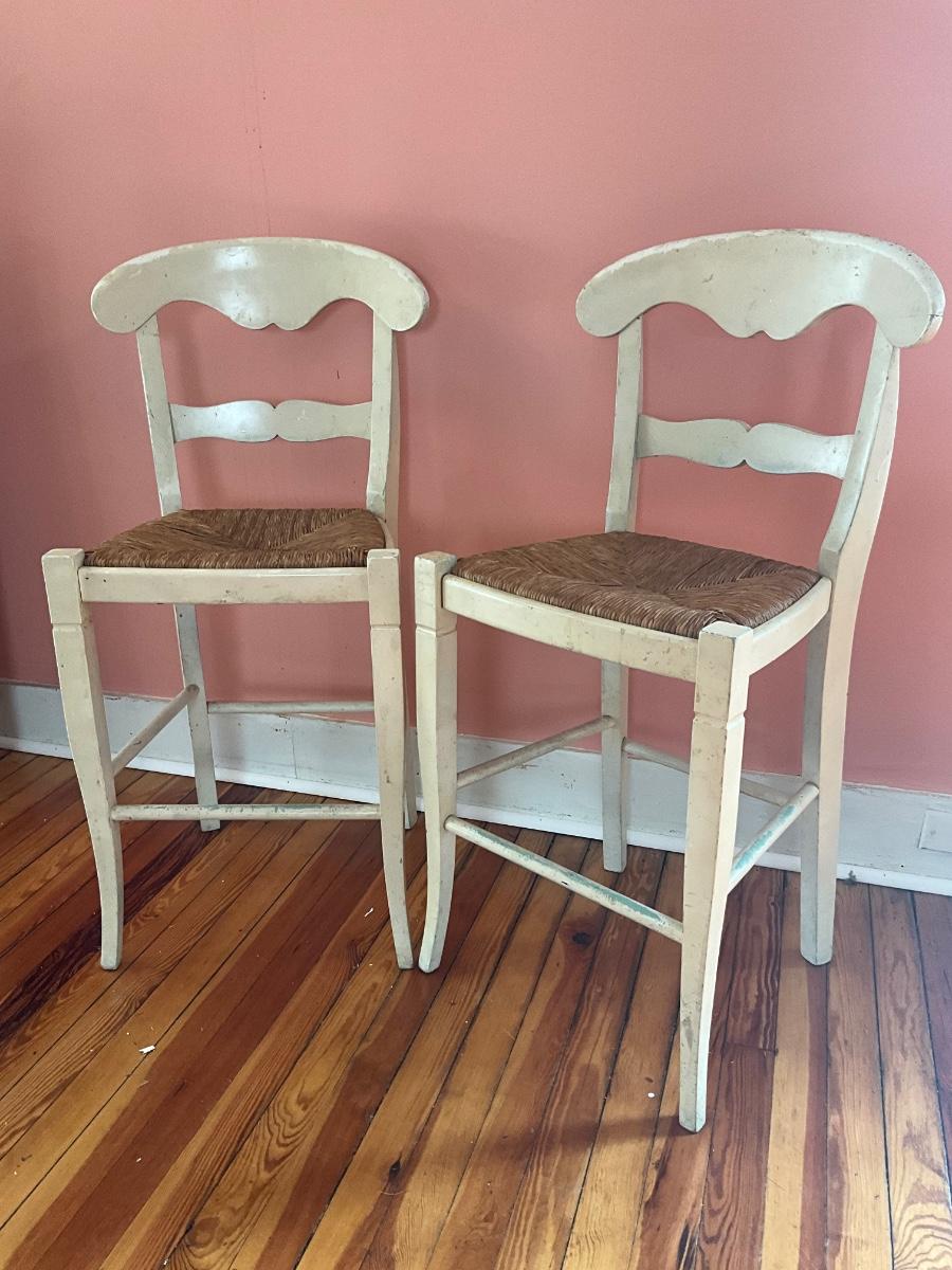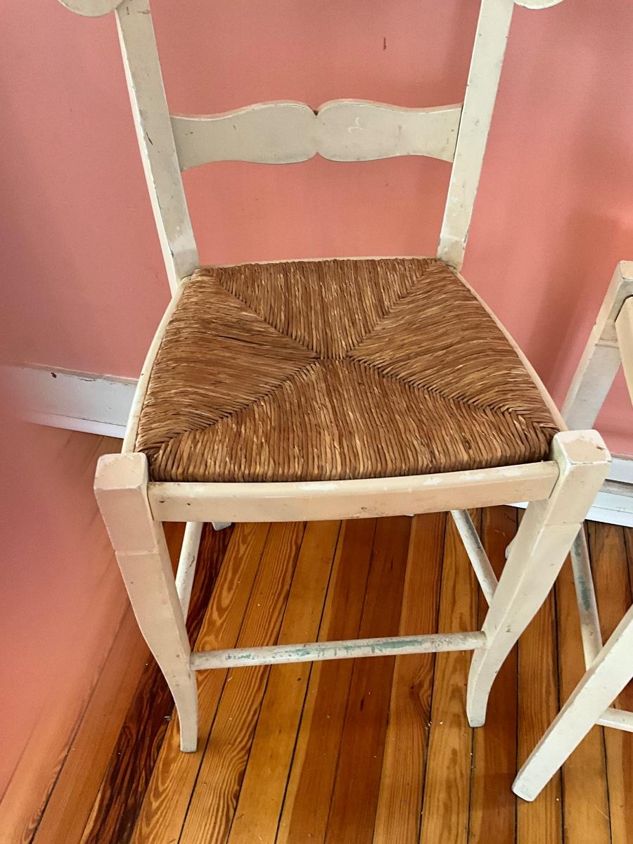 Wicker seats, white paint, they need TLC-repaint, etc... solid construction. 39"H x 17.5" W x 15"D-seat height 24"