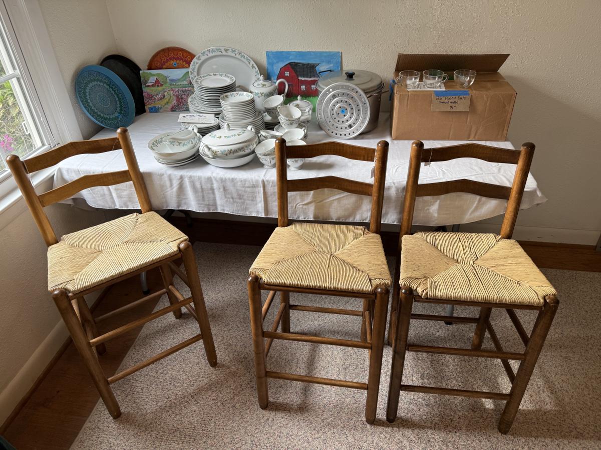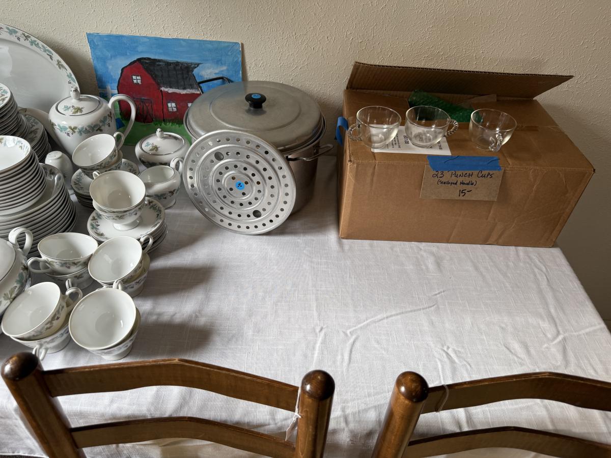 3 bar stools, china set, art, tin trays, pot, punch cups