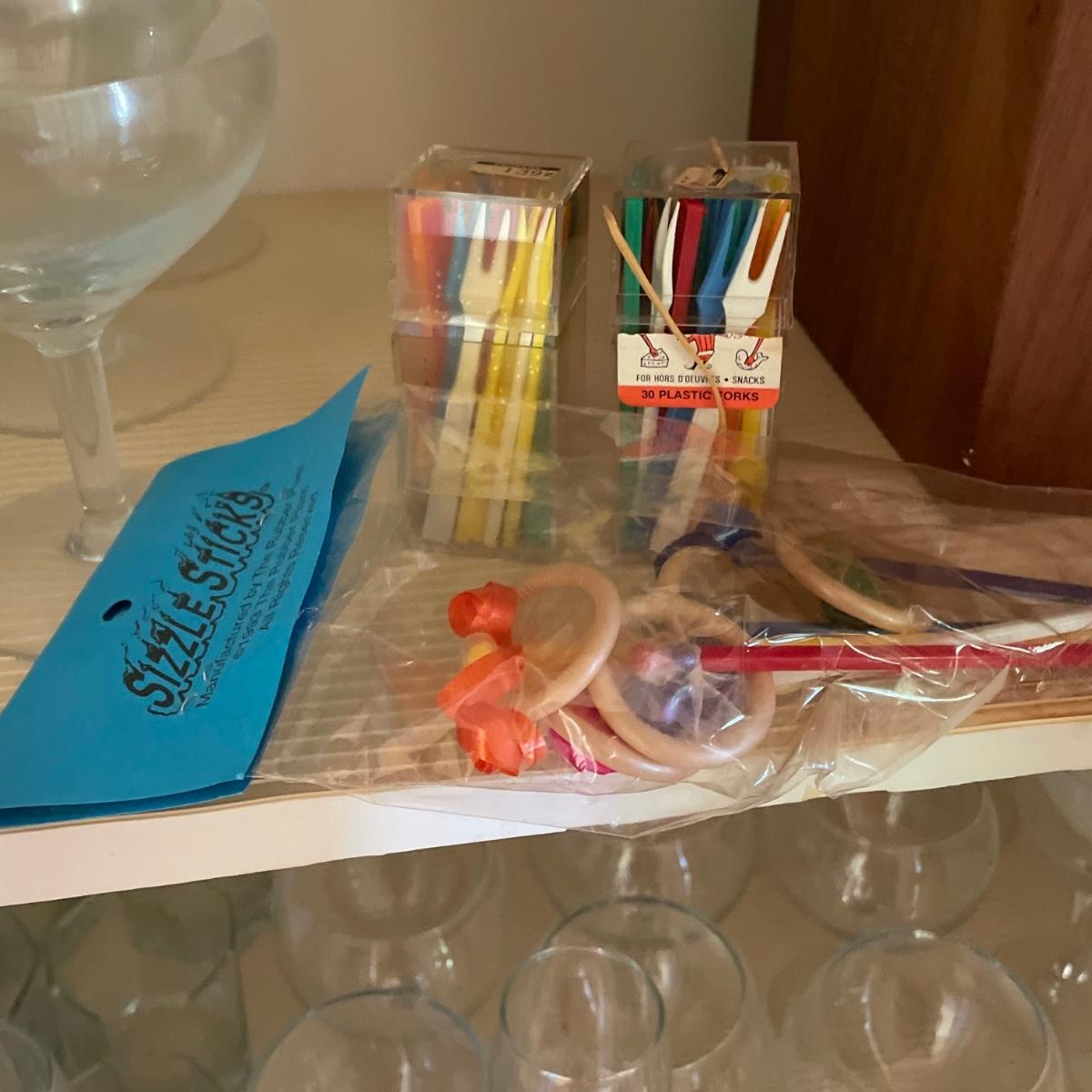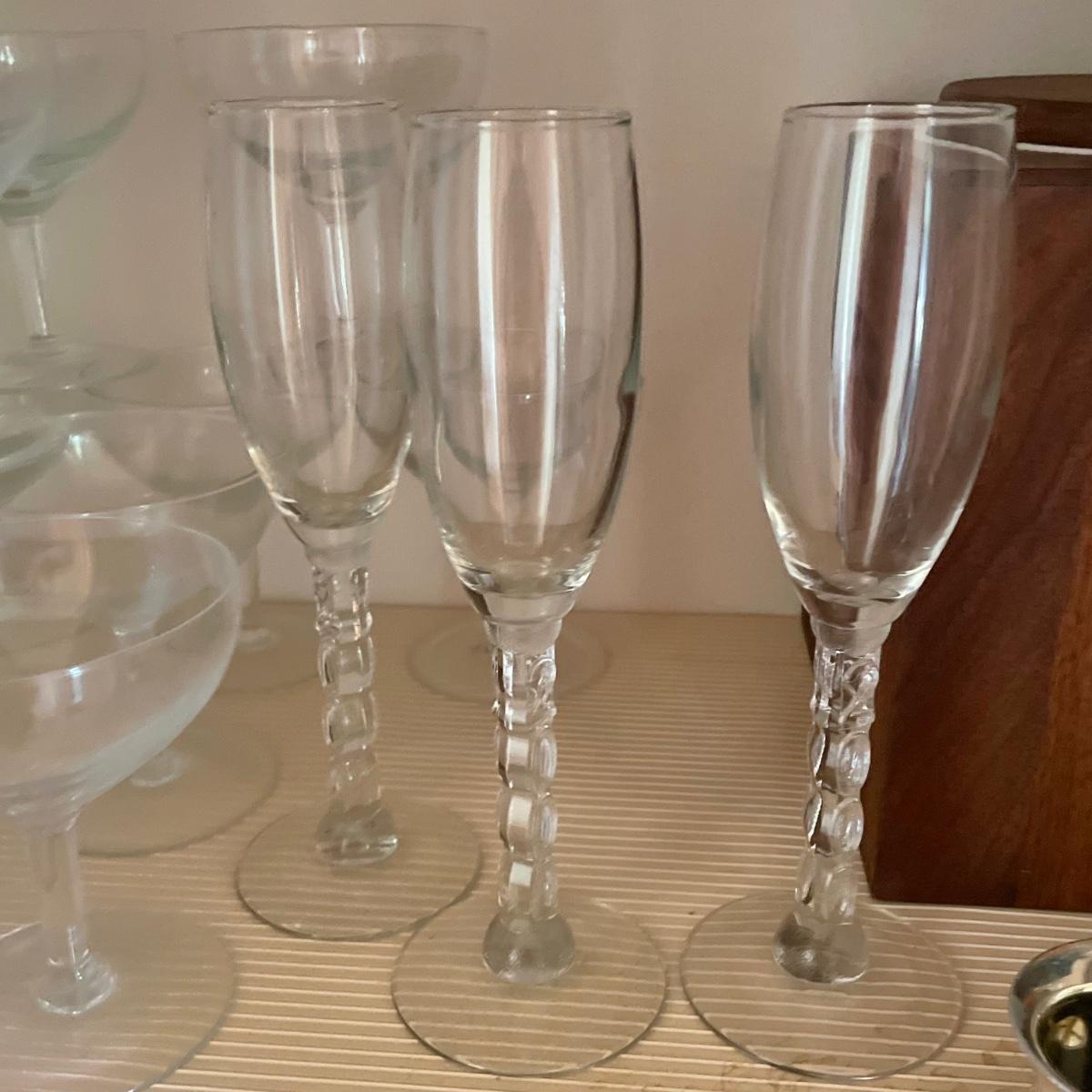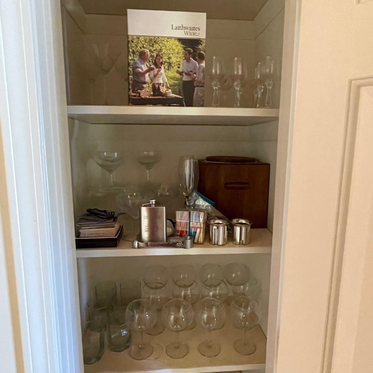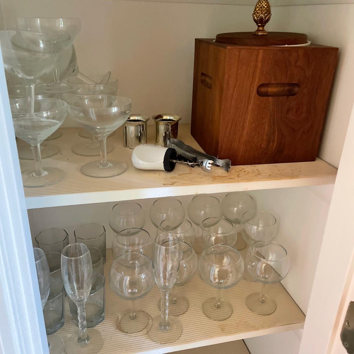 This great lot includes Morgan Industries Buckete Brigade teak wood ice bucket with a removable plastic bucket insert (measures 8” x 8” x 8”), corkscrew, stainless steel flask, coasters and a large amount of glasses that includes tumblers, champagne flutes and coupes, wine, martini and more.