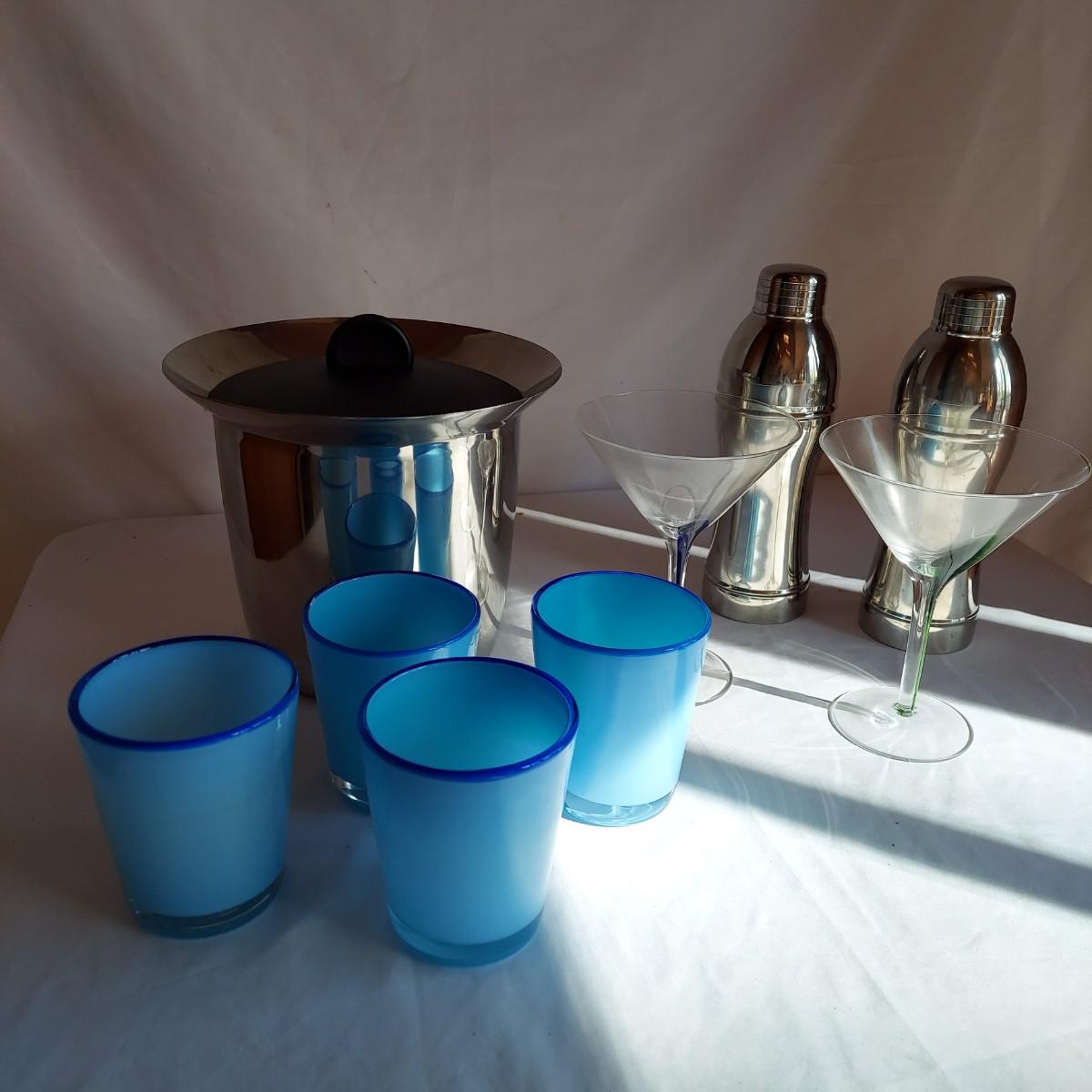 This lot includes multiple bar access and two sets of glasses. There is a metal ice bucket with scoop and lid. There are two metal three piece cocktail shakers. Also included are two martini glasses and four blue hi ball glasses. Shipping available. Shipping can be costly. We suggest contacting our preferred local shipping provider, Postage Express, with dimensions and getting an estimate before bidding: (828) 670-5501or postageexpress@yahoo.com.
