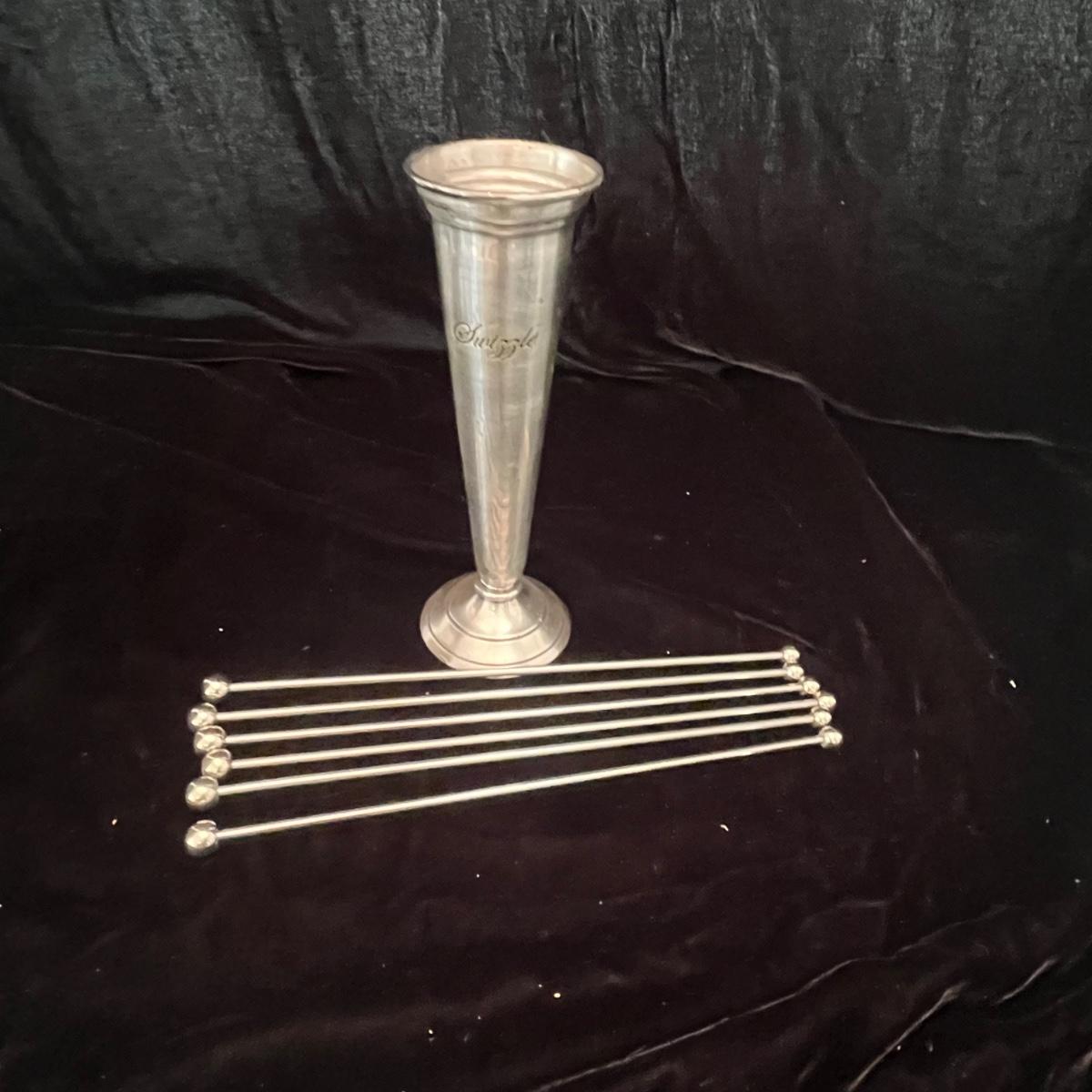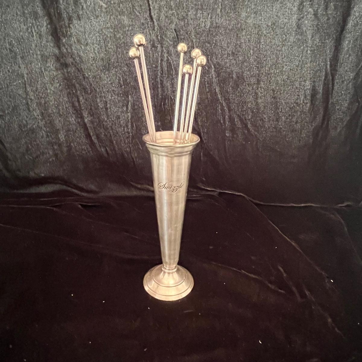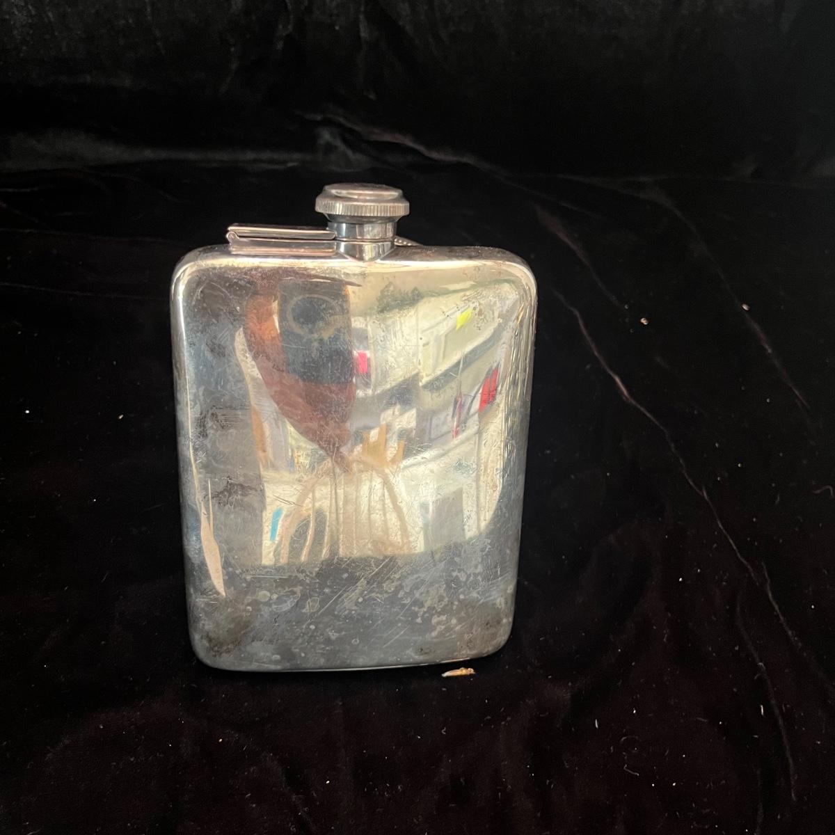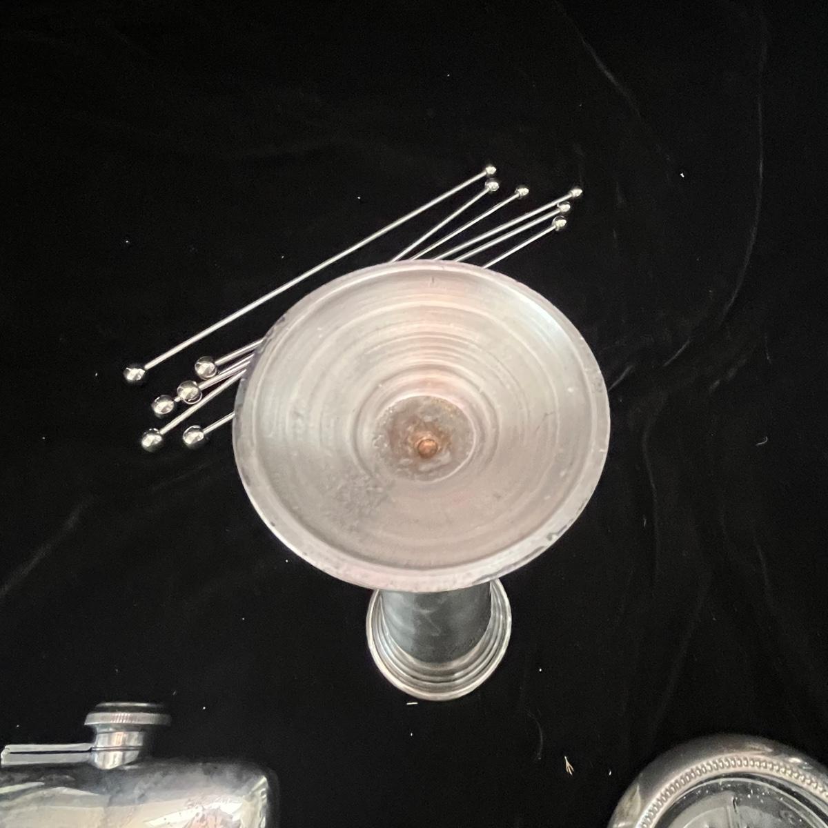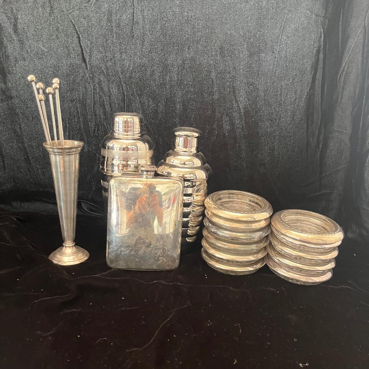 Lot includes a 1/2 pint flask marked “˜Sterling’, two stainless steel shakers, ten glass and silver coasters and six swizzle sticks in a metal holder. Two sets of four coasters, one set marked silver plate, the other set marked Leonard silver plate. Set of two coasters are not marked, and one single coaster is marked Sterling. Flask has a split on side, see pictures. Flask measures 4” x 1” x 6”.
