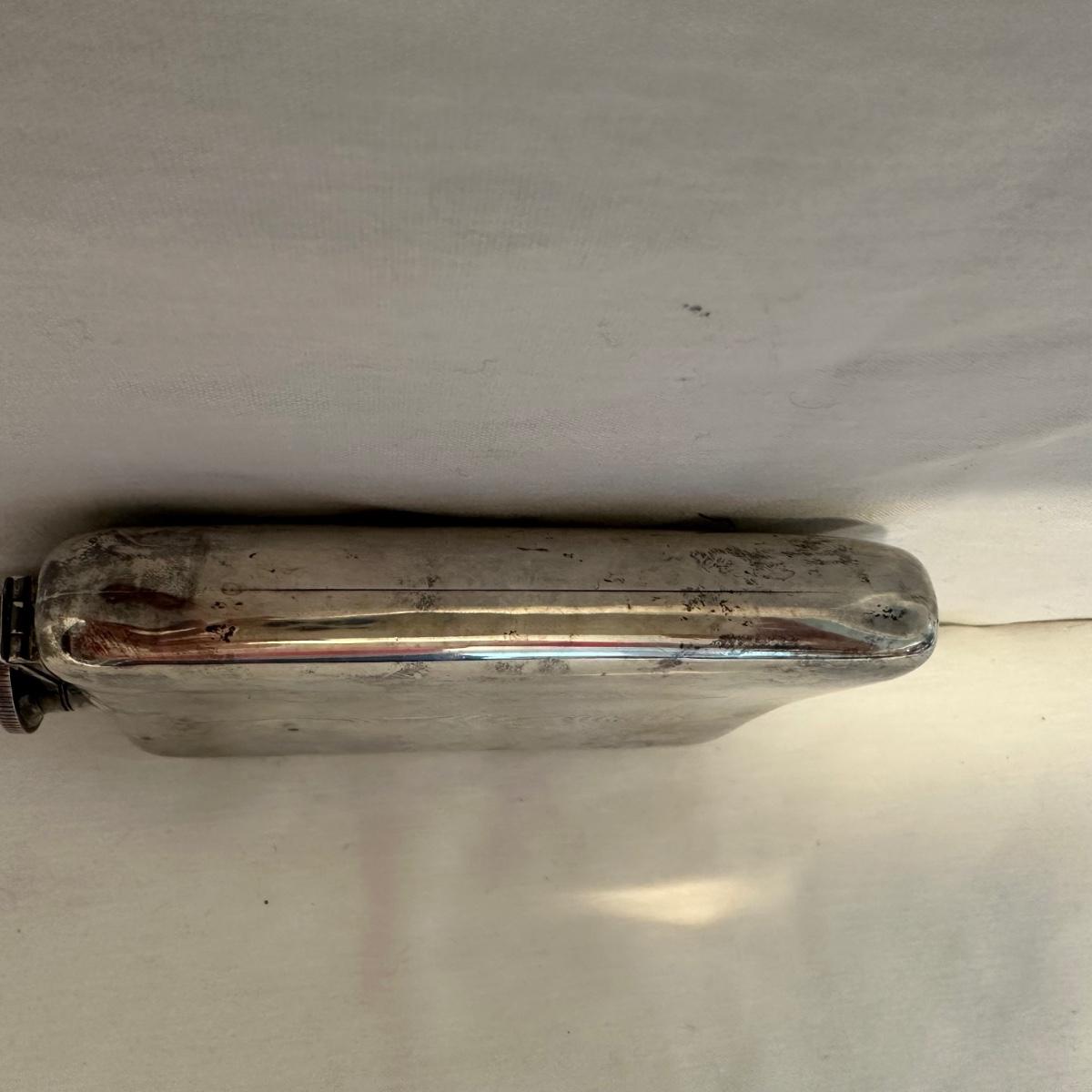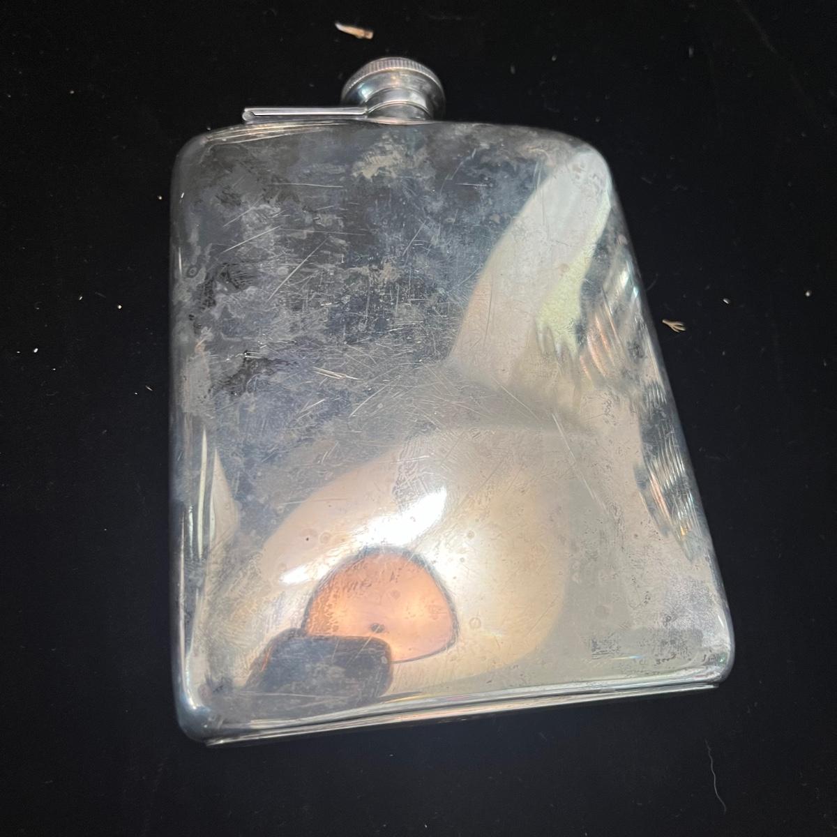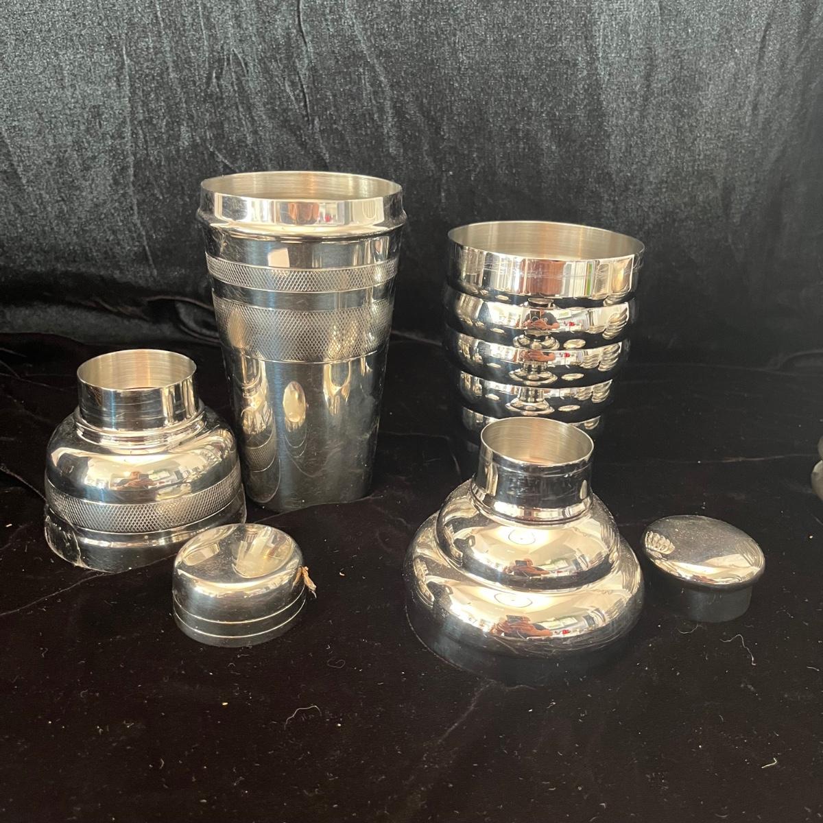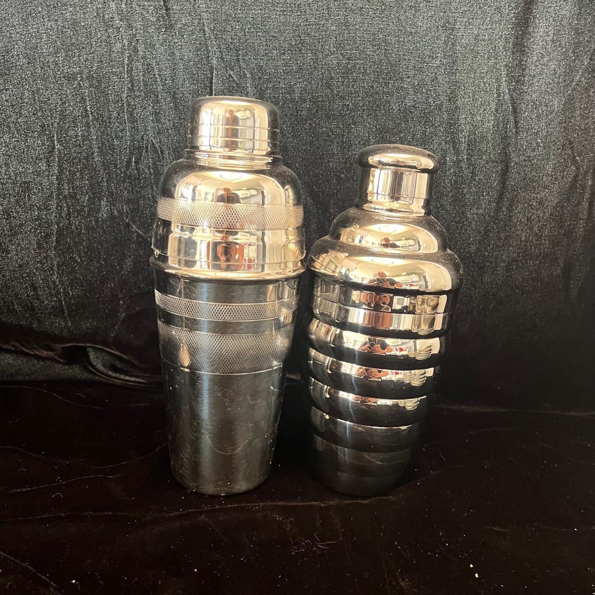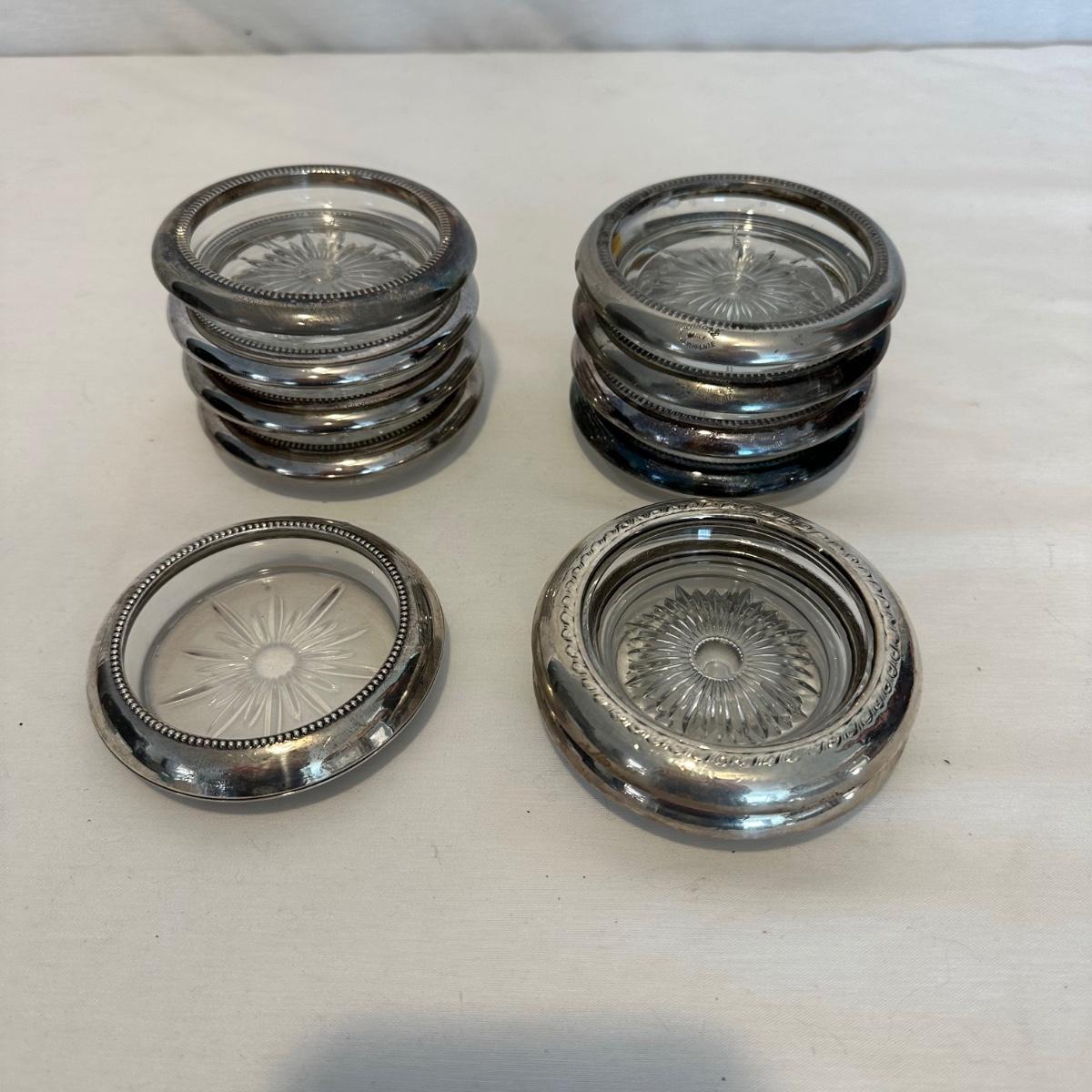 Lot includes a 1/2 pint flask marked “˜Sterling’, two stainless steel shakers, ten glass and silver coasters and six swizzle sticks in a metal holder. Two sets of four coasters, one set marked silver plate, the other set marked Leonard silver plate. Set of two coasters are not marked, and one single coaster is marked Sterling. Flask has a split on side, see pictures. Flask measures 4” x 1” x 6”.