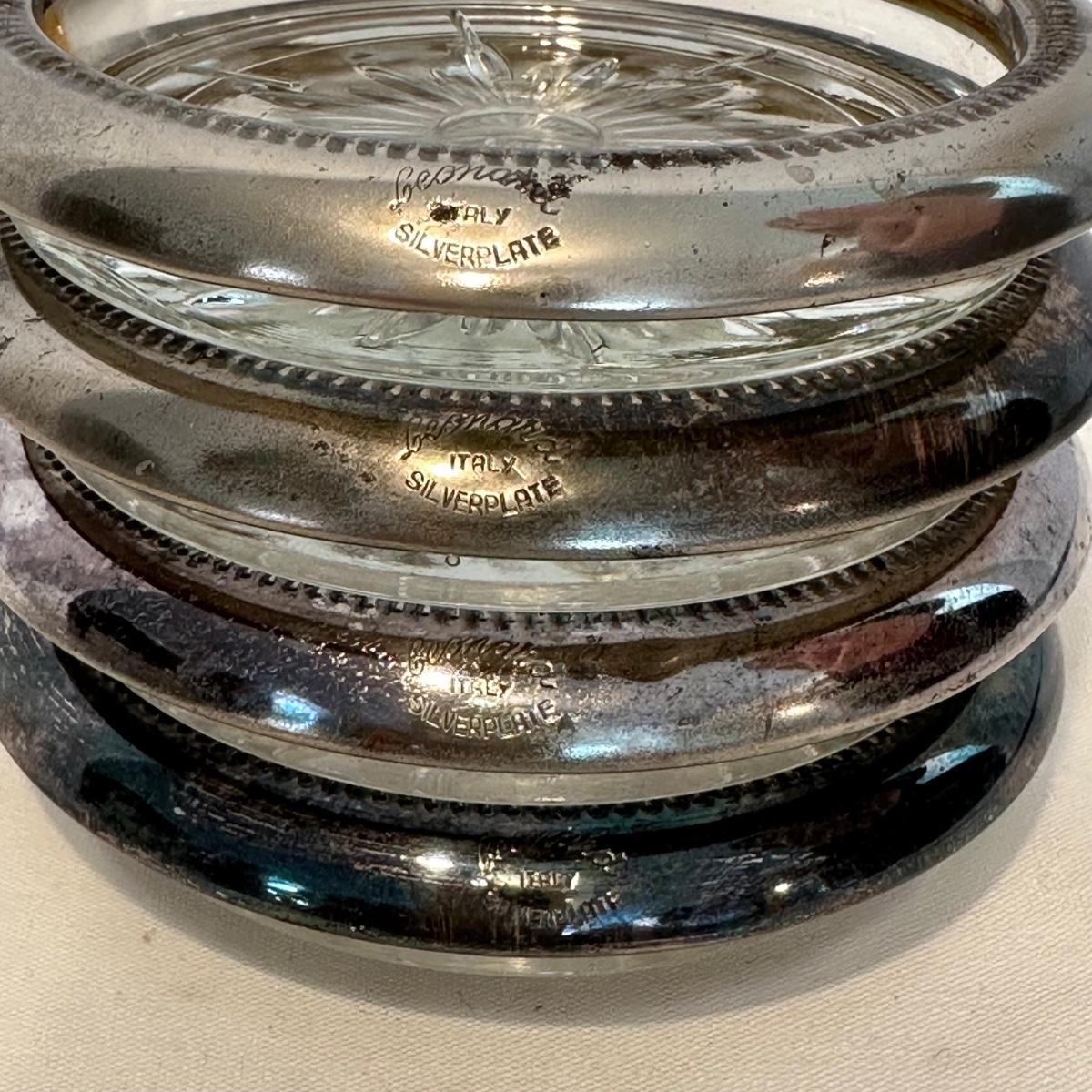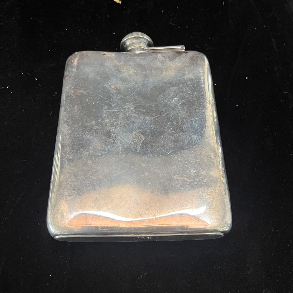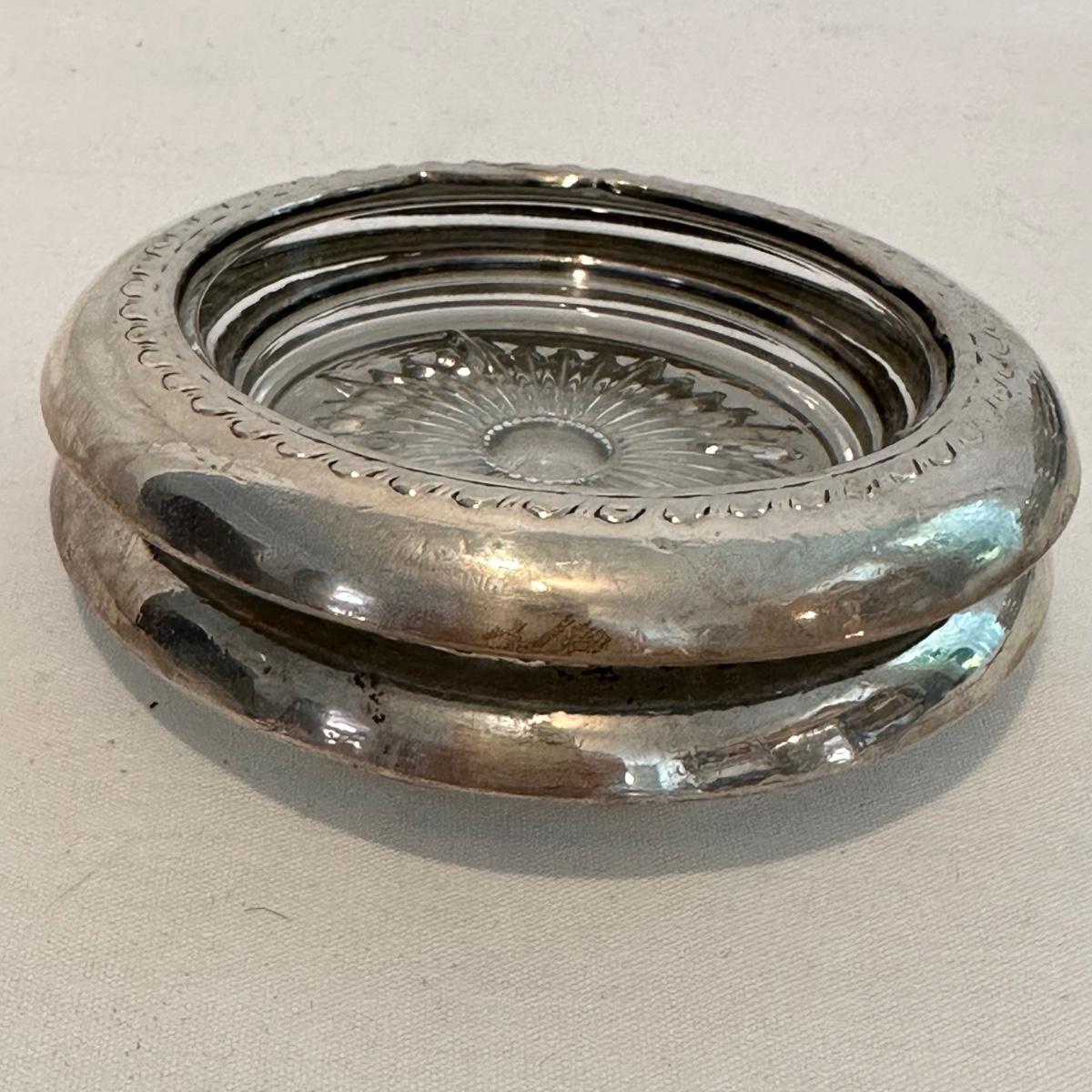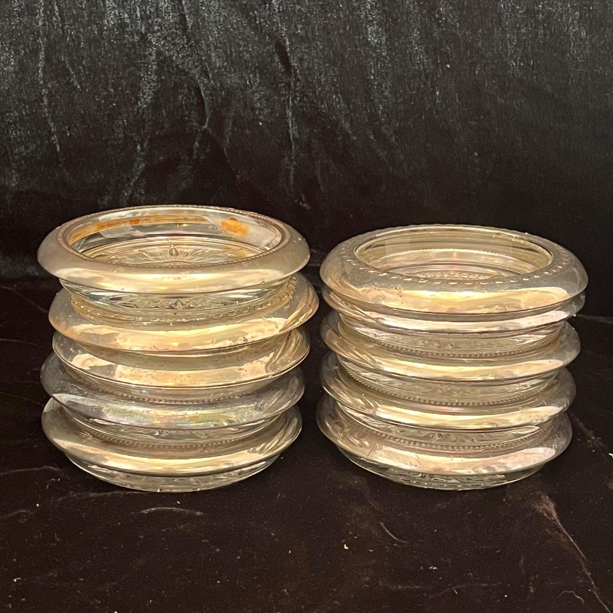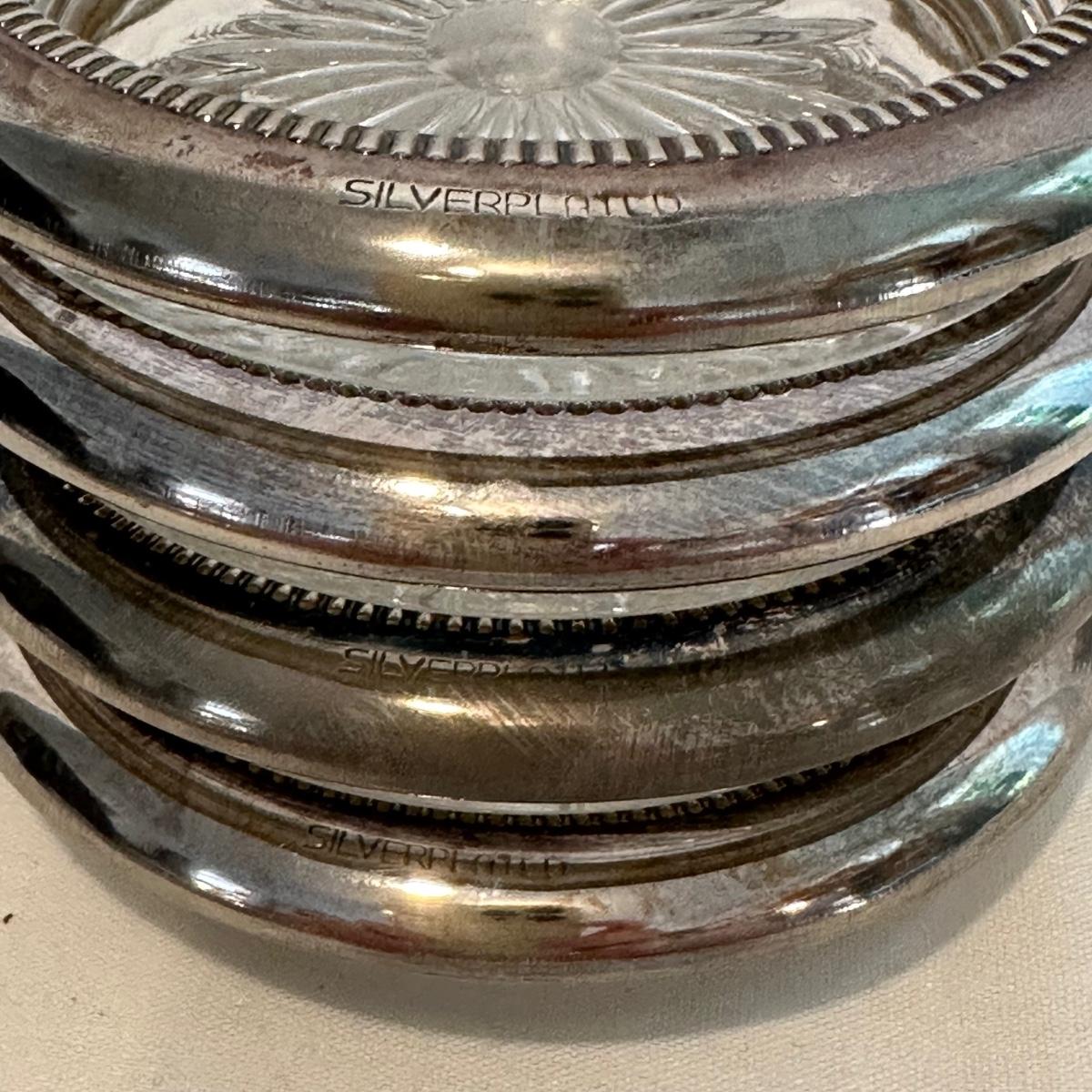 Lot includes a 1/2 pint flask marked “˜Sterling’, two stainless steel shakers, ten glass and silver coasters and six swizzle sticks in a metal holder. Two sets of four coasters, one set marked silver plate, the other set marked Leonard silver plate. Set of two coasters are not marked, and one single coaster is marked Sterling. Flask has a split on side, see pictures. Flask measures 4” x 1” x 6”.