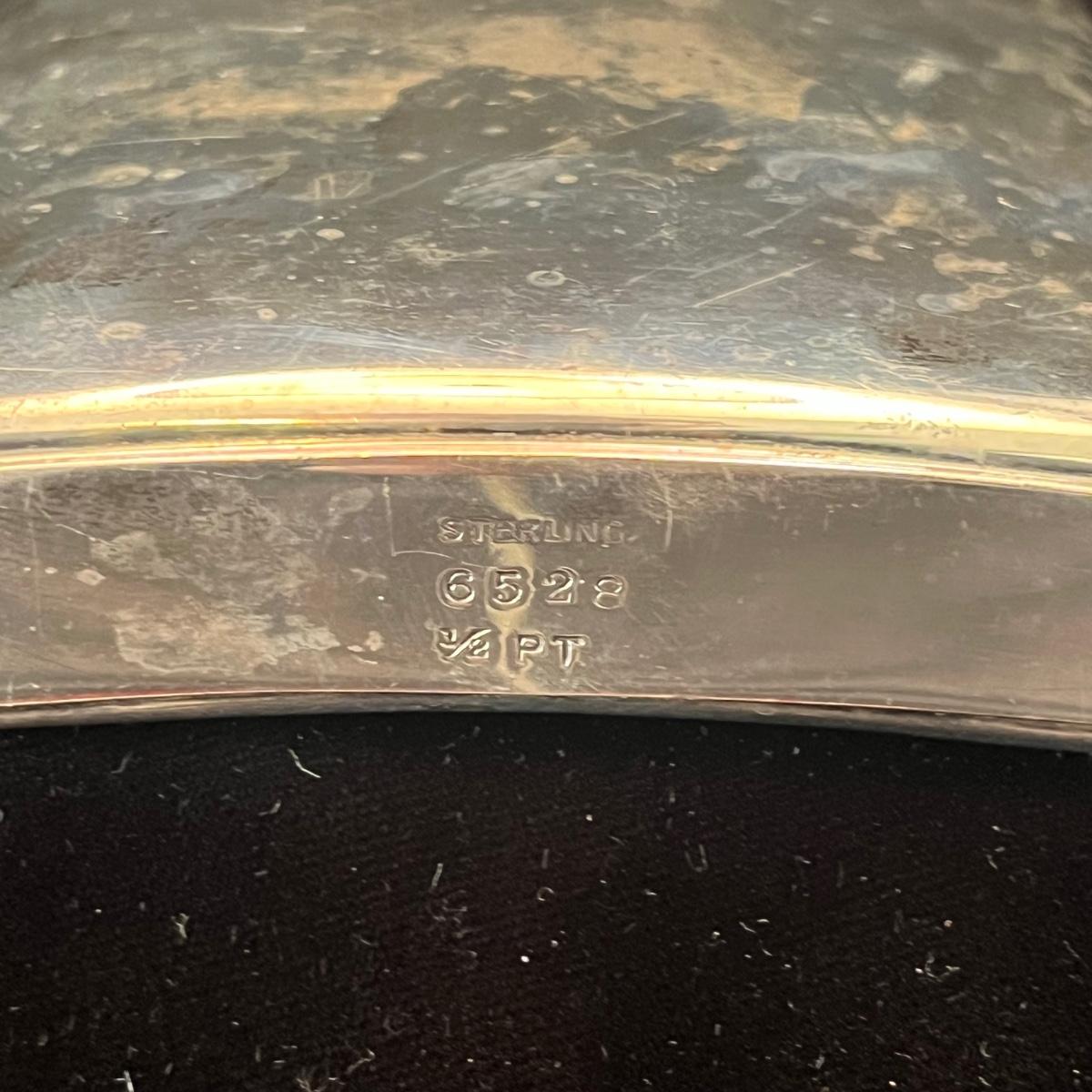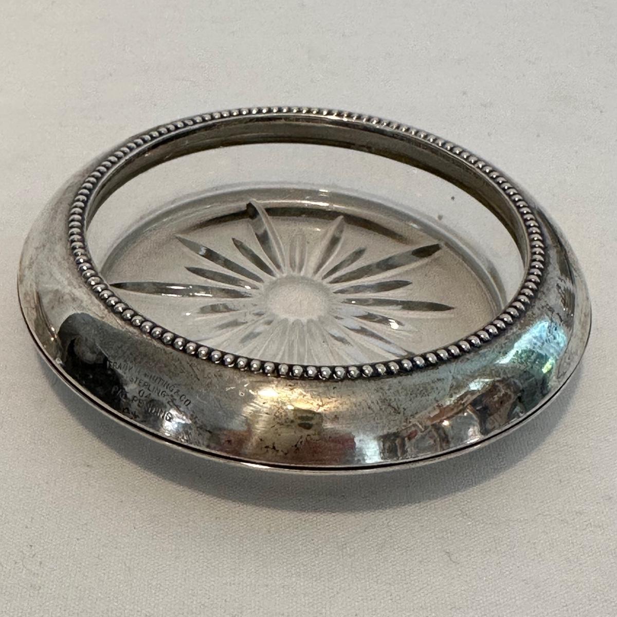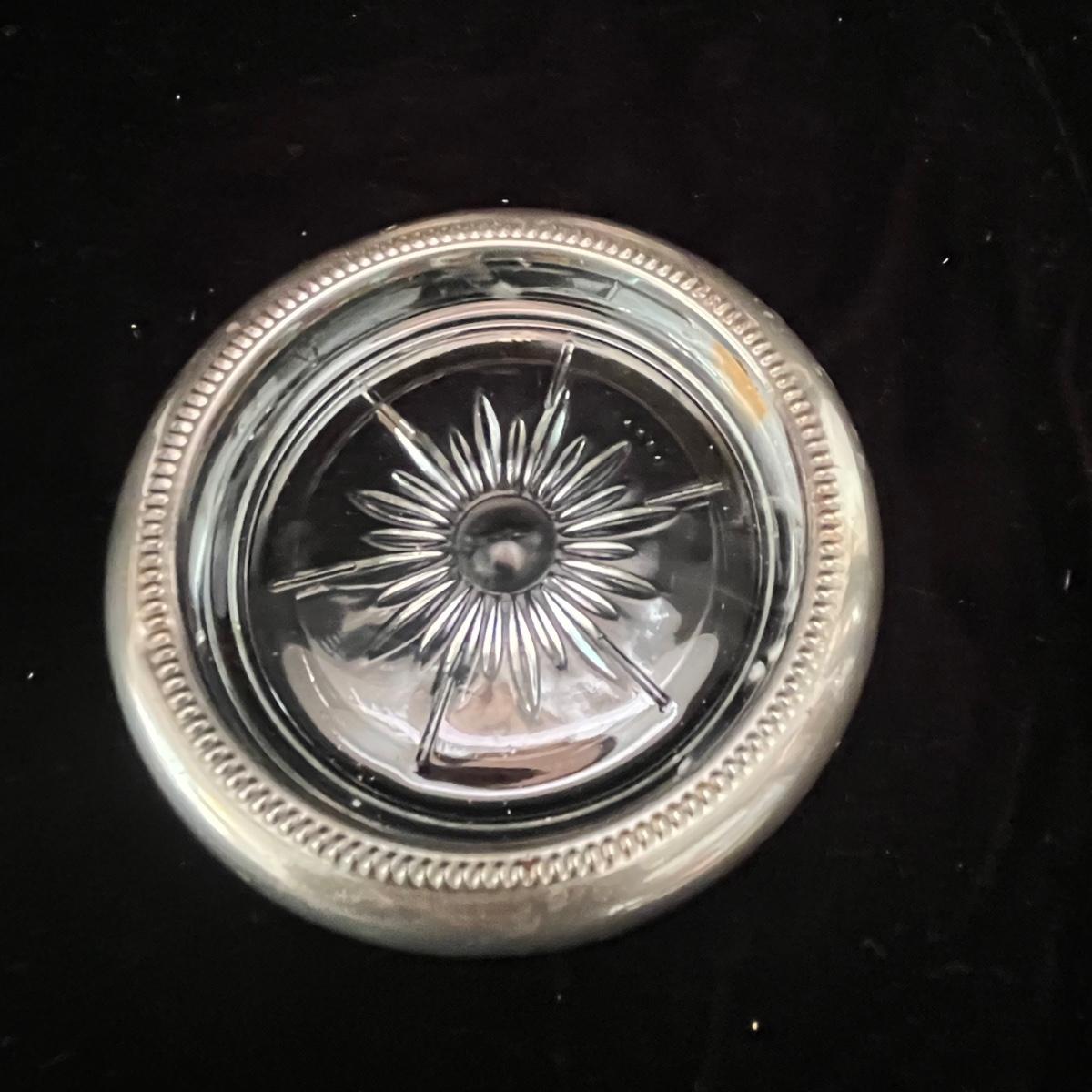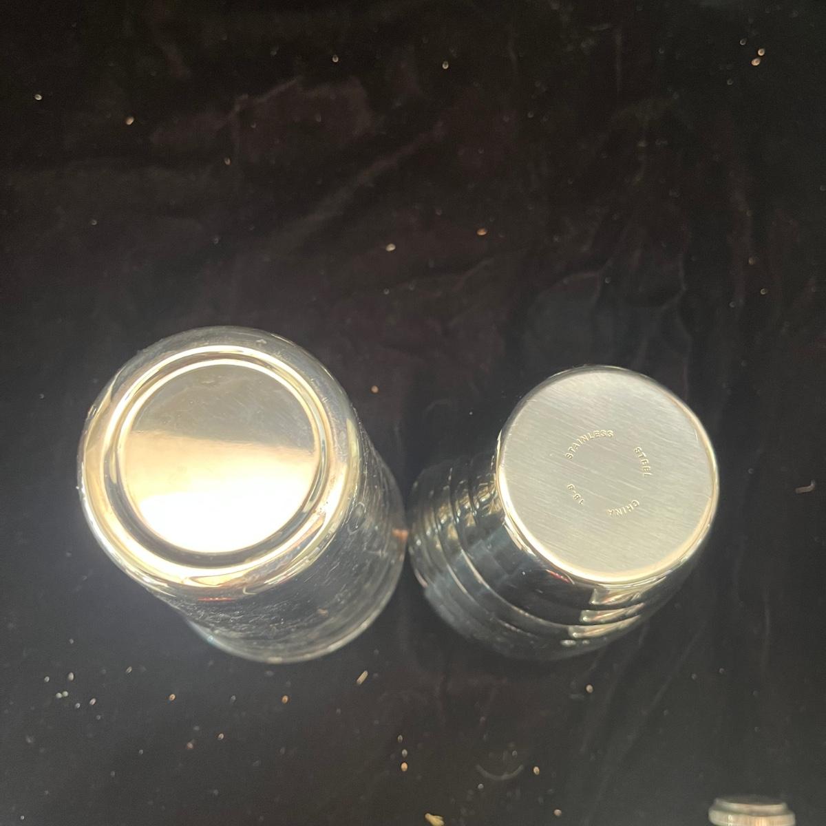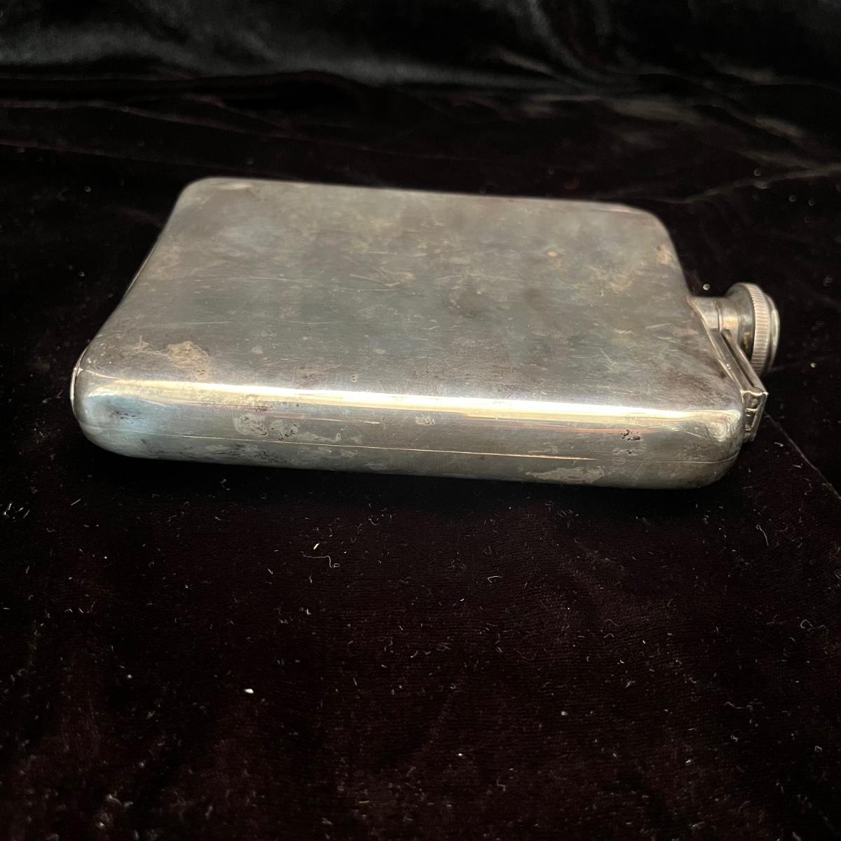 Lot includes a 1/2 pint flask marked “˜Sterling’, two stainless steel shakers, ten glass and silver coasters and six swizzle sticks in a metal holder. Two sets of four coasters, one set marked silver plate, the other set marked Leonard silver plate. Set of two coasters are not marked, and one single coaster is marked Sterling. Flask has a split on side, see pictures. Flask measures 4” x 1” x 6”.