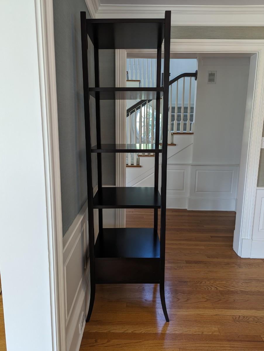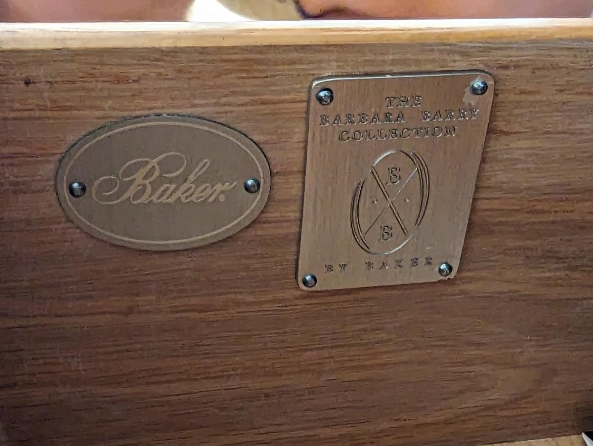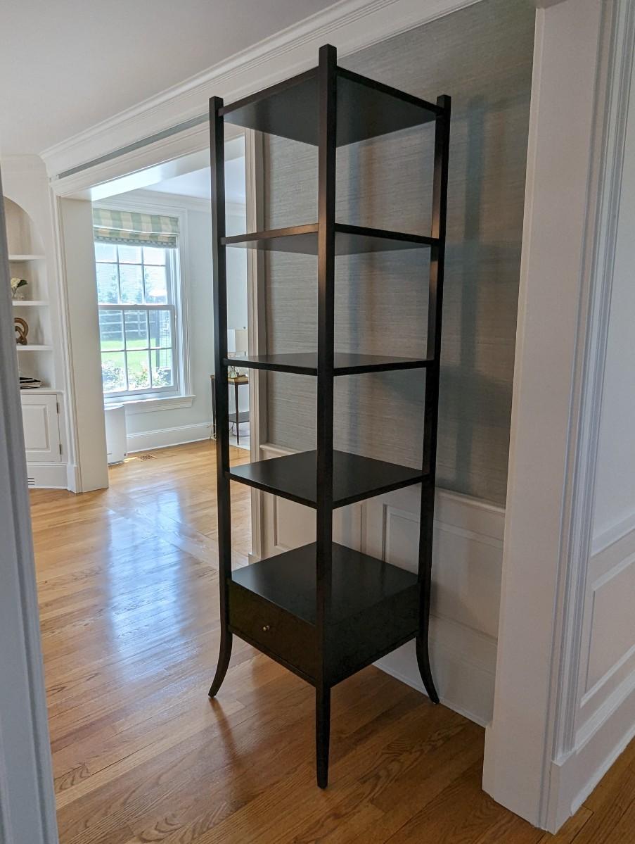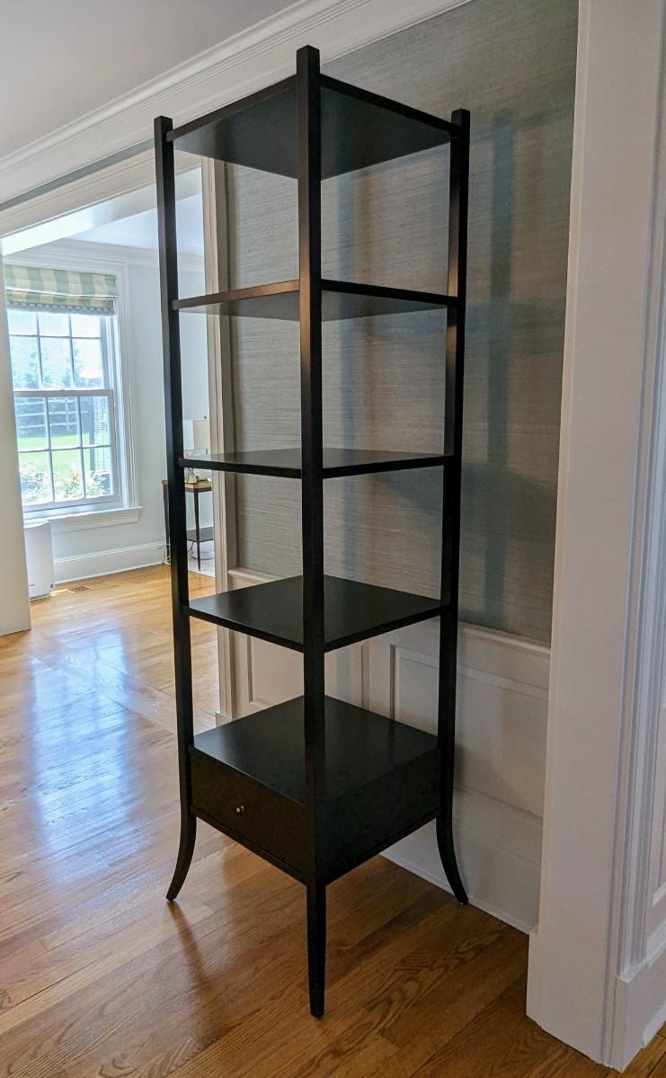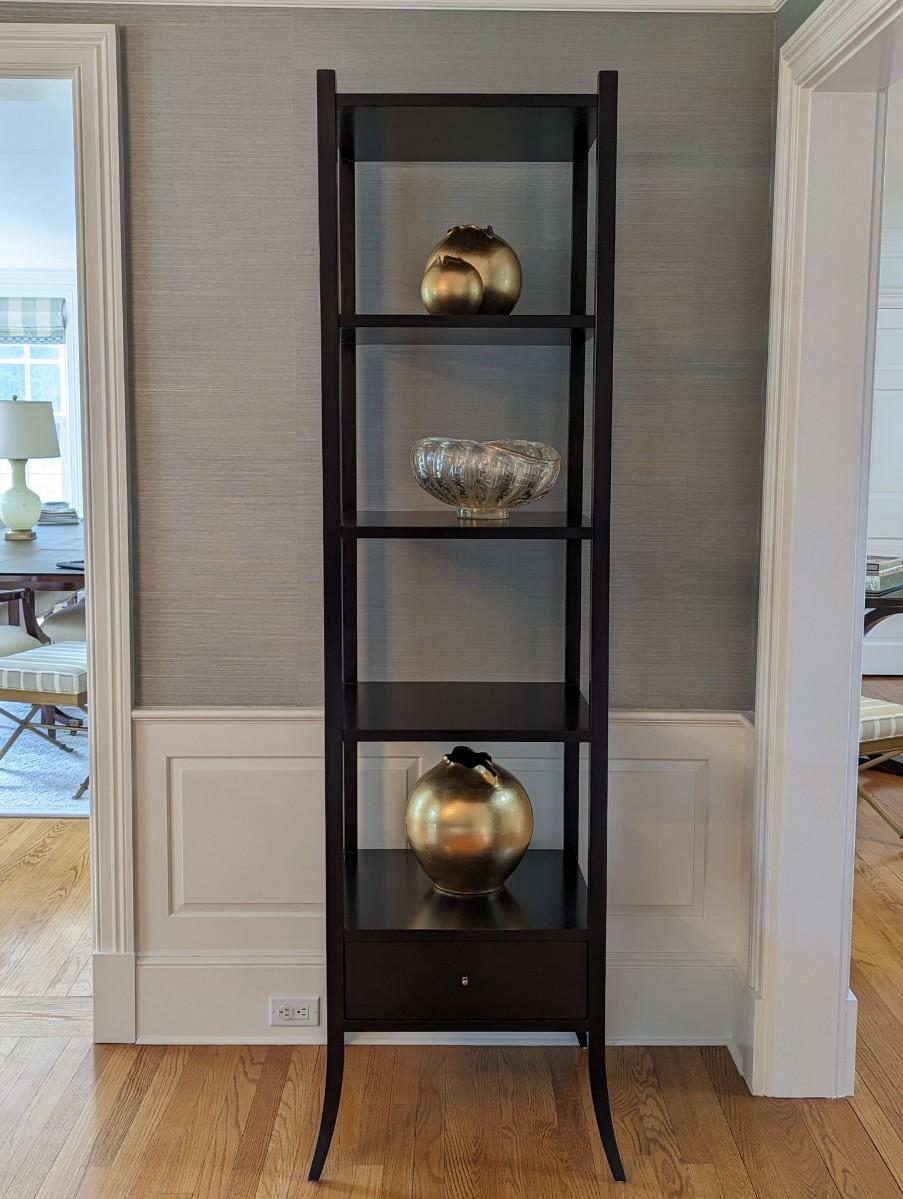 A beautiful impressive tall etagere by Barbara Barry for Baker Furniture. Finish is a dark rich mahogany with five tiers including top and a lower dovetailed drawer for storage. Features unique splayed legs and a faceted glass knob on the drawer. Maker's plaque intact.