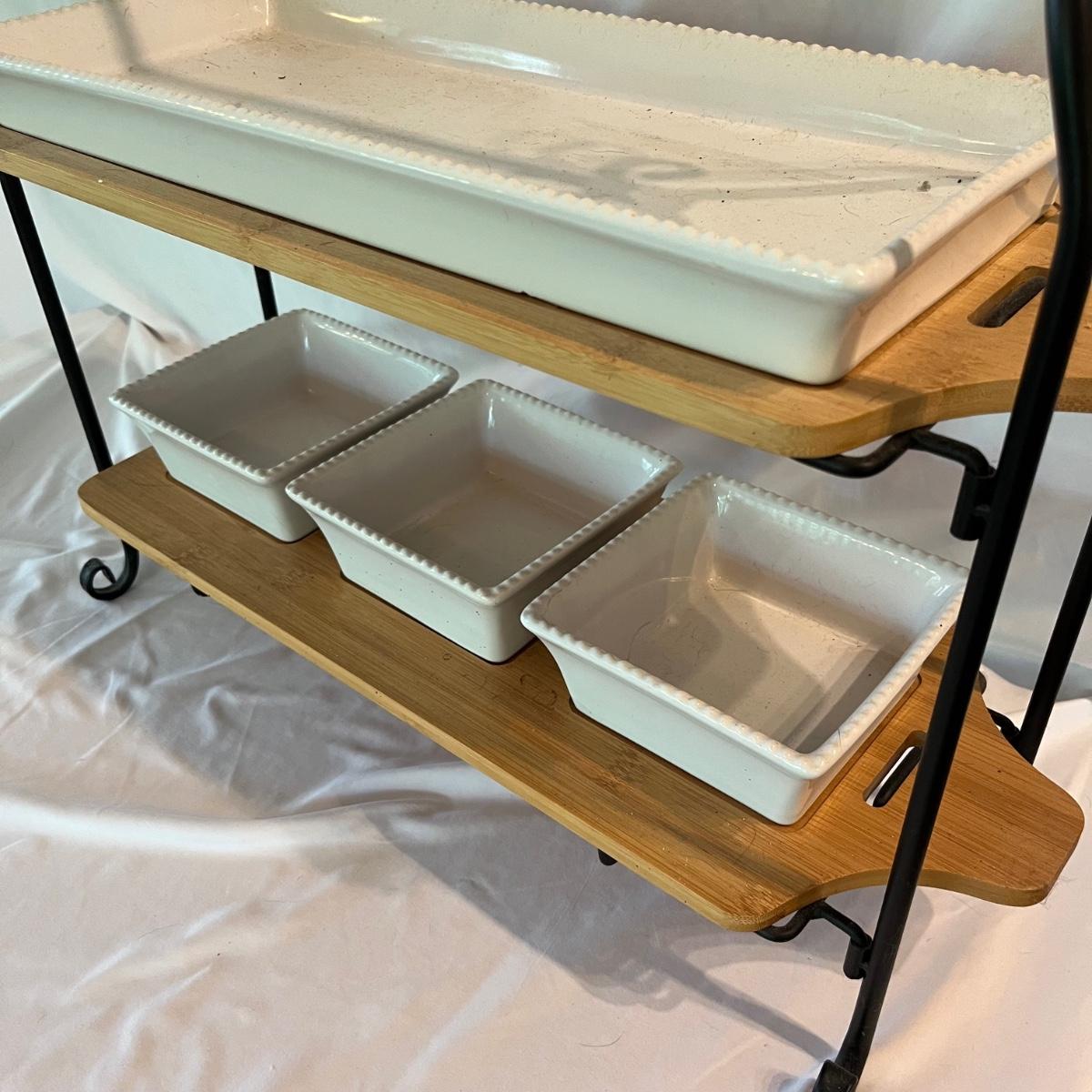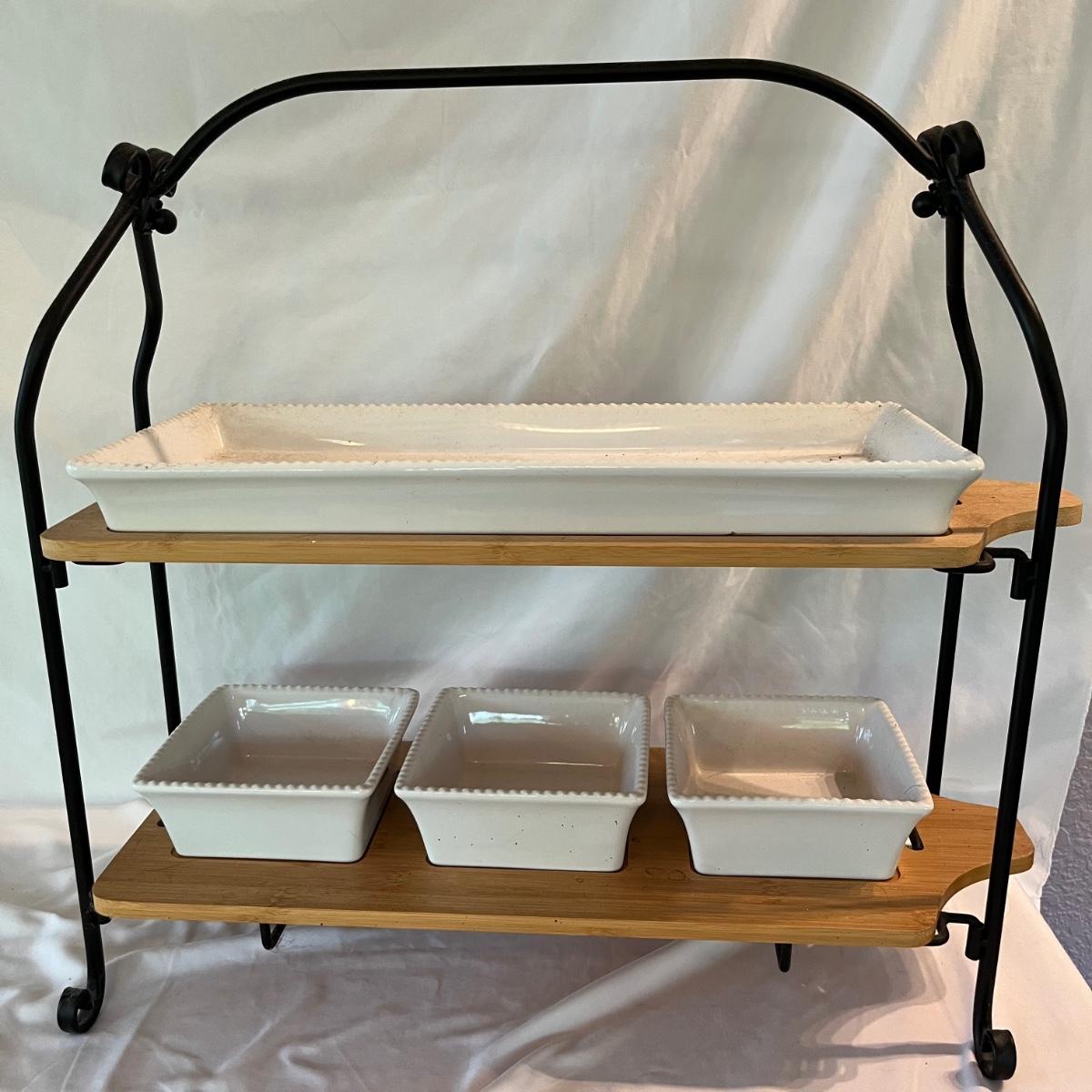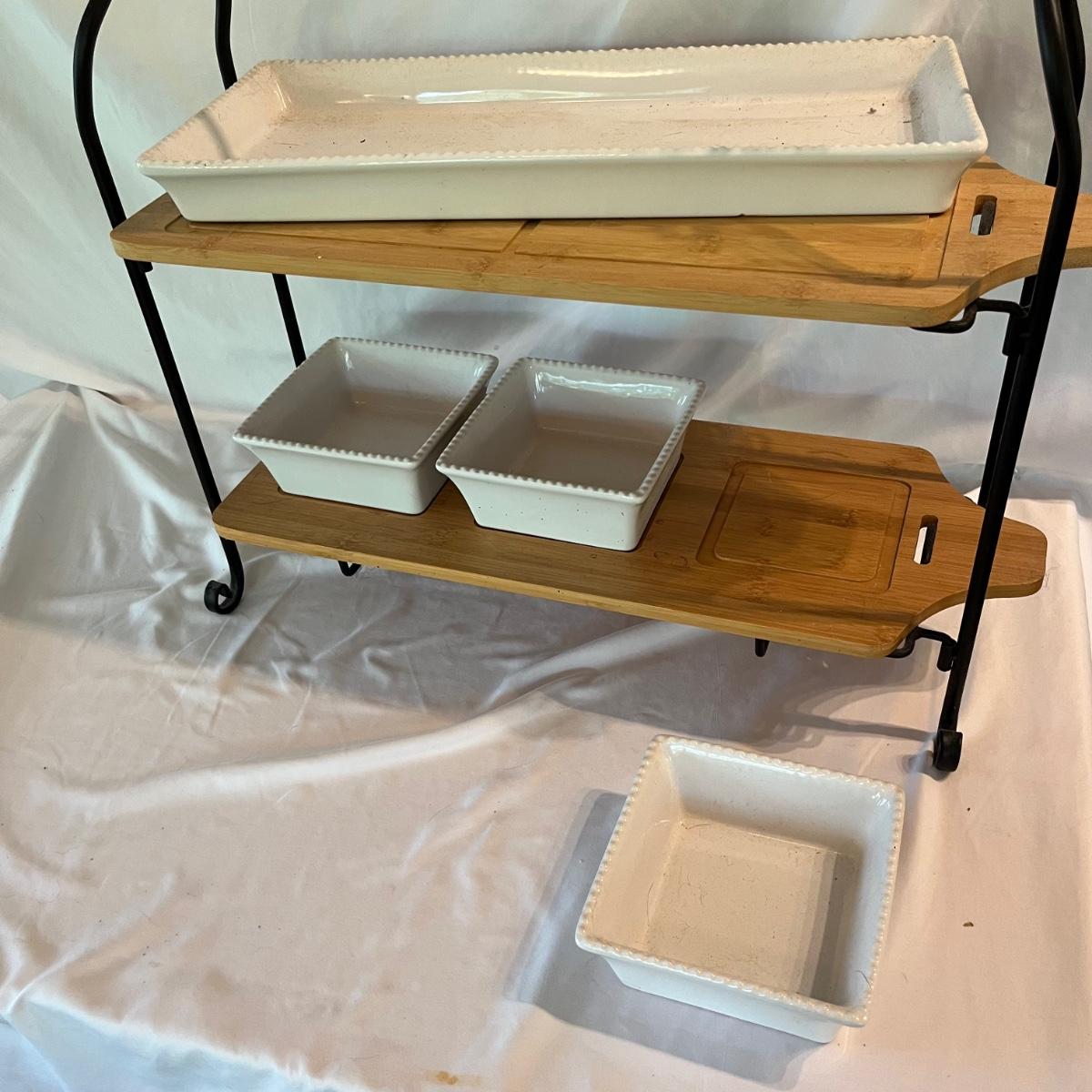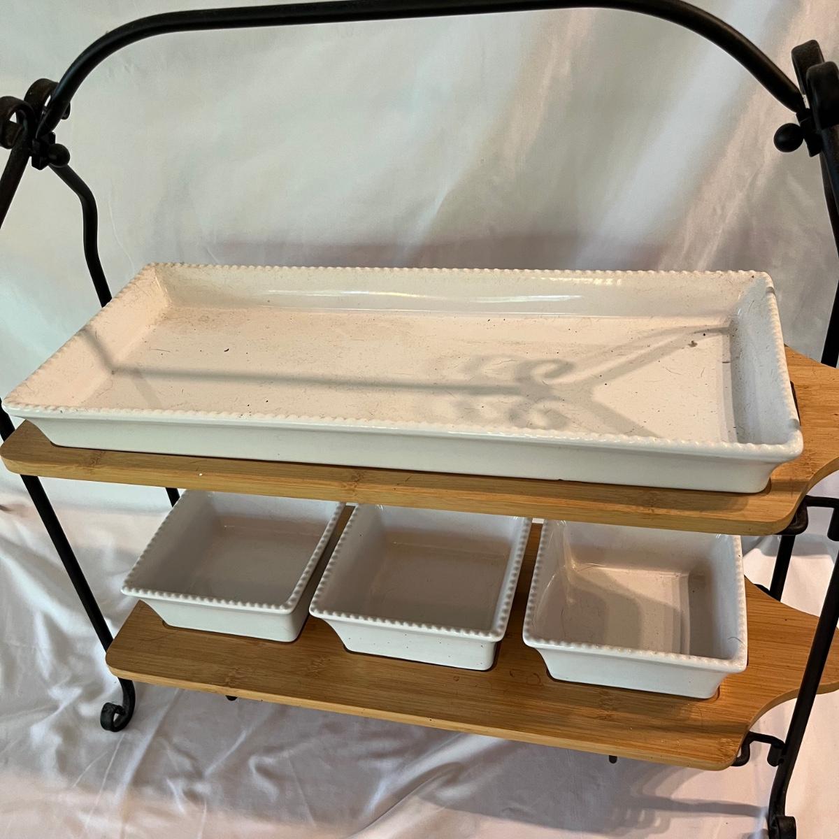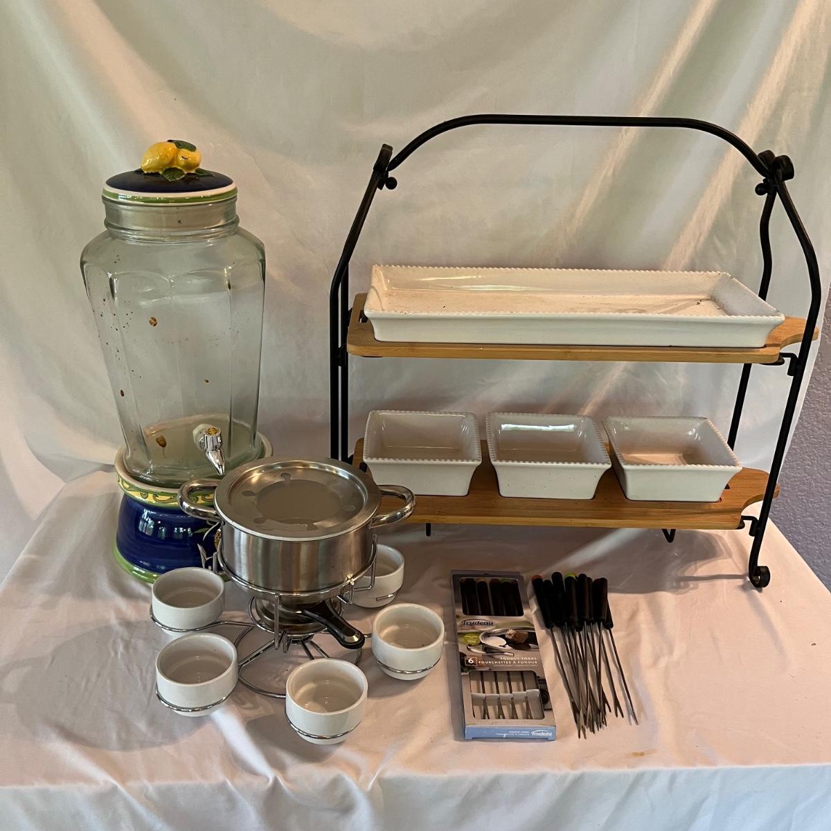 This lot includes one ceramic and glass lemonade jug, one fondue set with fondue forks, and one large serving rack with ceramic dishes. The lemonade jug has some stains on the glass (see photos). The serving rack has removable ceramic dishes and removable racks. The serving rack measures about 24” x 10” x 23”H. Local pickup only.