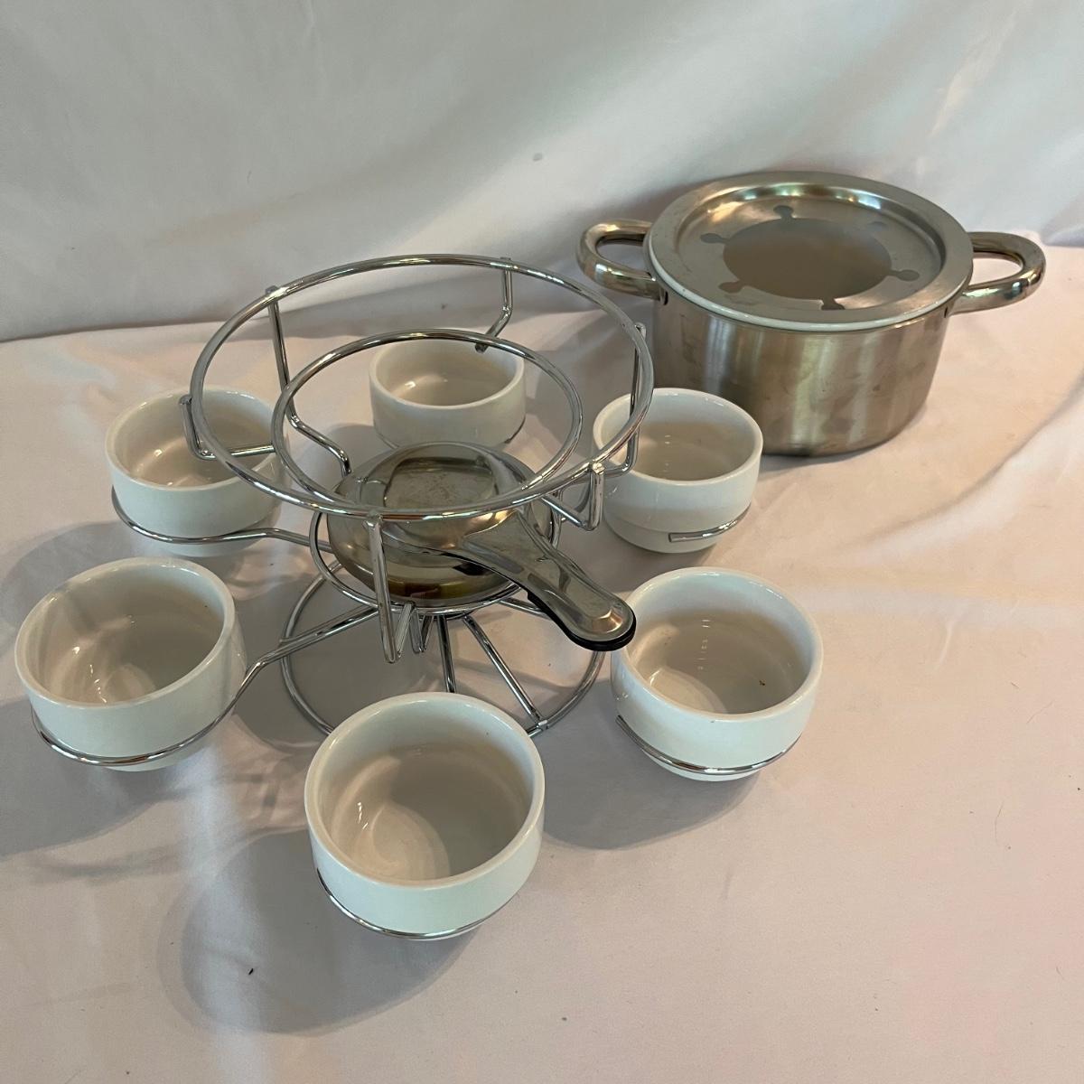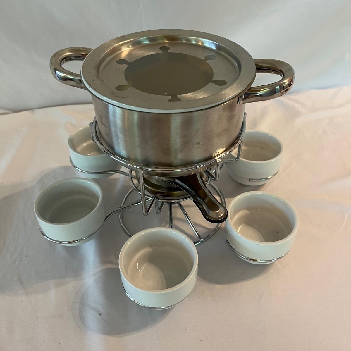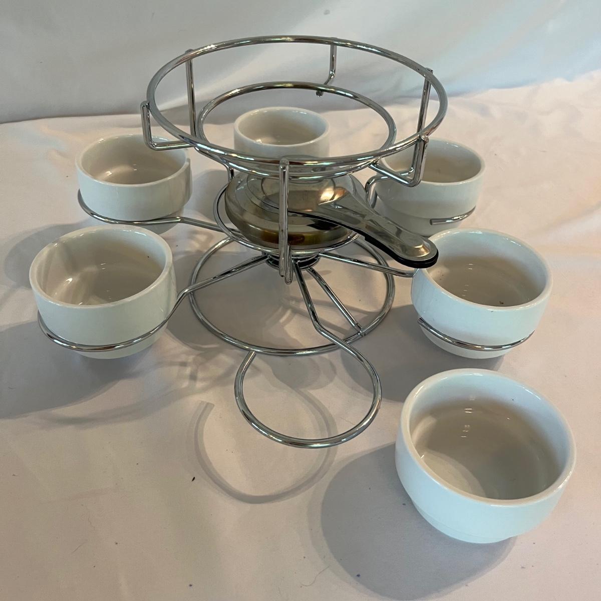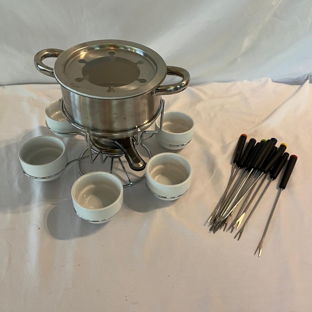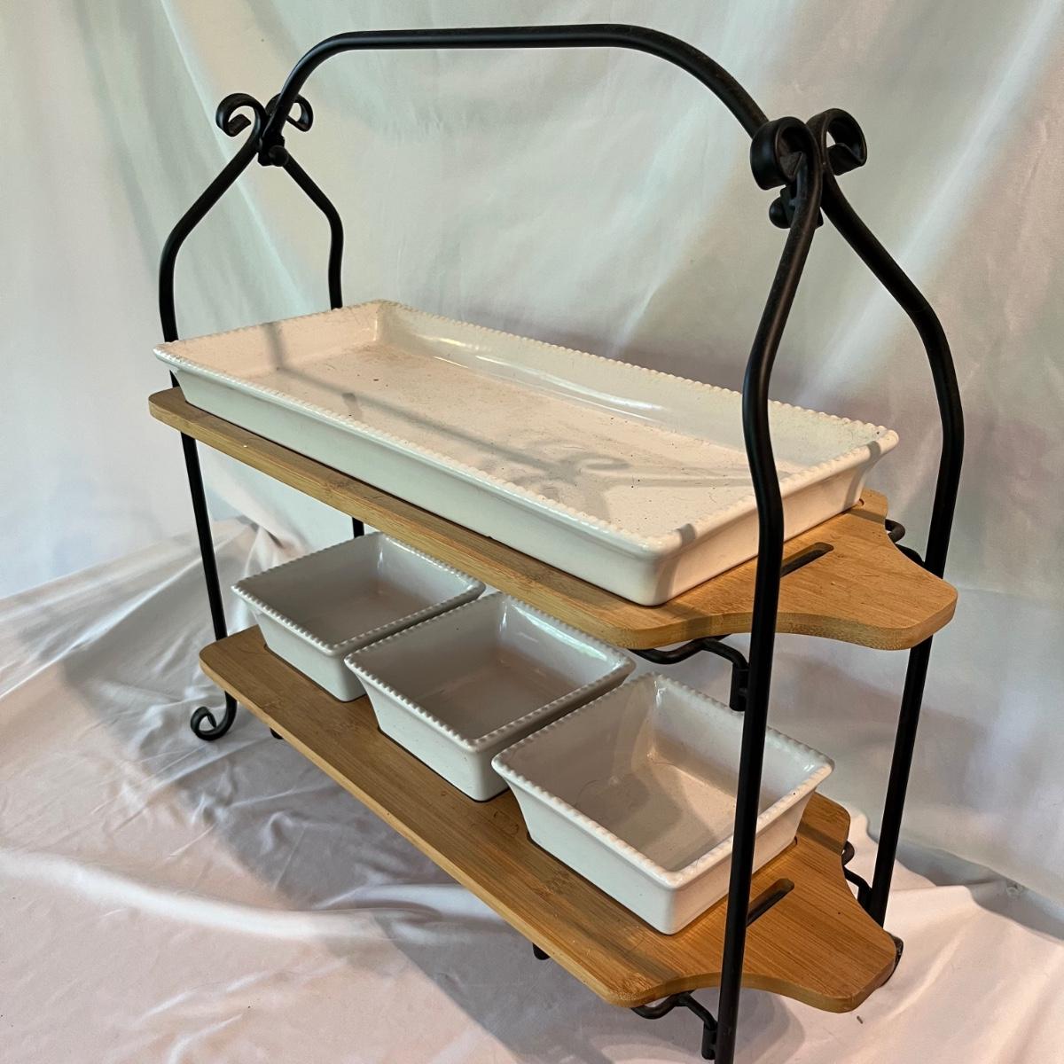 This lot includes one ceramic and glass lemonade jug, one fondue set with fondue forks, and one large serving rack with ceramic dishes. The lemonade jug has some stains on the glass (see photos). The serving rack has removable ceramic dishes and removable racks. The serving rack measures about 24” x 10” x 23”H. Local pickup only.