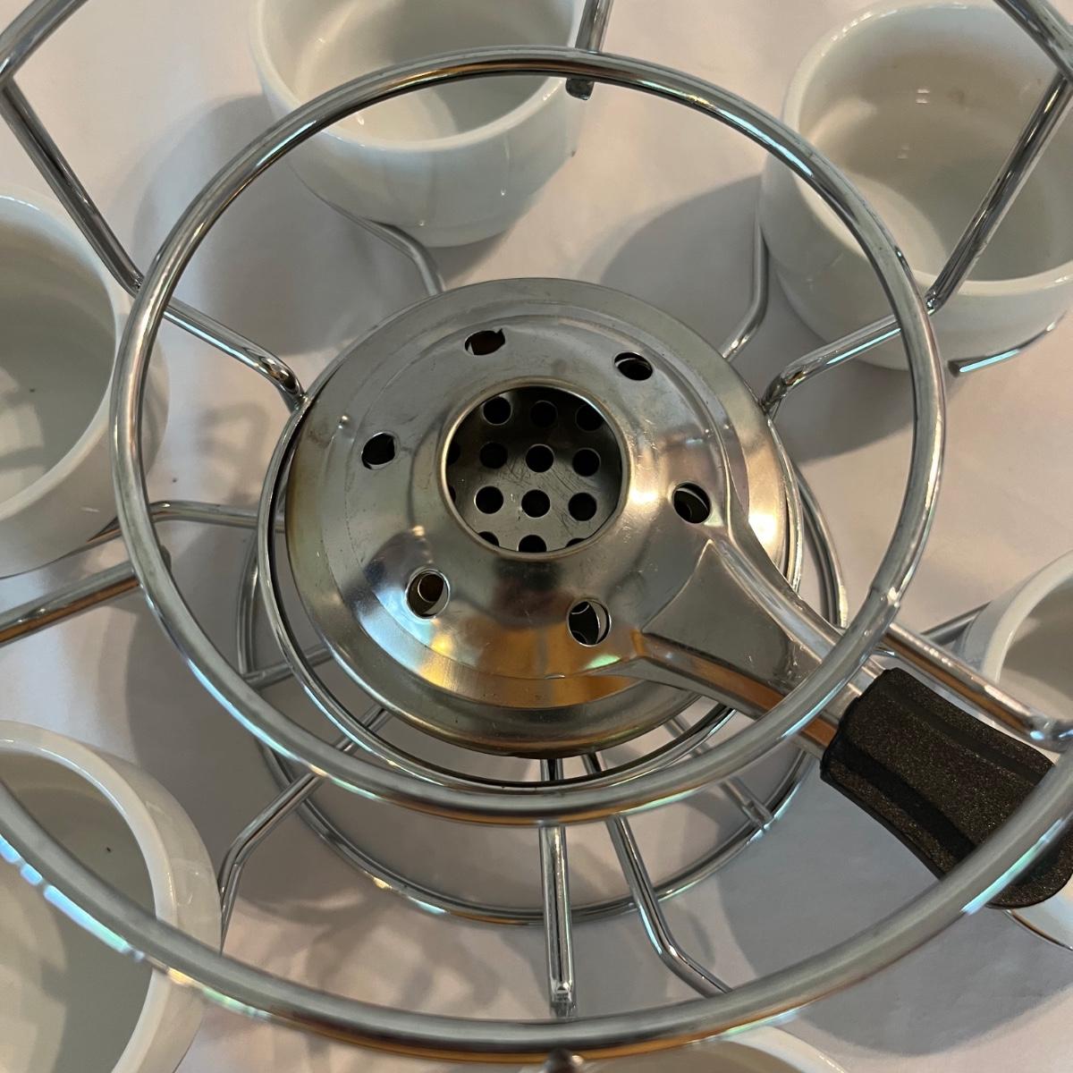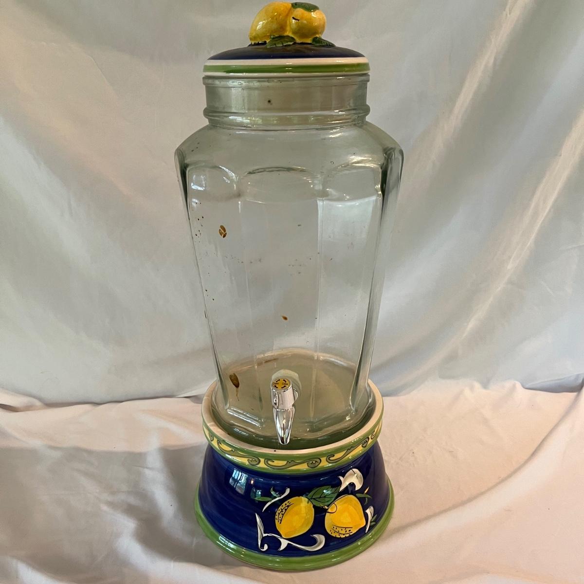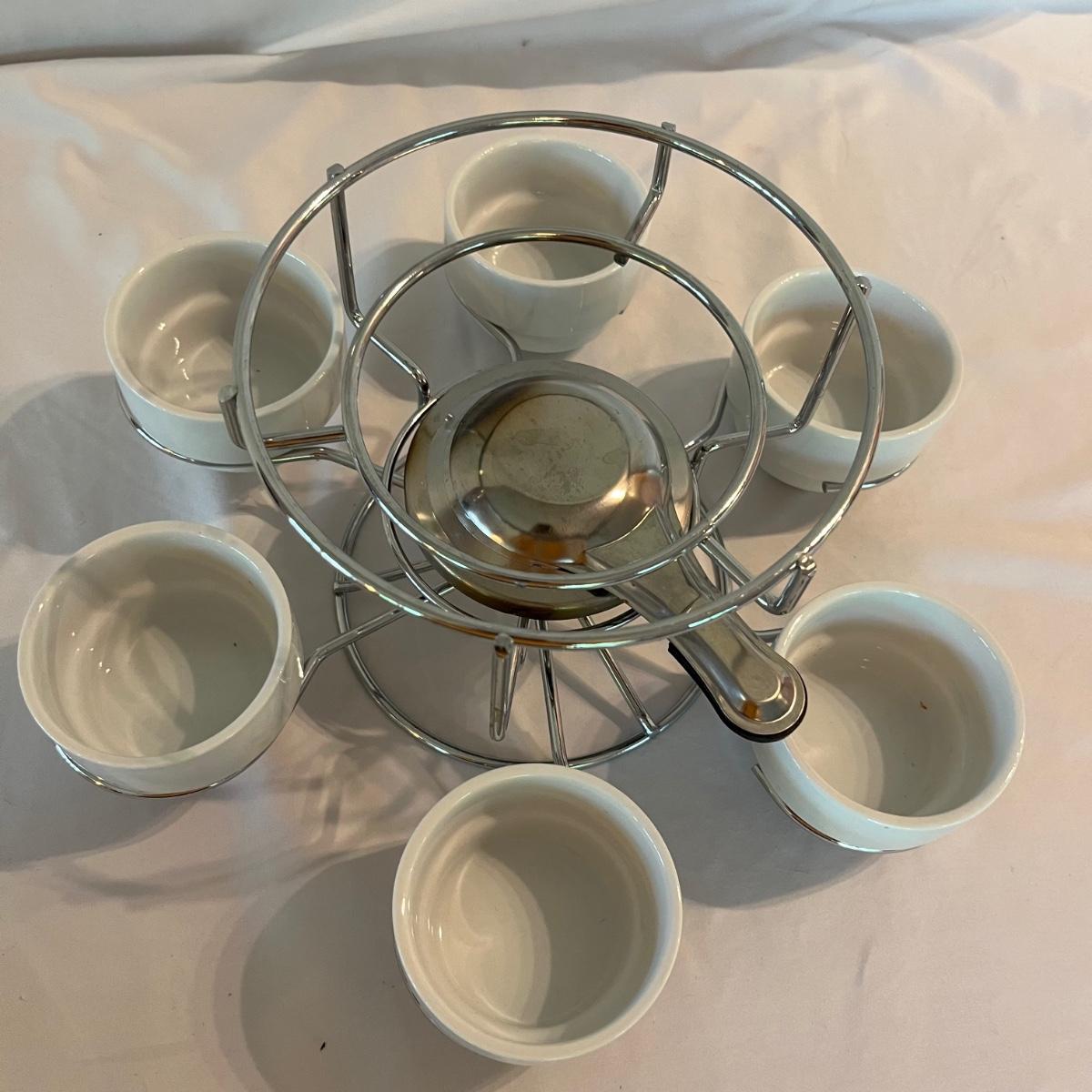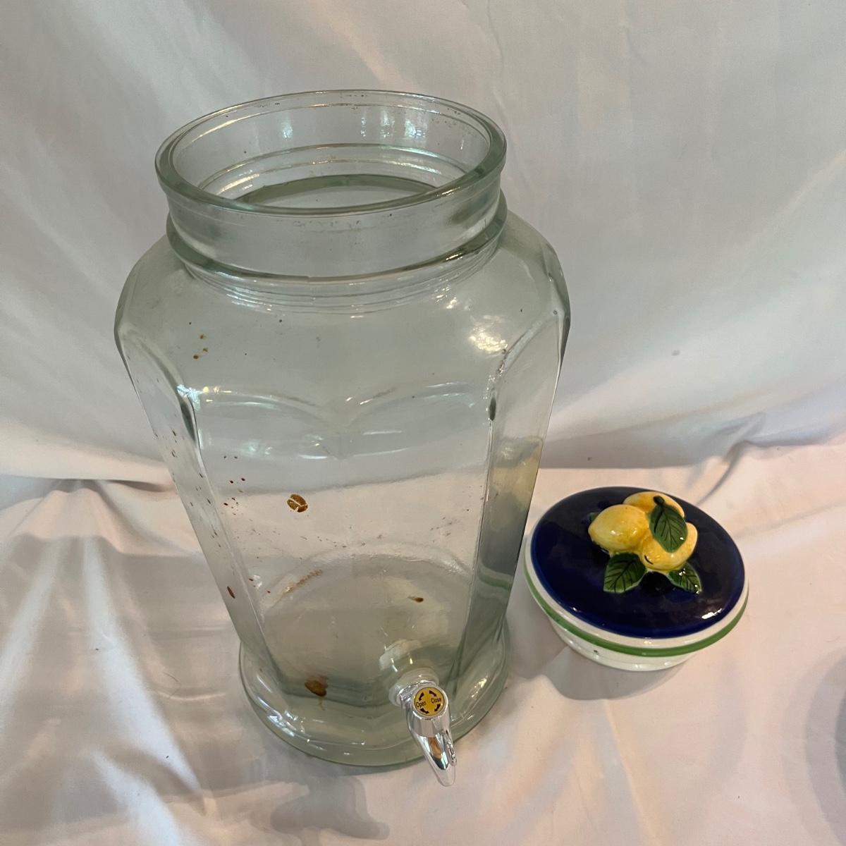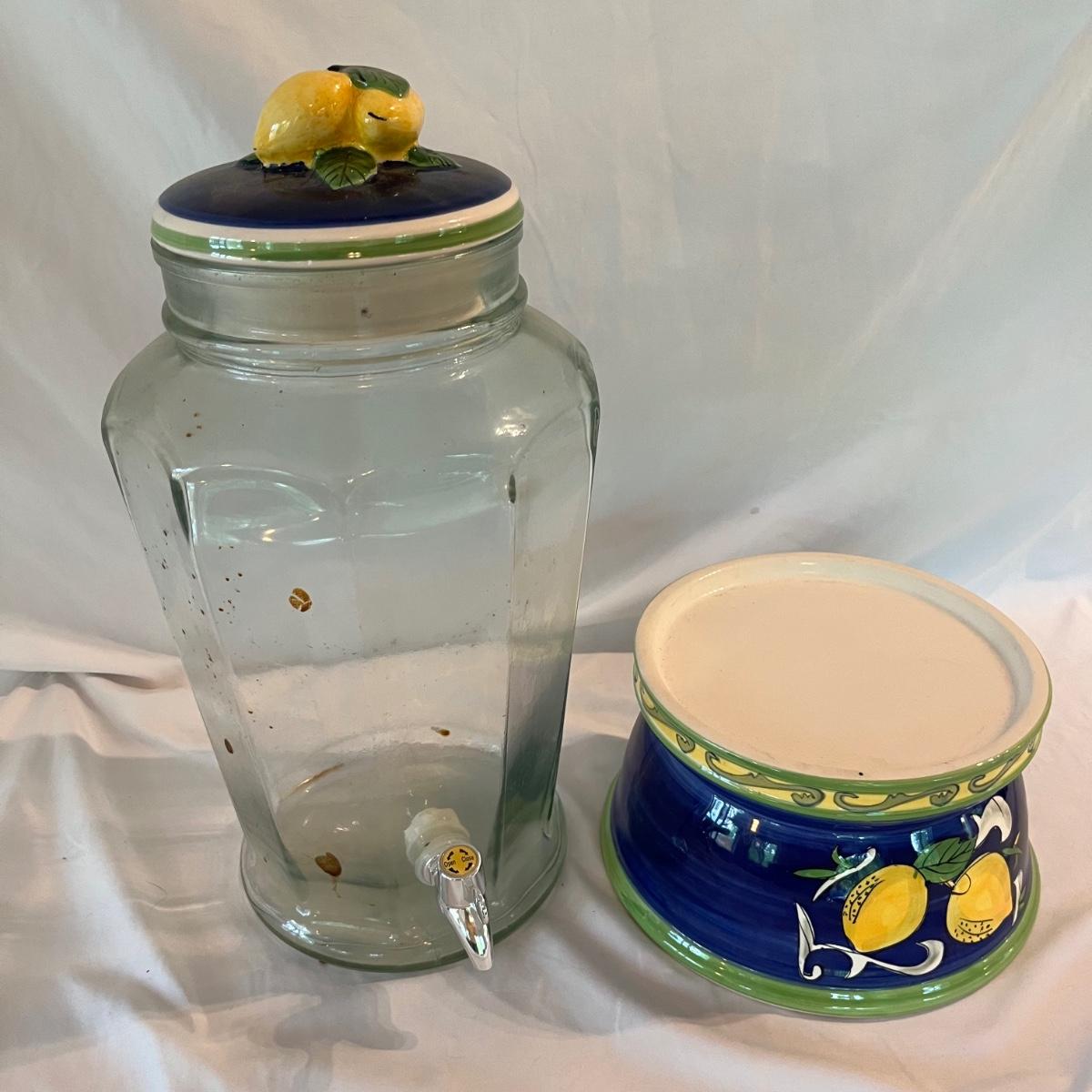 This lot includes one ceramic and glass lemonade jug, one fondue set with fondue forks, and one large serving rack with ceramic dishes. The lemonade jug has some stains on the glass (see photos). The serving rack has removable ceramic dishes and removable racks. The serving rack measures about 24” x 10” x 23”H. Local pickup only.