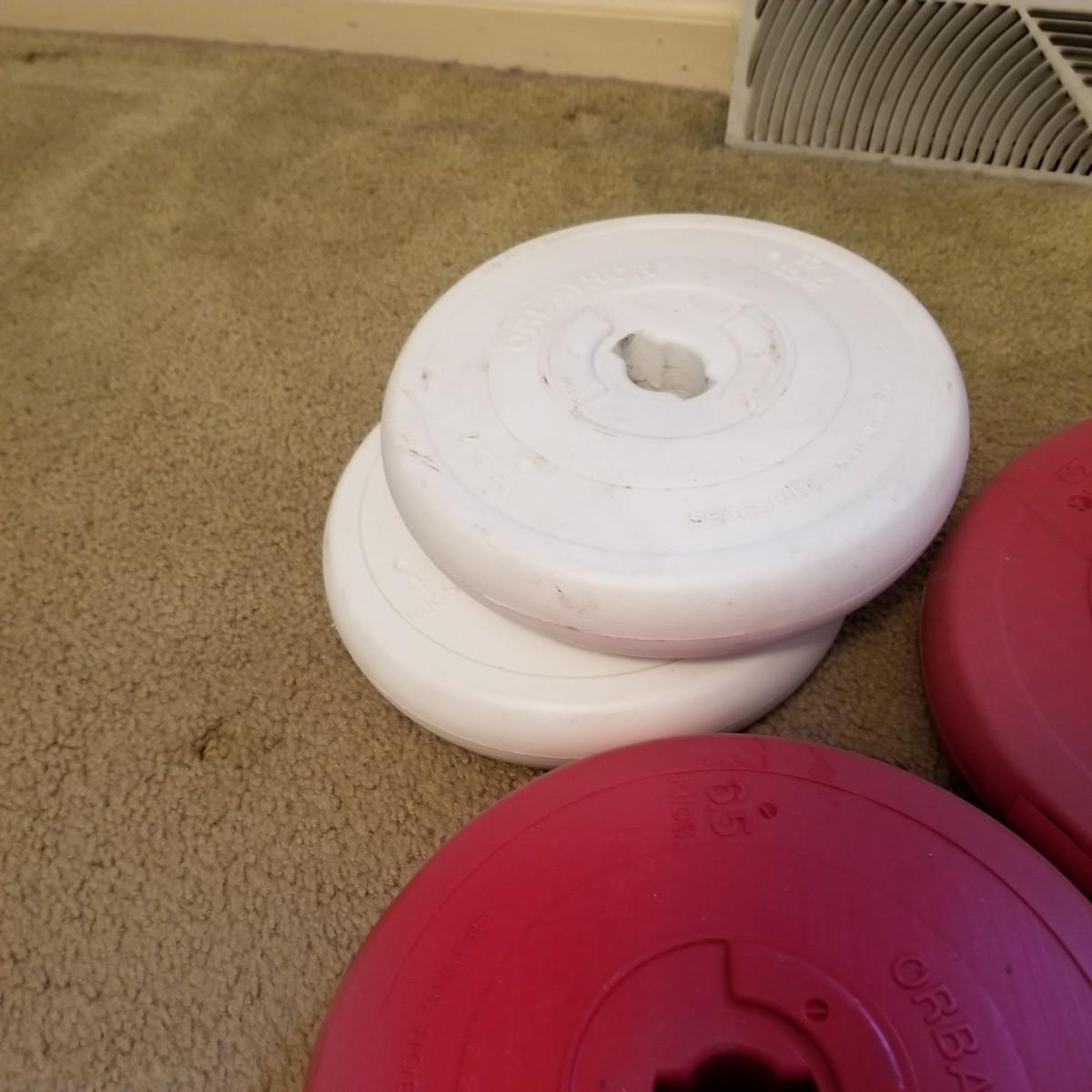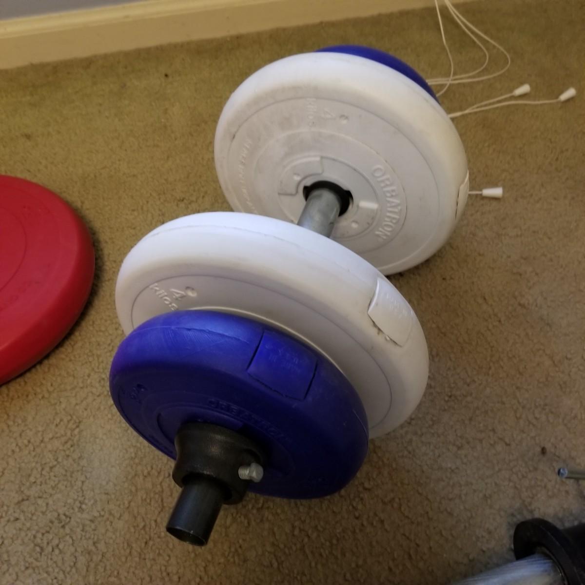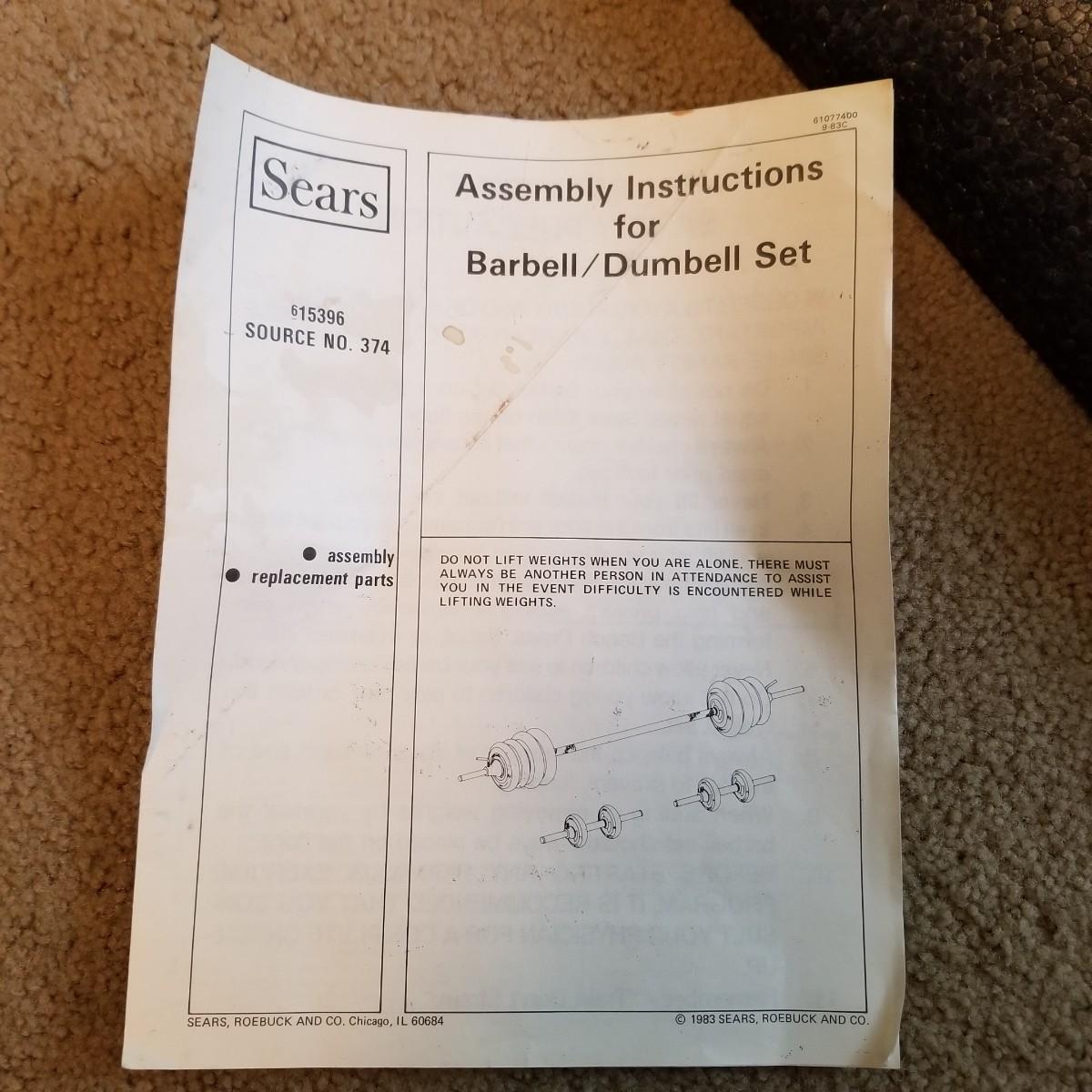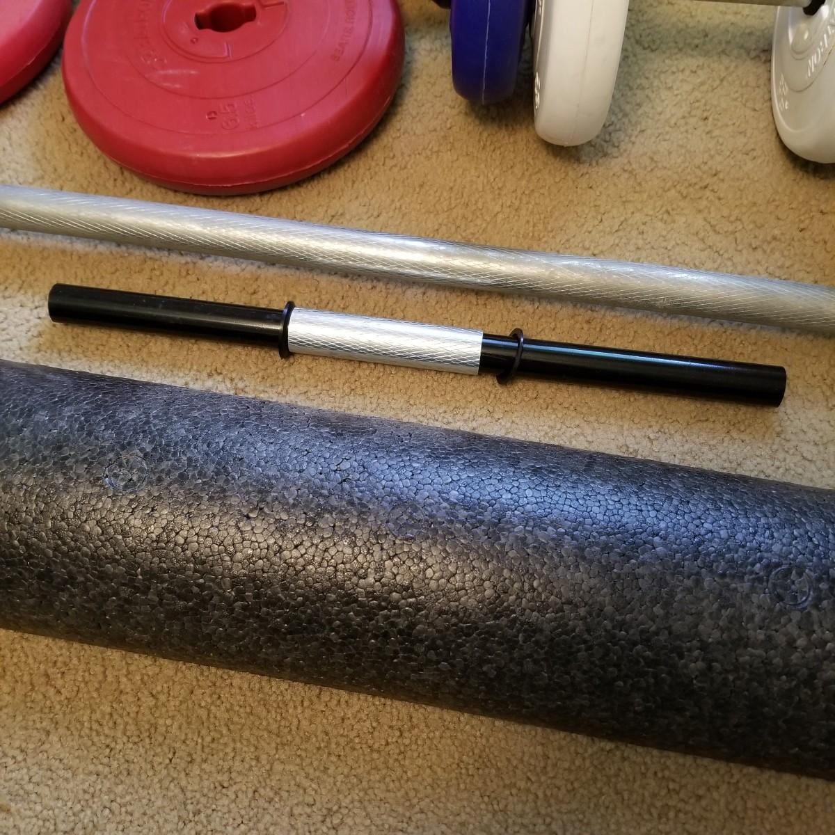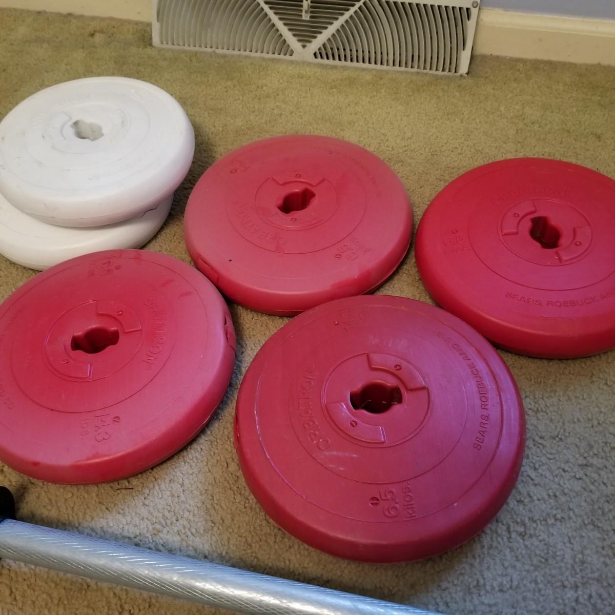 Sears beginner weight set, includes one 72" long bar w/collars, two 18" hand bars w/collars, four 14.3lb, four 8.8lb and two 4.4lb plastic coated weights. One half round hard foam roller and instructions also included. See photos for details. Local pickup only.
