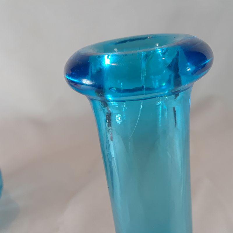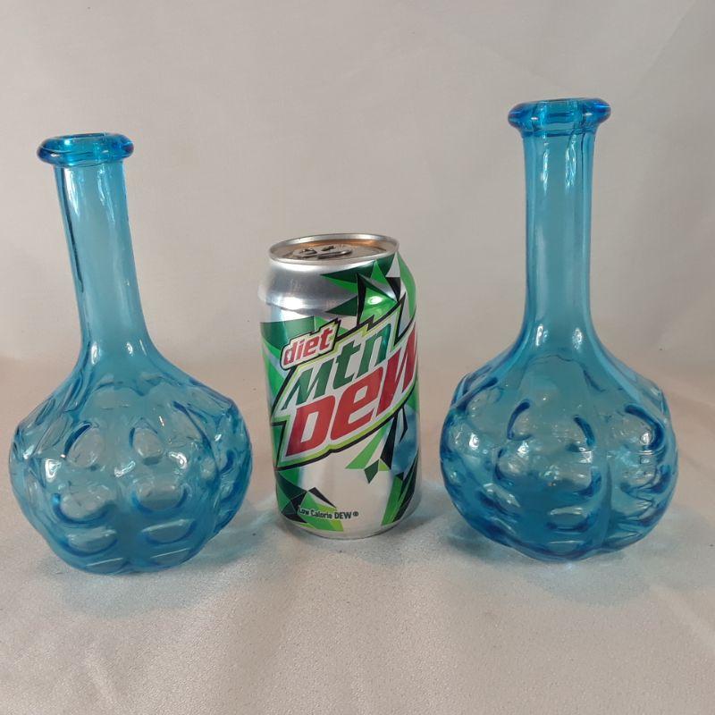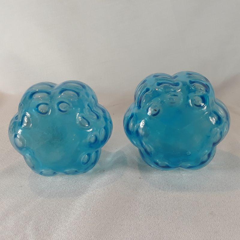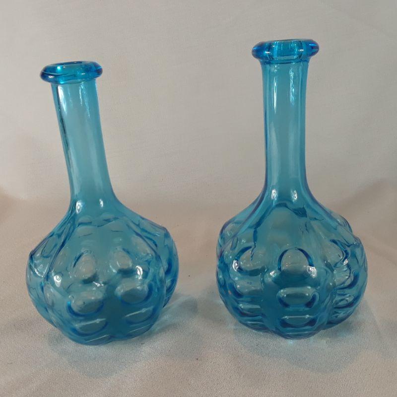 Two very nice and very old matching barber bottles - original contents were barber shop-made concoctions used to splash cooling treated liquids on the face after a shave. Both are a great color and in very good shape. There is a small hairline crack near the lip of one of the bottles but does not appear to go all the way through. 6 1/2-inches tall - 4-inches in diameter.