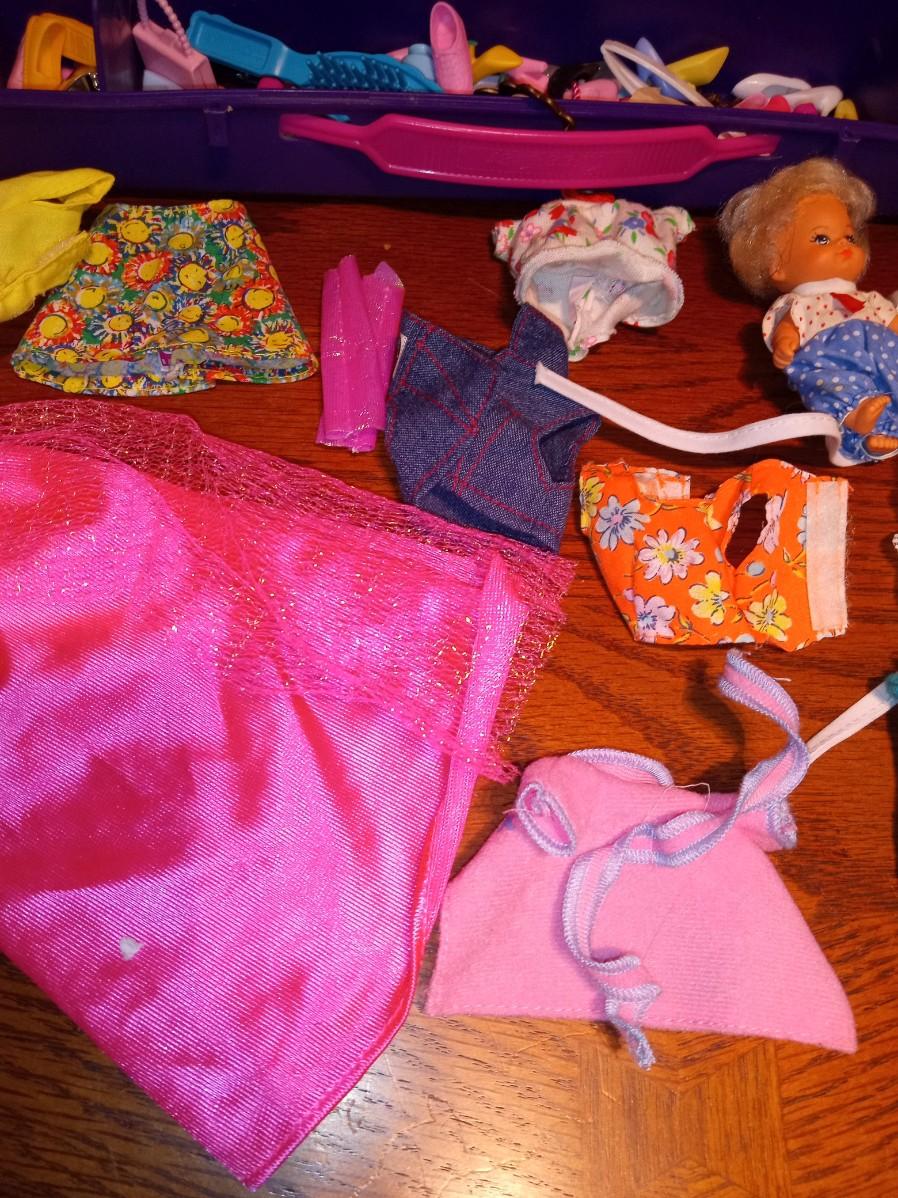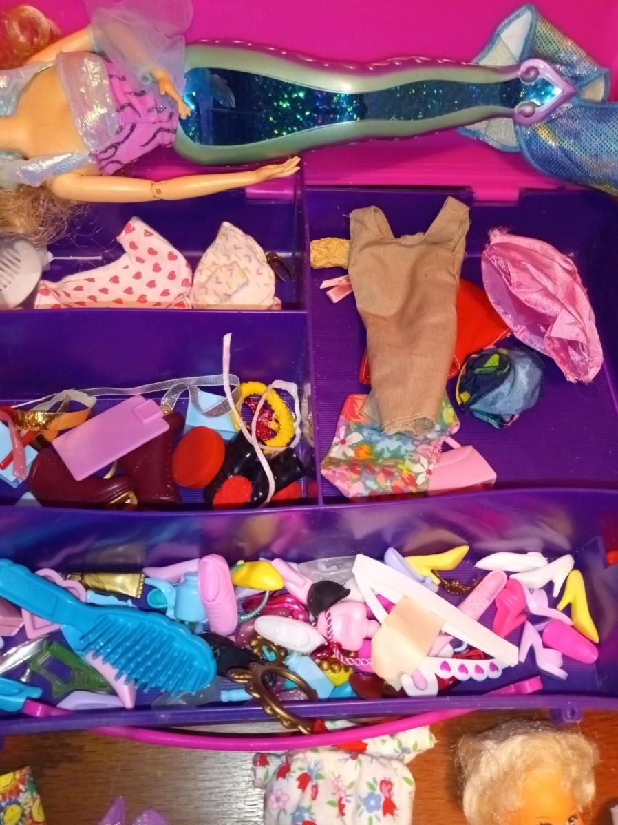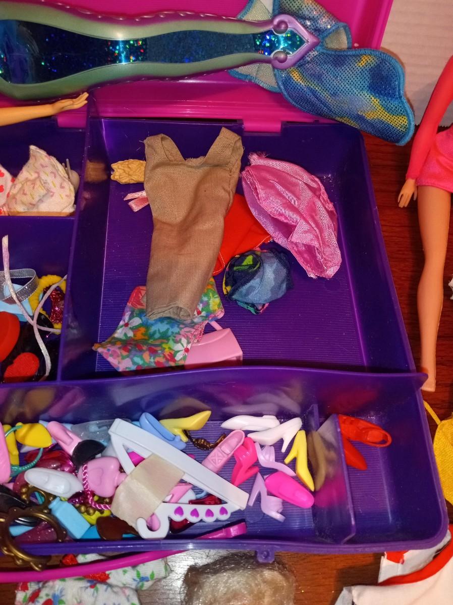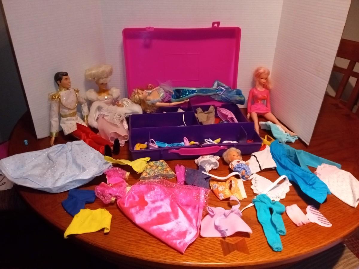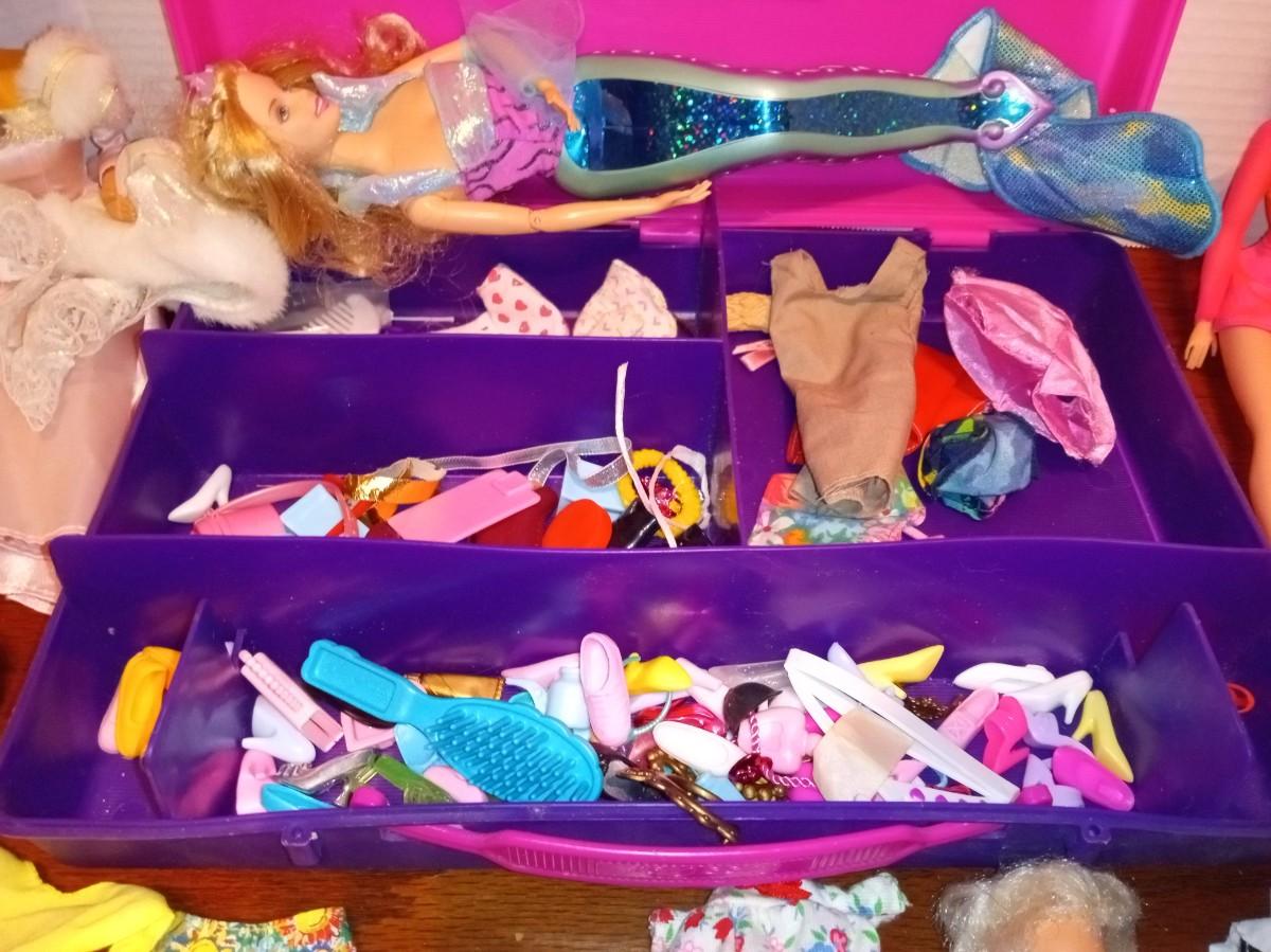 BARBIE AND KEN DOLLS, CLOTHES, MANY ACCESSORIES AND A CASE
