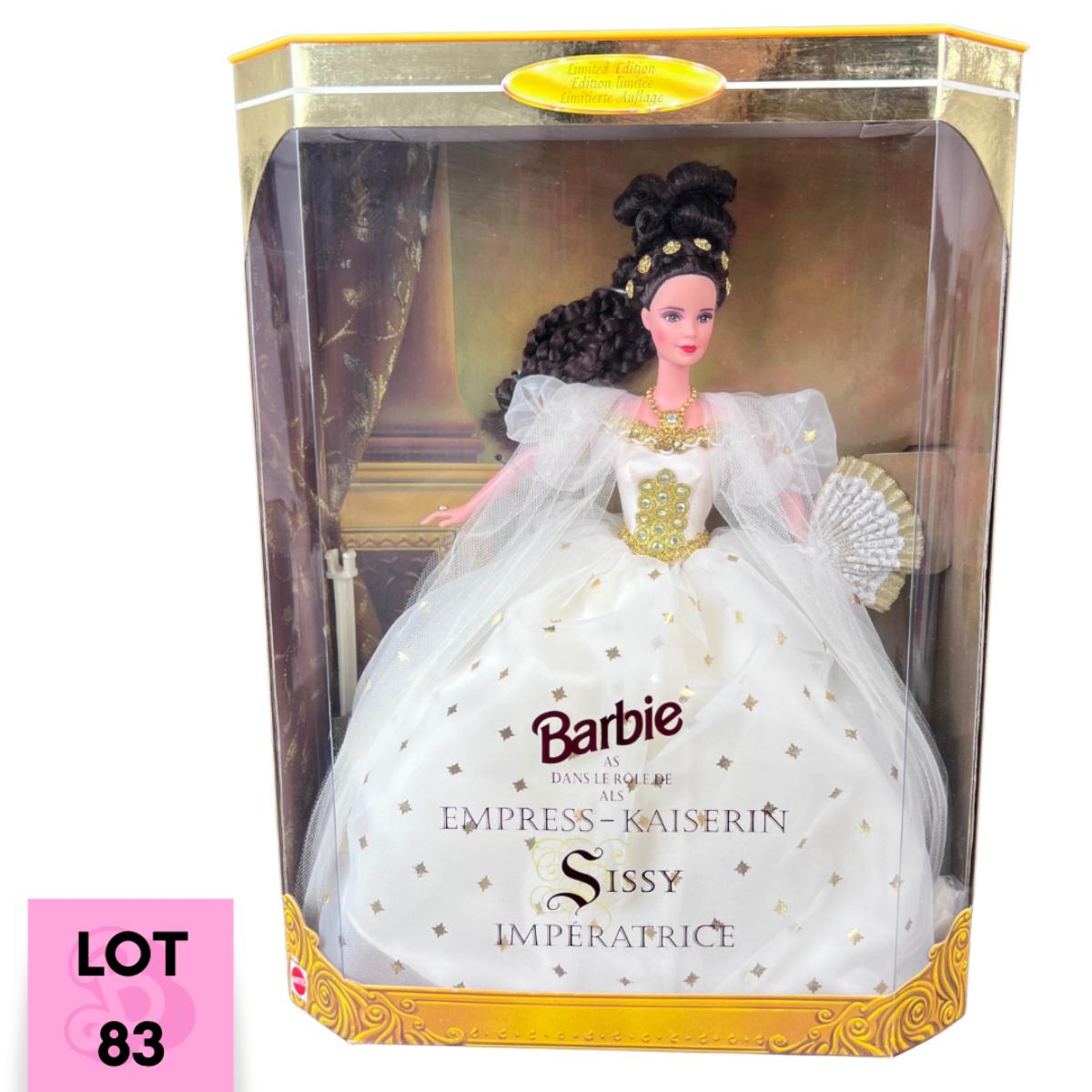 Empress Sissy was a popular member of the nineteenth century Habsburg family in Austria. Barbie as Empress Sissy wears a beautiful recreation of a costume inspired by Austria's Habsburg Lothinger Dynasty that was captured in an 1864 original painting of Empress Sissy. This doll was produced by Mattel in 1996. This doll has not been out of its box. **|** Please see photos for details and condition. ::: Shipping is available on this lot. If you require shipping you must let us know at the close of the auction. We will coordinate with you after the item has been won. Shipping fees will include insurance up to or exceeding the value of all items being mailed. If you have any questions regarding this lot please contact the auctioneer either via this website, by direct email or by phone. PICK UP TIMES and other important information can be found in the TERMS and DESCRIPTION of the auction. Please take a look for pertinent information. Thanks!