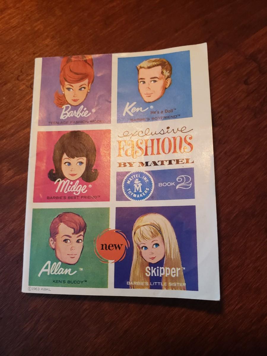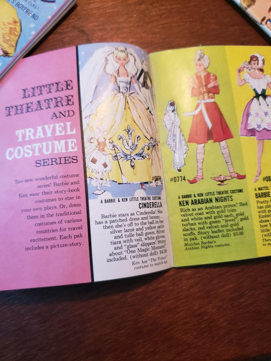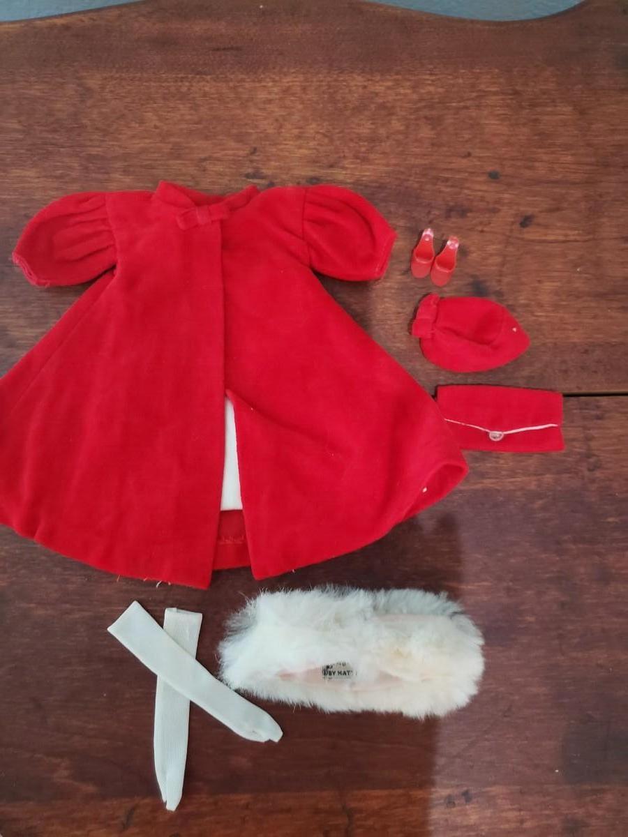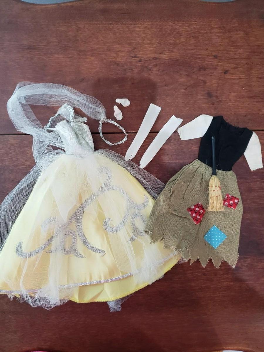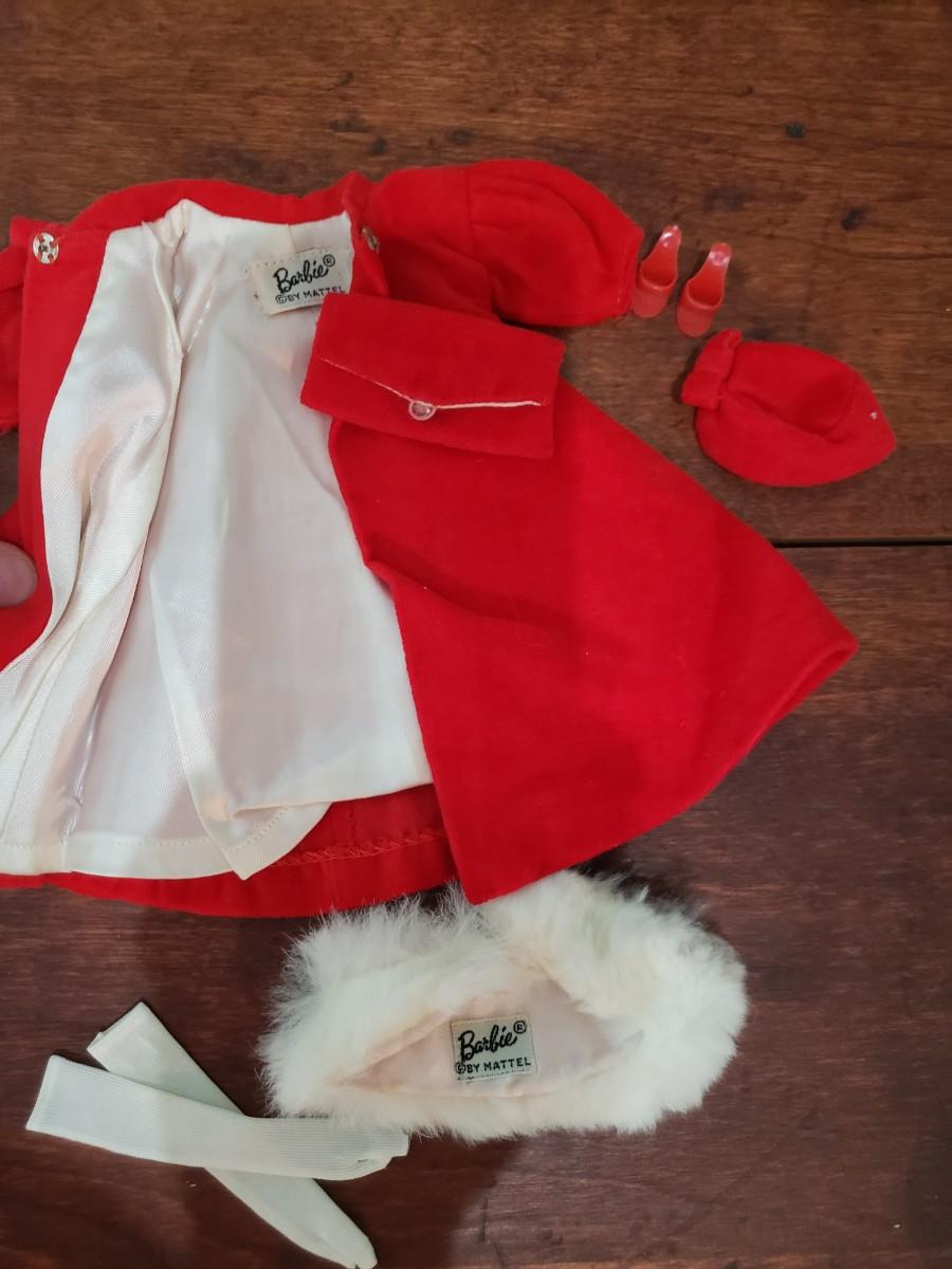 1963 Barbie Cinderella dress up clothes. Ball gown, shoes, gloves, & veil. Red flare coat set #939 gloves, hat, red shoes & purse. 1963 Wardrobe Booklet.