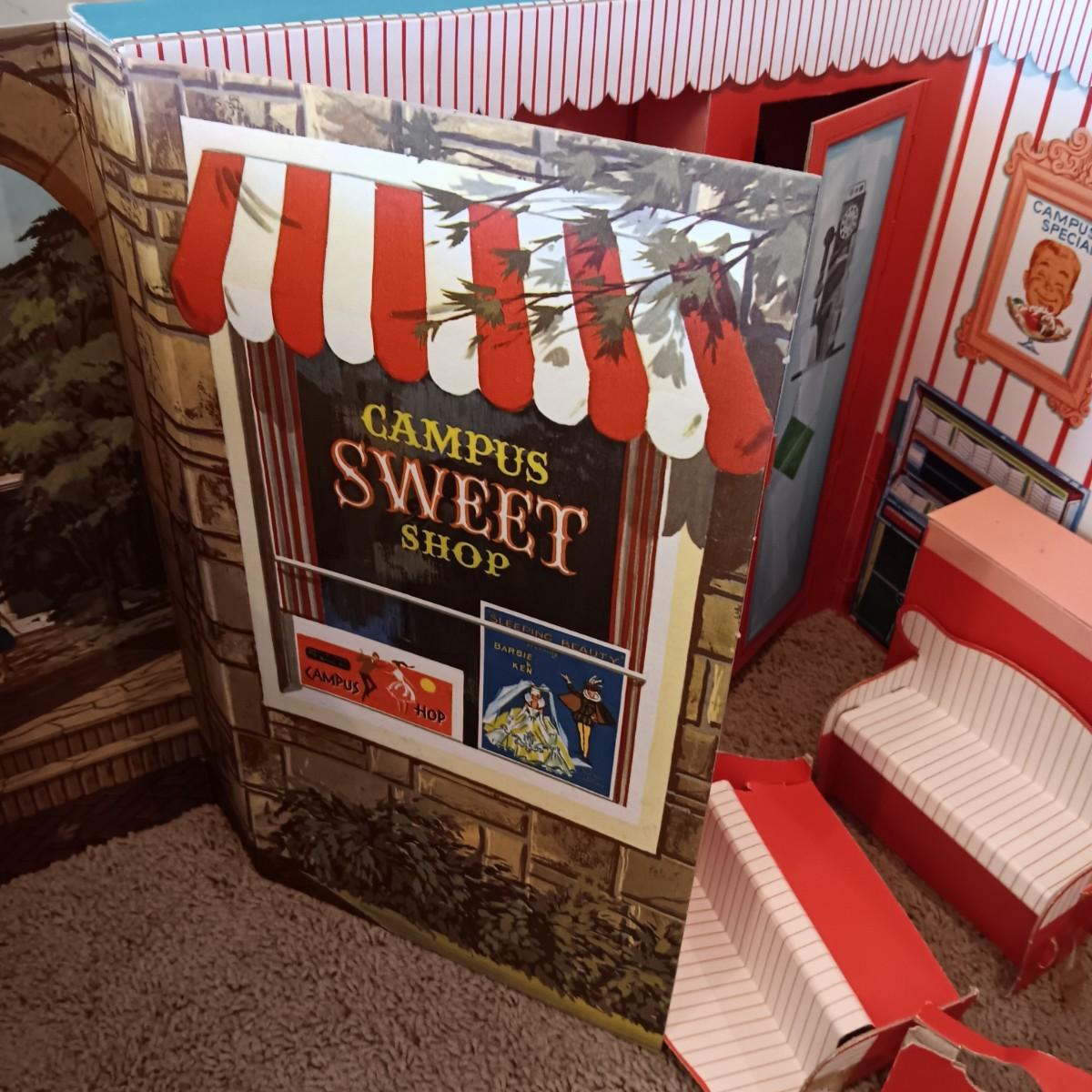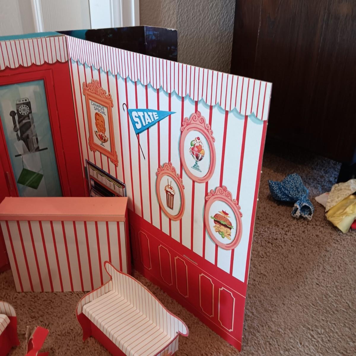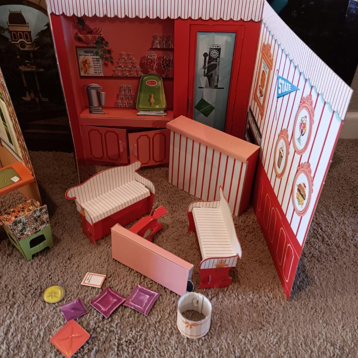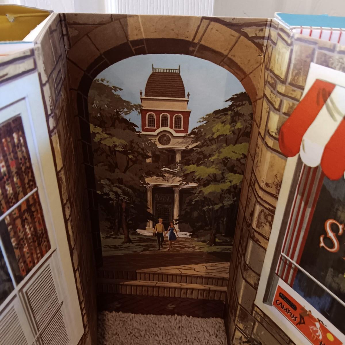 CARDBOARD THAT FOLDS OUT TO A WHOLE LOT OF FUN! DORM ROOM, ICE CREAM SHOP, MOVIE THEATRE AND THE GRAND STANDS. IT'S IN VERY GOOD SHAPE CONSIDERING IT IS FROM THE EARLY 60'S