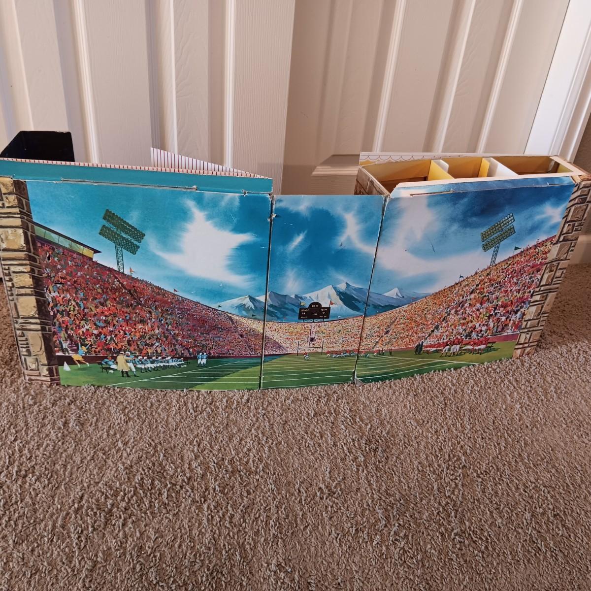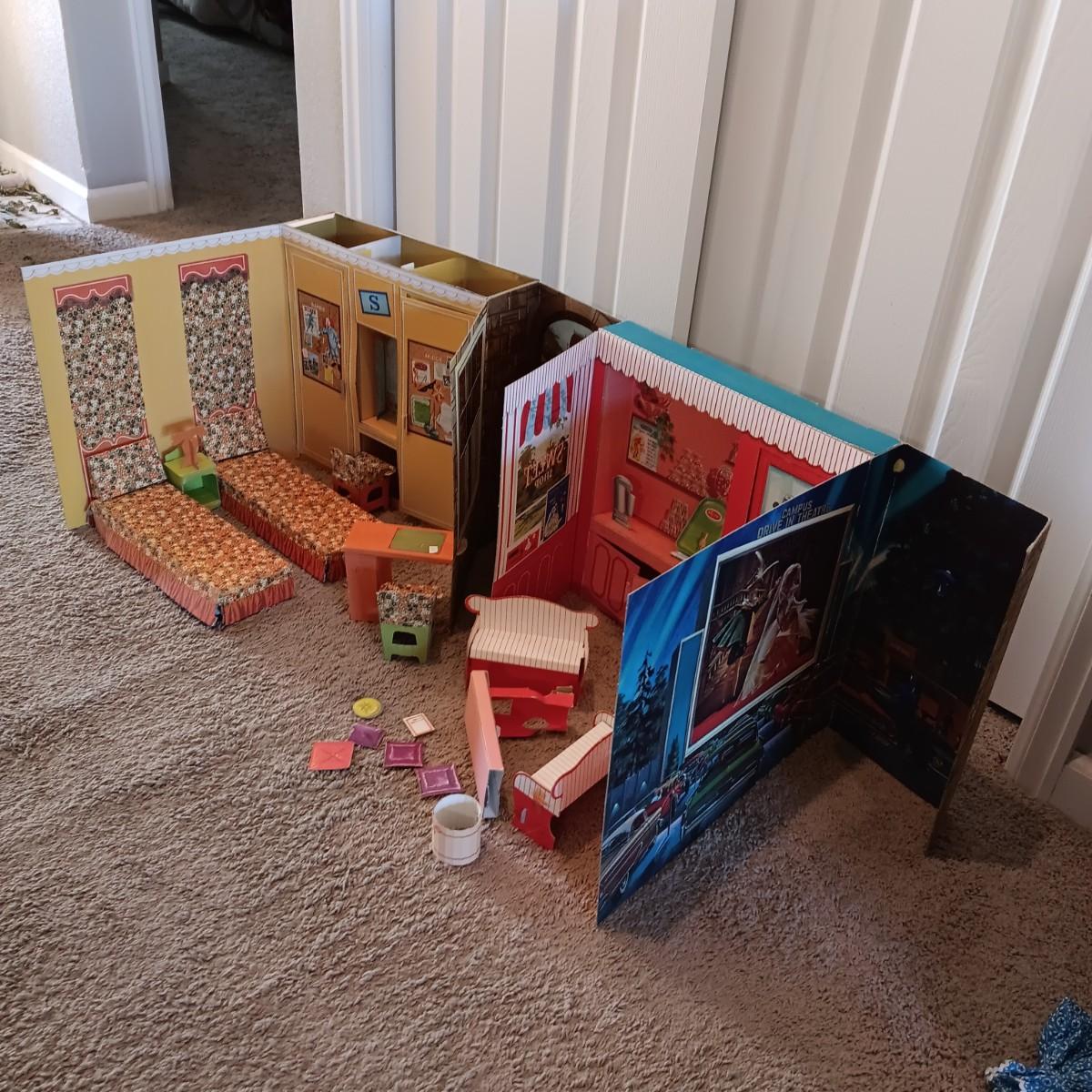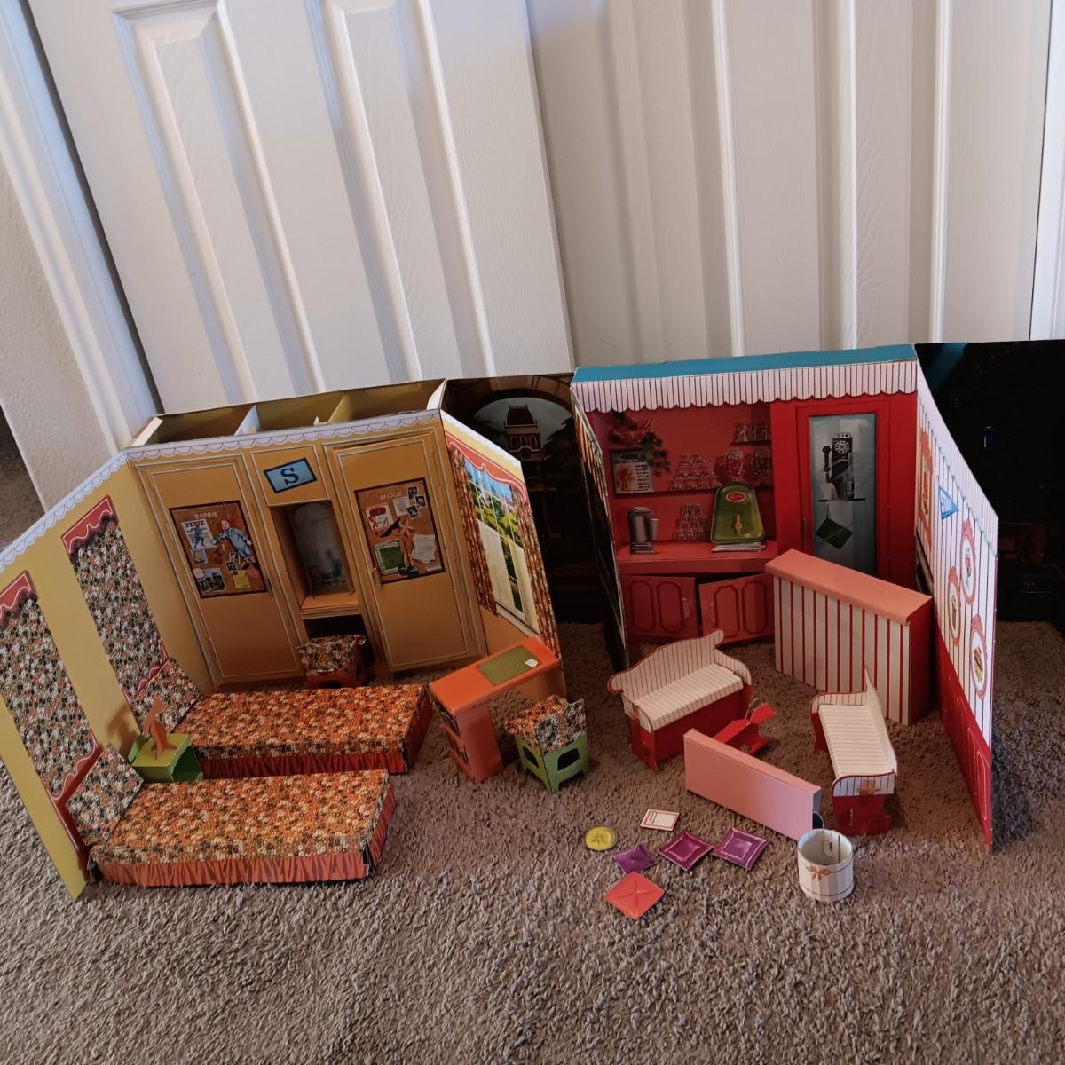 CARDBOARD THAT FOLDS OUT TO A WHOLE LOT OF FUN! DORM ROOM, ICE CREAM SHOP, MOVIE THEATRE AND THE GRAND STANDS. IT'S IN VERY GOOD SHAPE CONSIDERING IT IS FROM THE EARLY 60'S