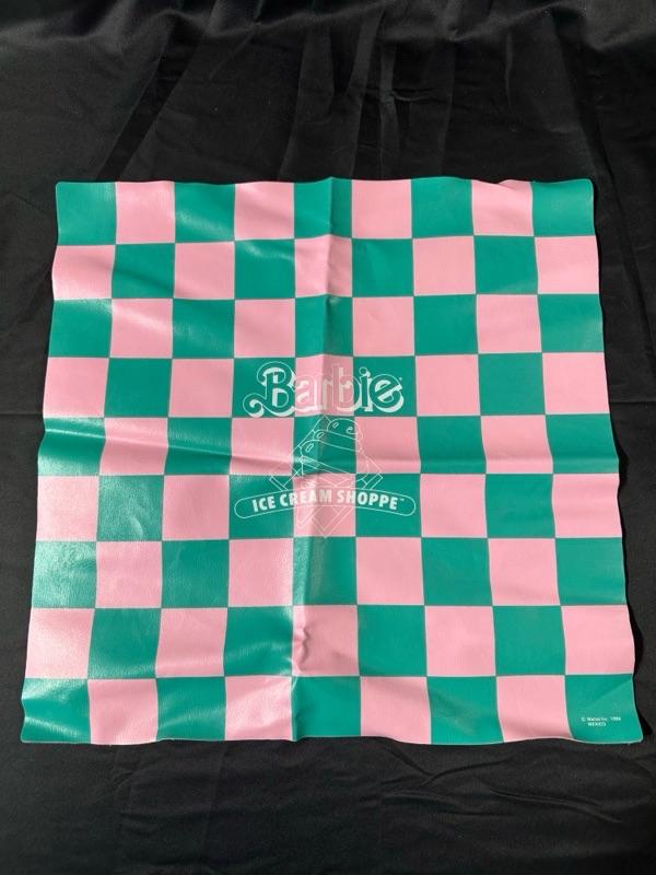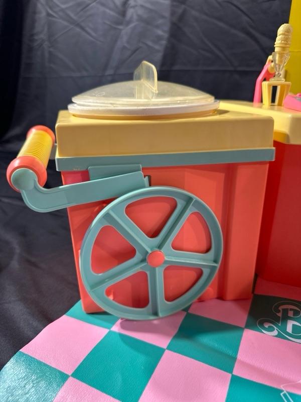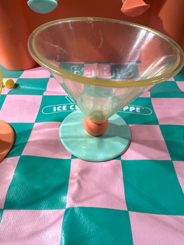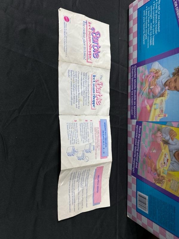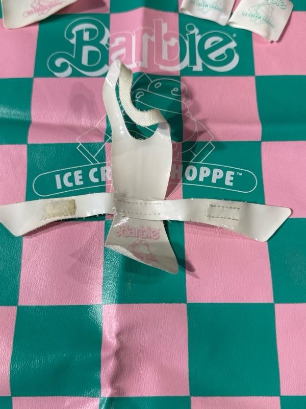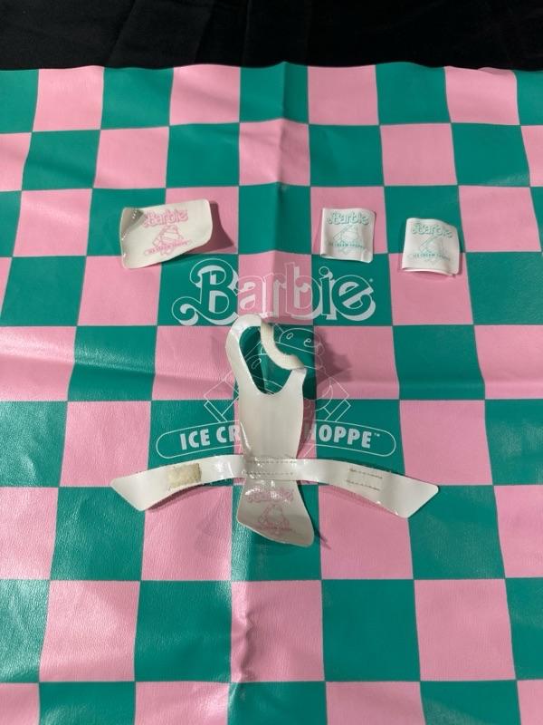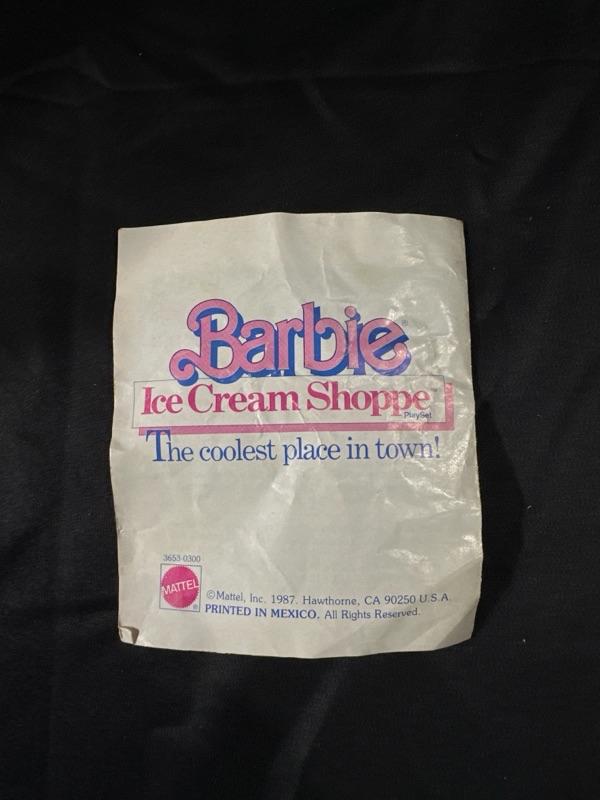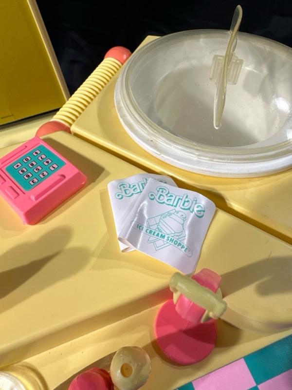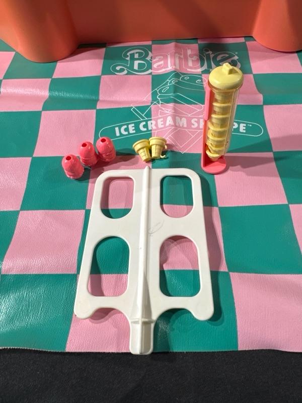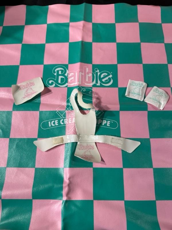 Barbie Ice Cream Shoppe comes with original box. Made by Mattel. Includes a Barbie apron (pictured). Some pieces are missing, please examine photos carefully. Barbie not included. This set will come disassembled. Instructions for set-up not included.