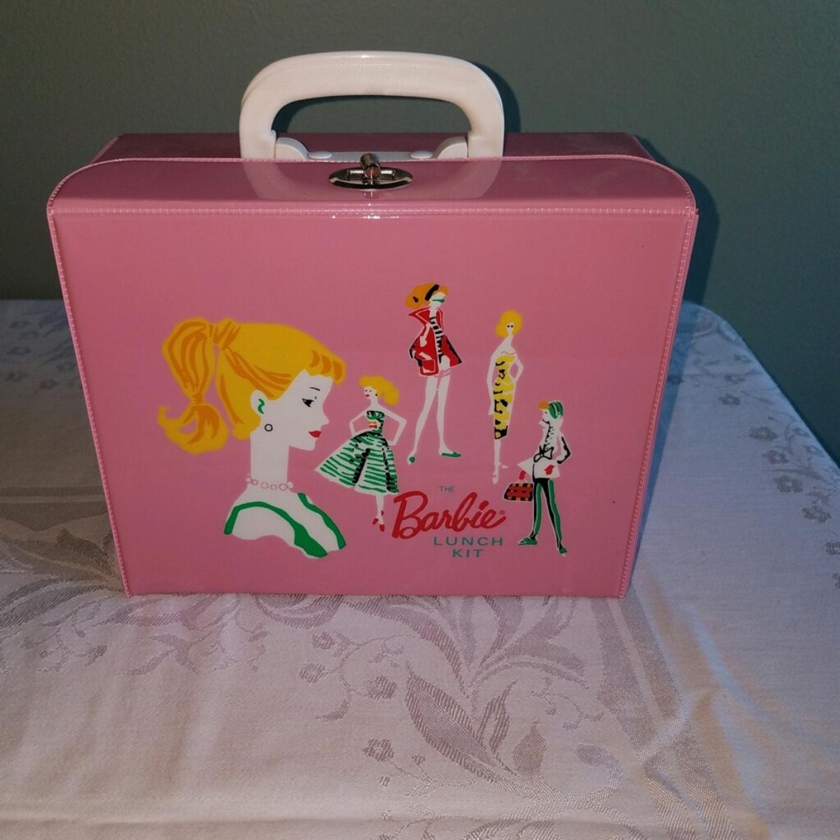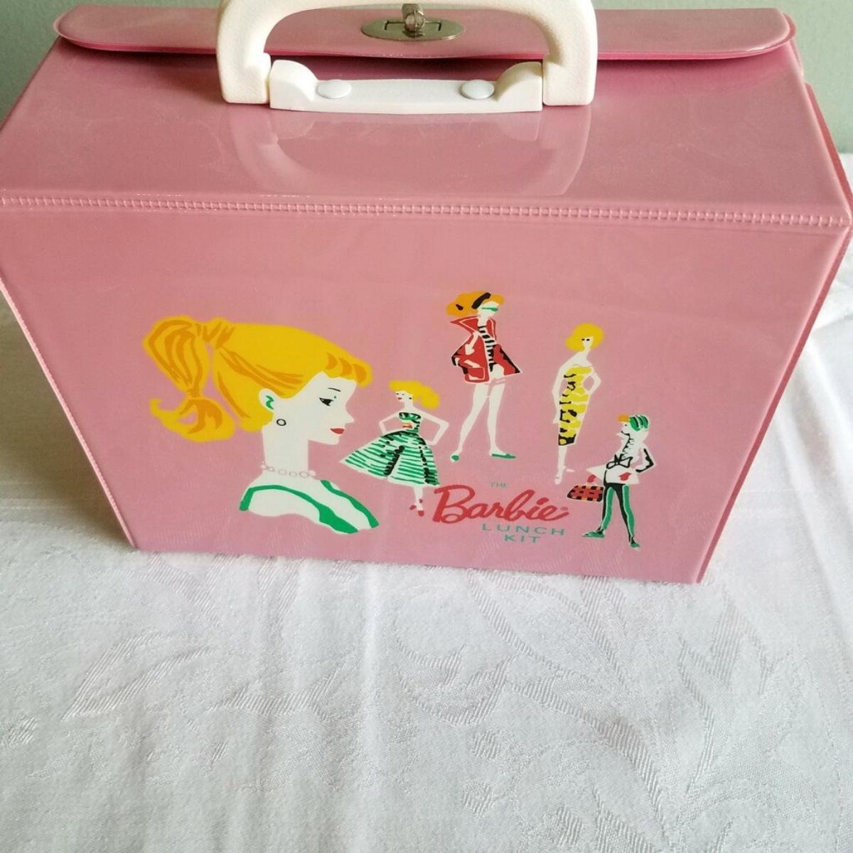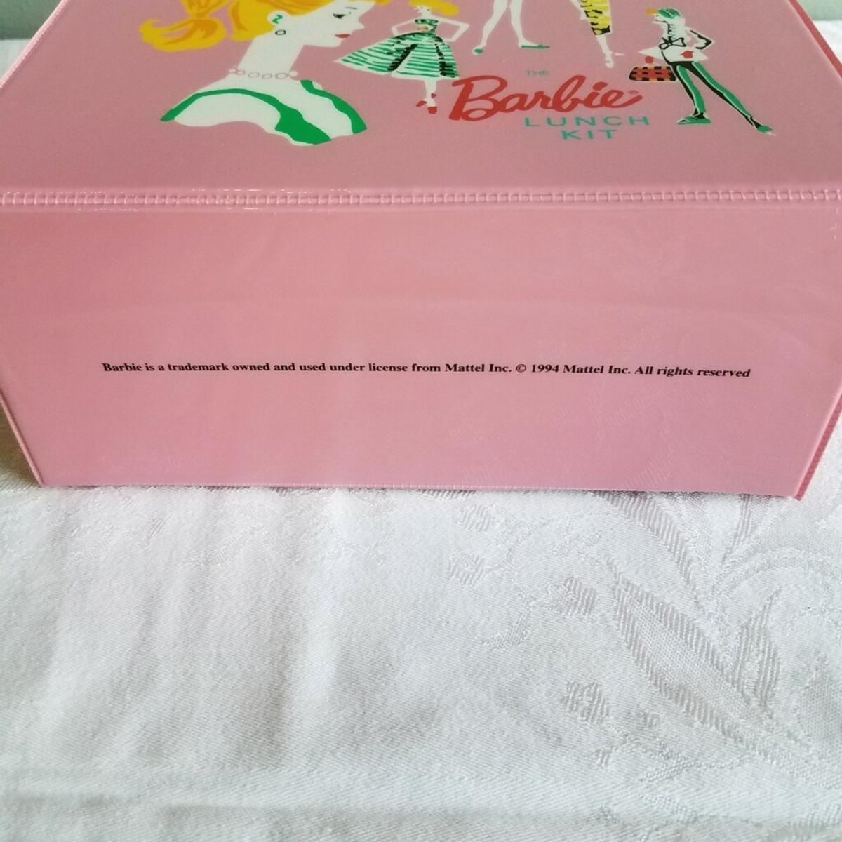 Barbie lunch box. 1994 by Matel. Approx 7.25 H without handle x 9 W. Long strap included. Note: outside mint condition. Inside has tear ( see pic)
