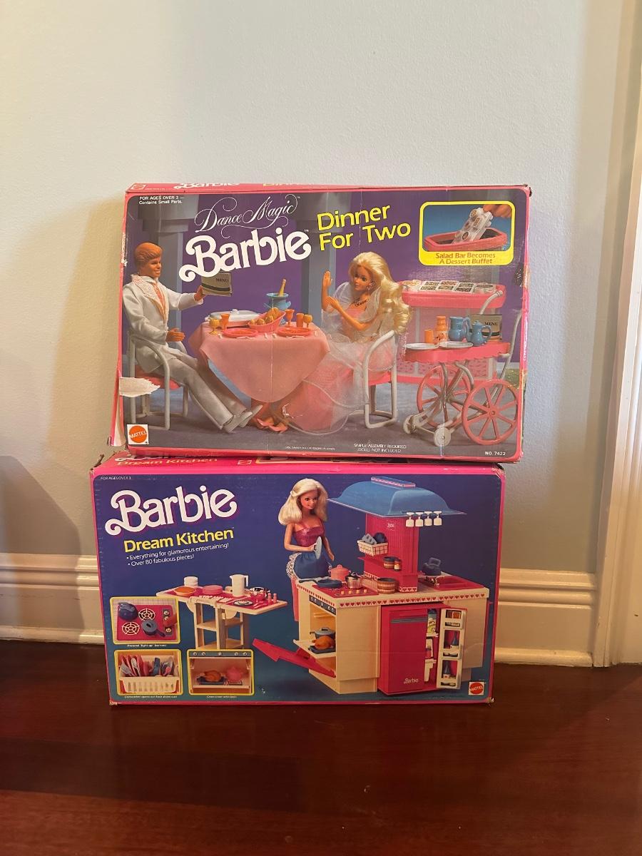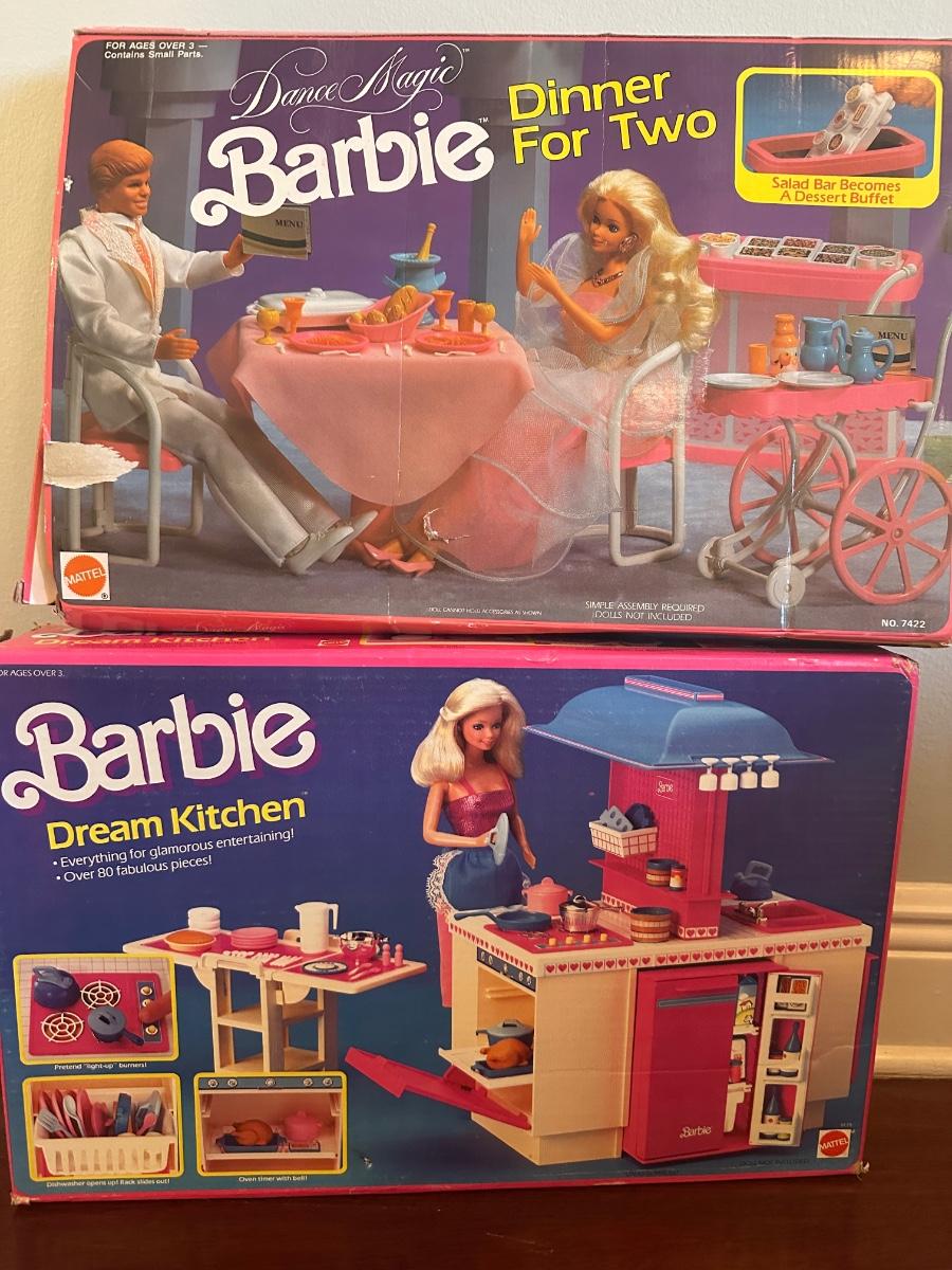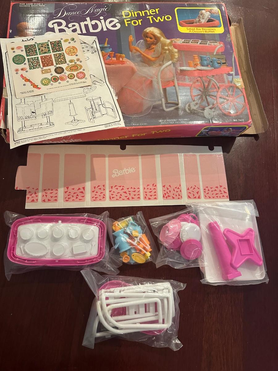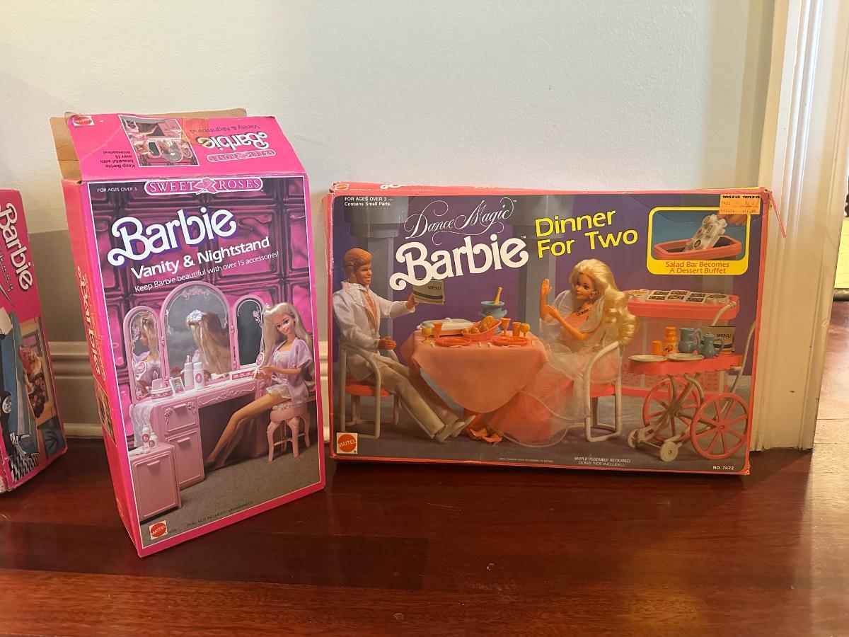 Barbie playset lot by Mattel including Sweet Roses Vanity & Nightstand set with accessories and Dance Magic “Dinner for Two” playset. Includes items and parts shown in photos; no inventory has been taken.
