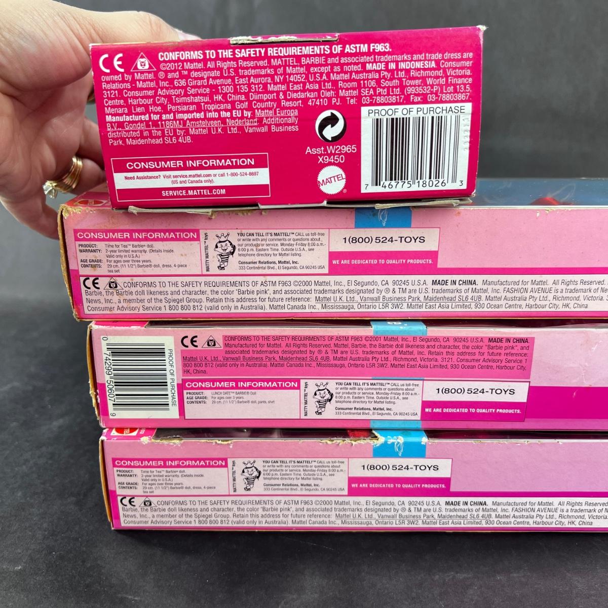 Four Barbies, Two the same. Two Time for Tea Barbies, one Lunch Date and one fairy-ish one. This quartet of barbies is all those that aren't great standalone. The boxes have some damage to them. **|** Please see photos for details and condition. ::: Shipping is available on this lot. If you require shipping you must let us know at the close of the auction. We will coordinate with you after the item has been won. Shipping fees will include insurance up to or exceeding the value of all items being mailed. If you have any questions regarding this lot please contact the auctioneer either via this website, by direct email or by phone. PICK UP TIMES and other important information can be found in the TERMS and DESCRIPTION of the auction. Please take a look for pertinent information. Thanks!