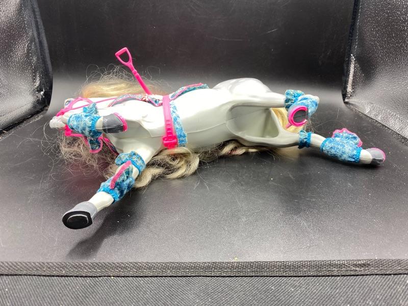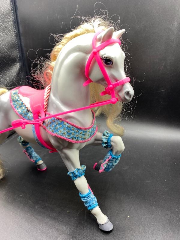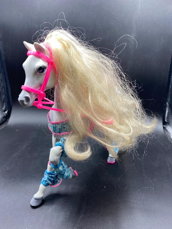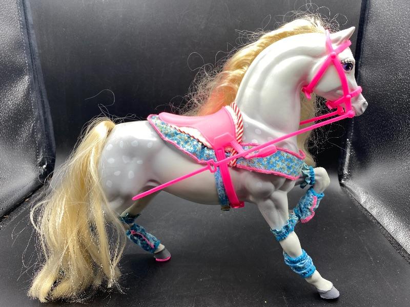 Vintage Barbie grey horse "Snowdance Blizzard". Grey with spots. Has a bell inside that jingles when moved. Has halter, saddle, and accessories. Wild mane needs to be brushed. Well played with.