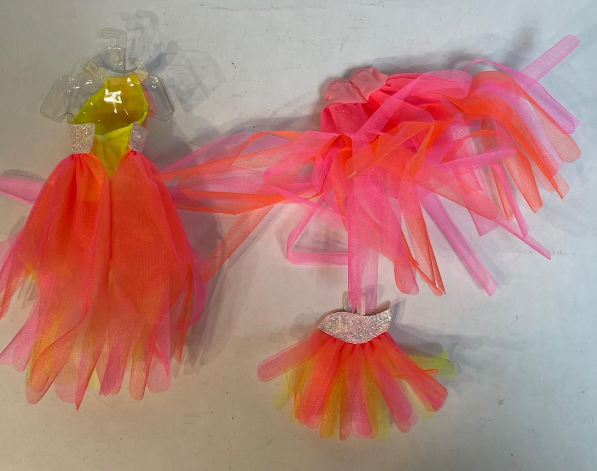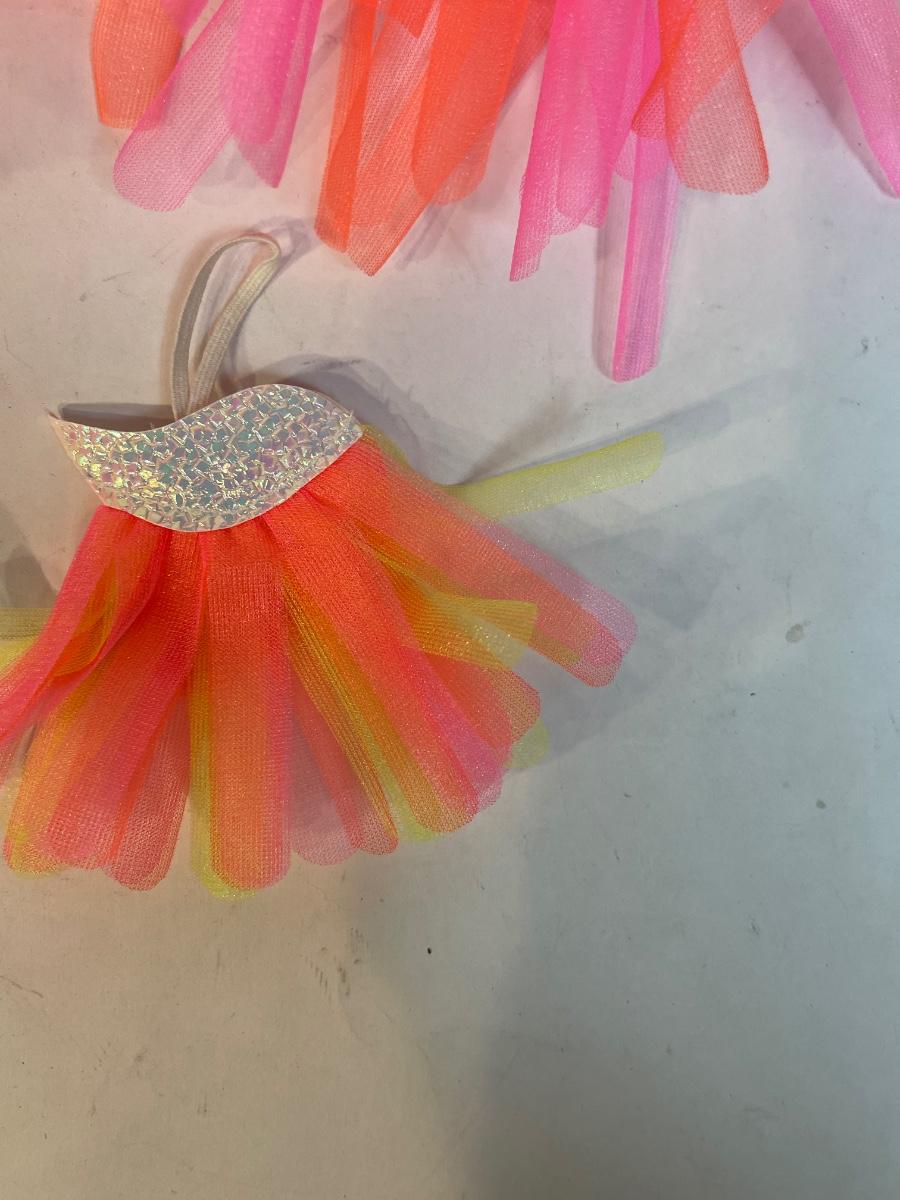 Red, pink and yellow gauze material. One item has the original clear plastic hang tag.