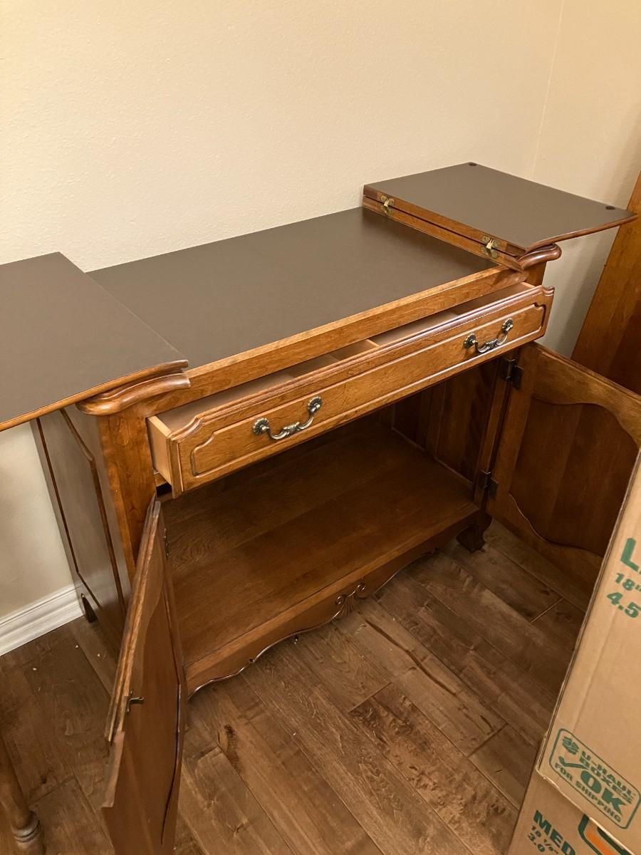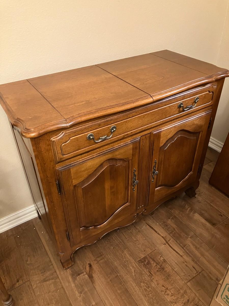 Table top opens for bar or buffet service. Beautiful solid wood piece. 34" H x 40" W x 18" D