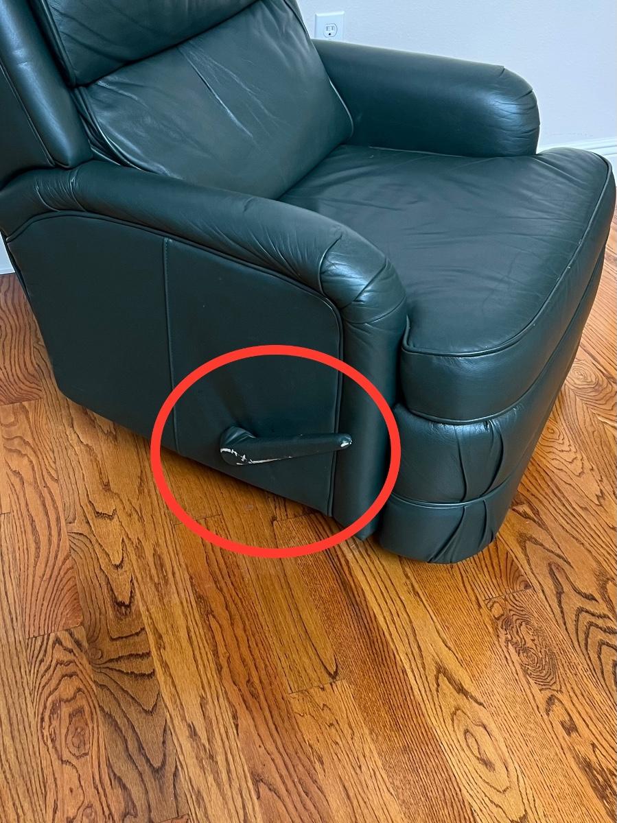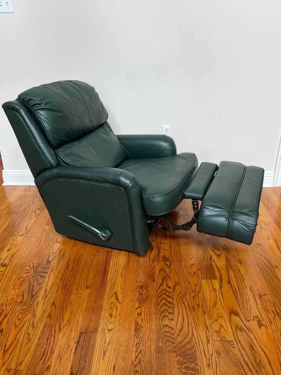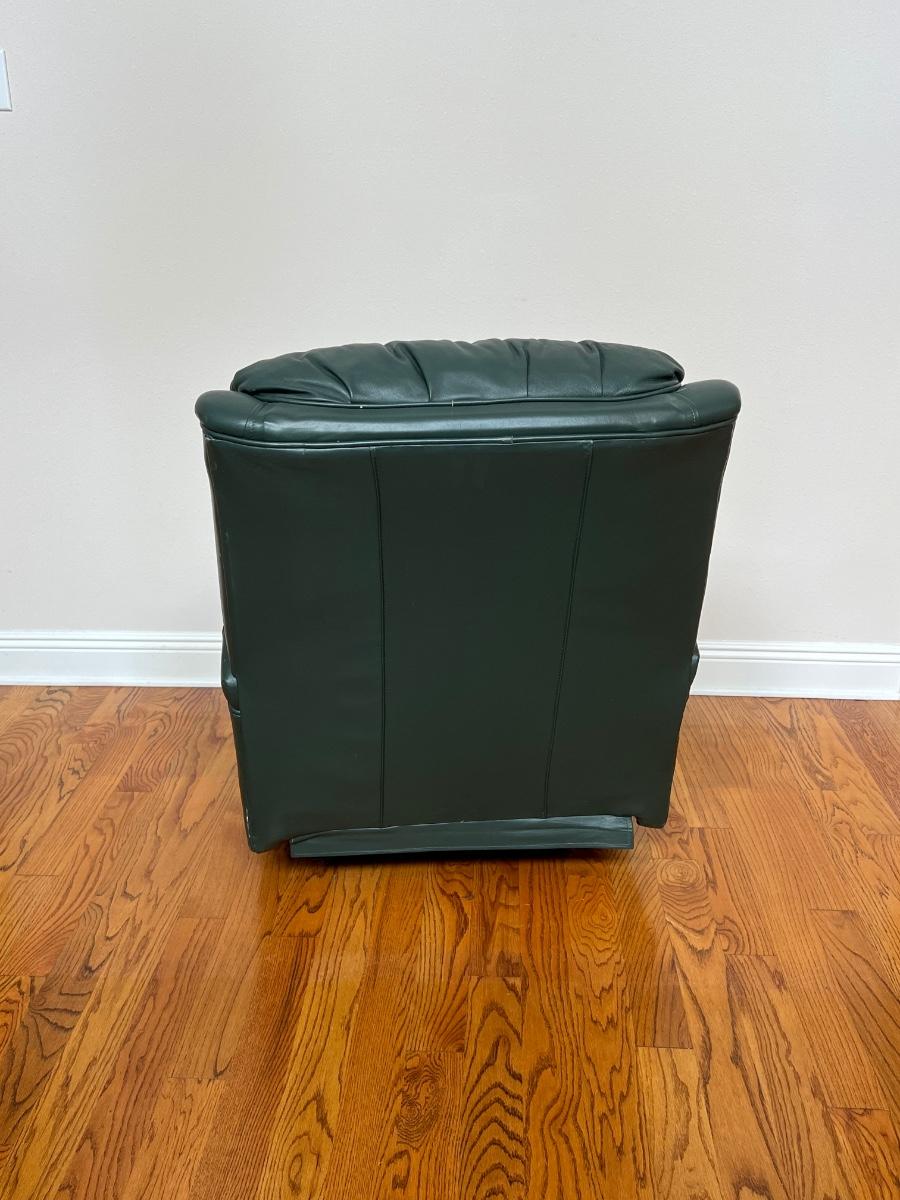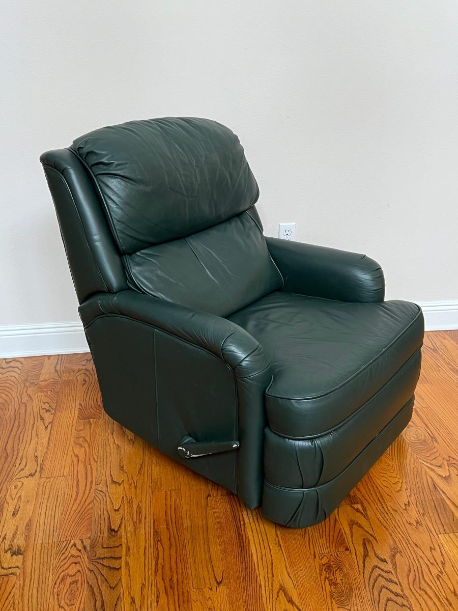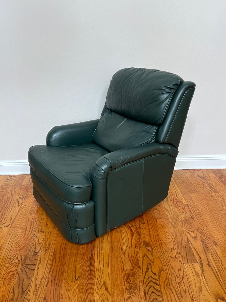 Material is vinyl ~ Has minor wear on the handle ~ Recliner does not swivel or rock ~ 36” H x 32” W x 39” D