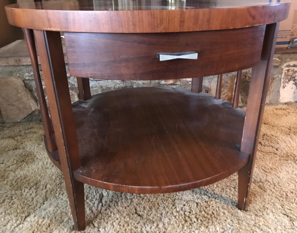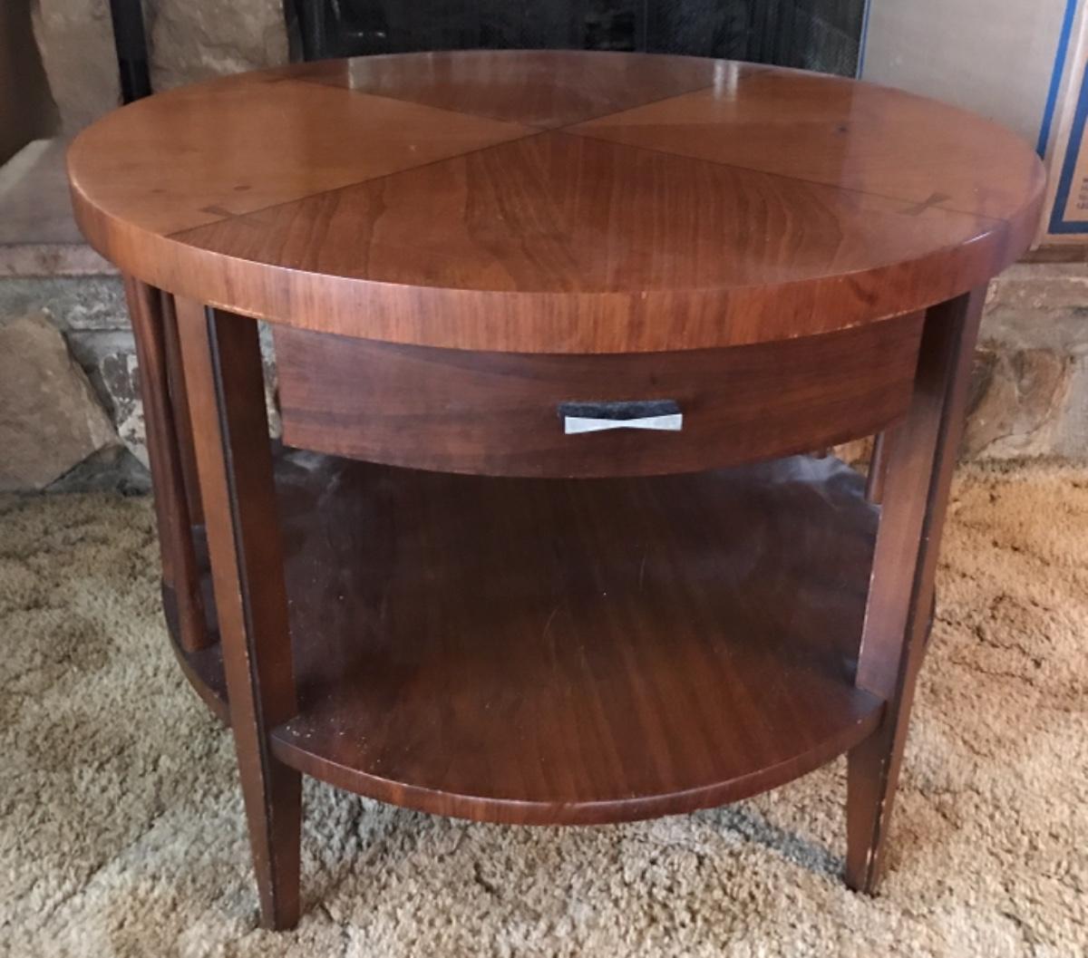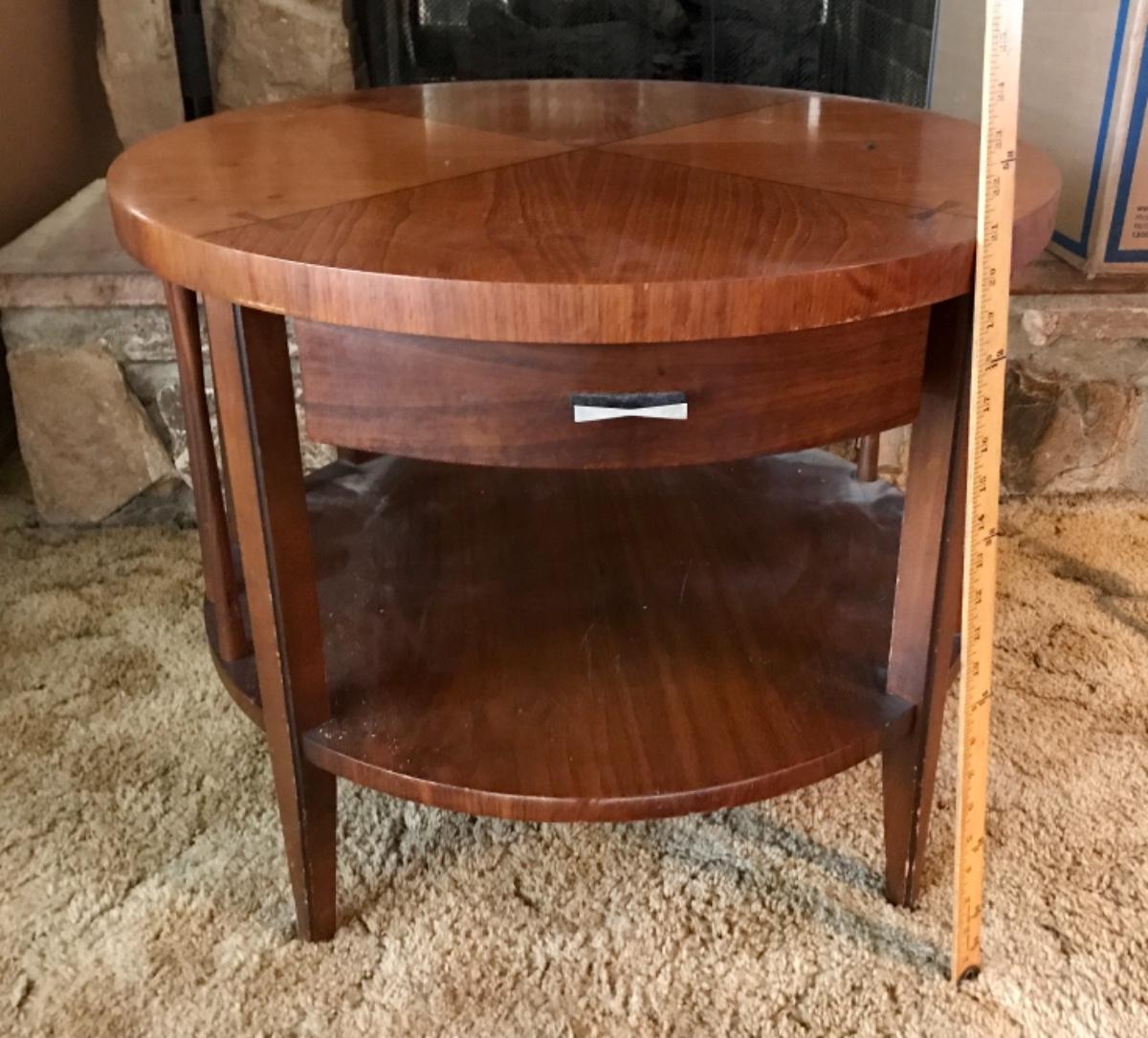 Vintage Mid Century MCM Barker Bros. Round end table, two level, one drawer, spindles on sides