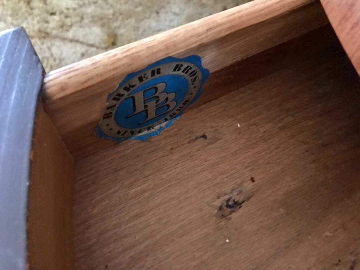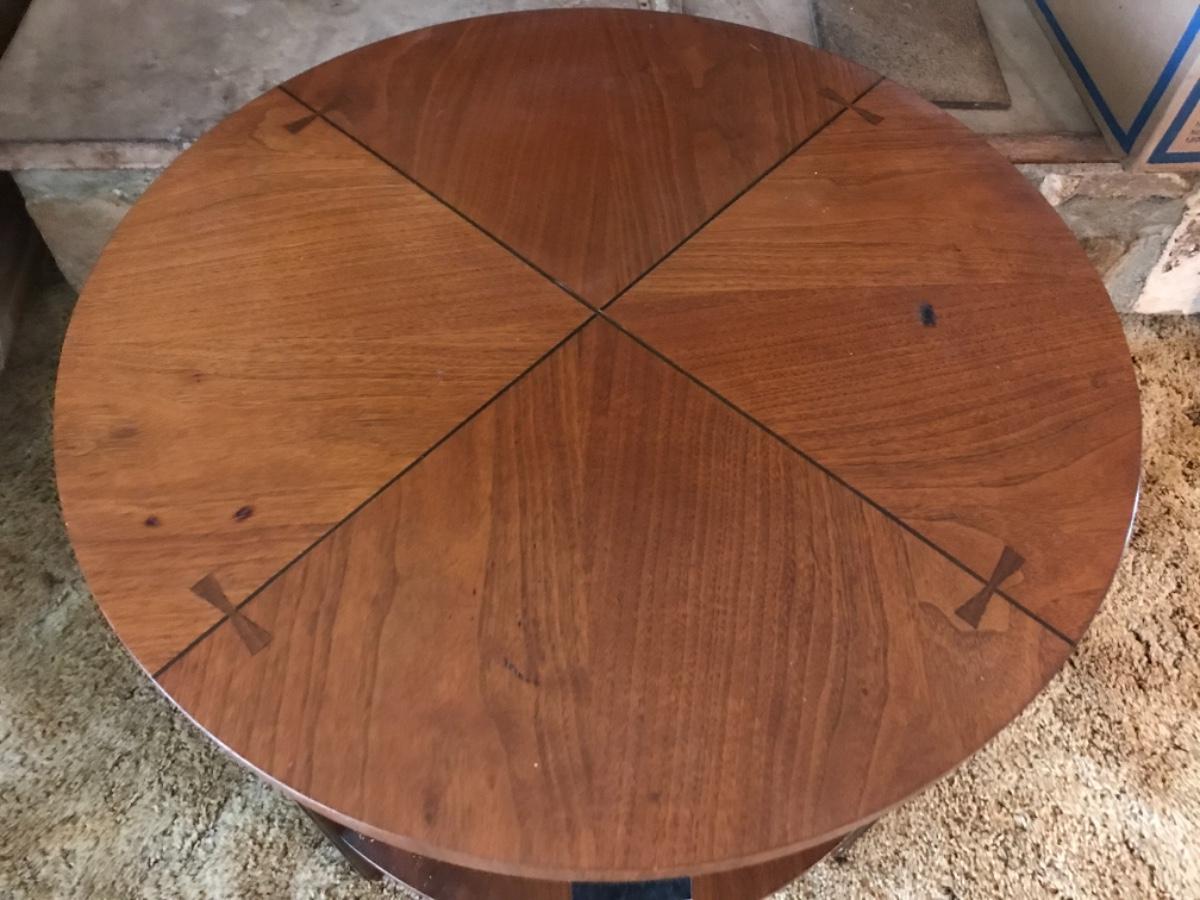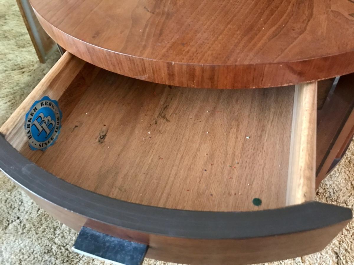 Vintage Mid Century MCM Barker Bros. Round end table, two level, one drawer, spindles on sides