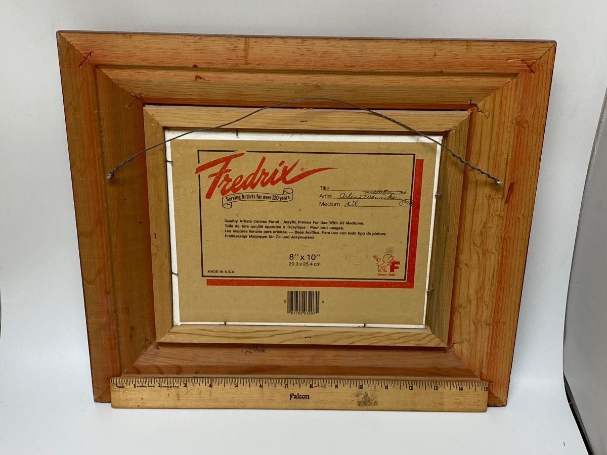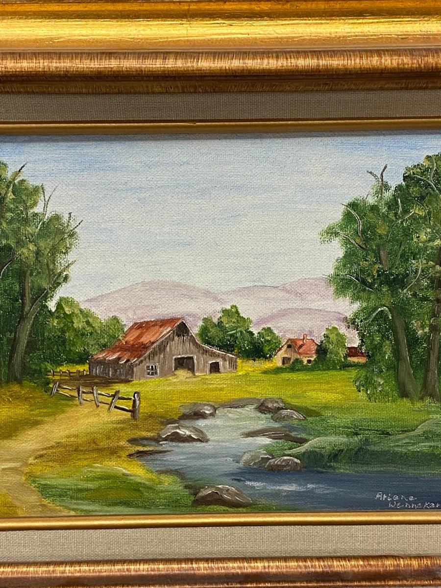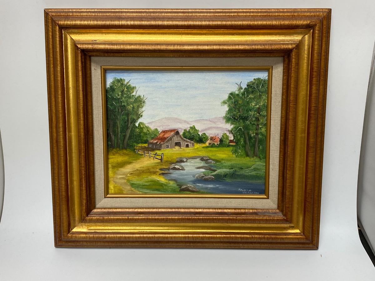 Barn next to the river oil painting. Nicely done. Art is 8x10 in a frame thats about 15x17 size.