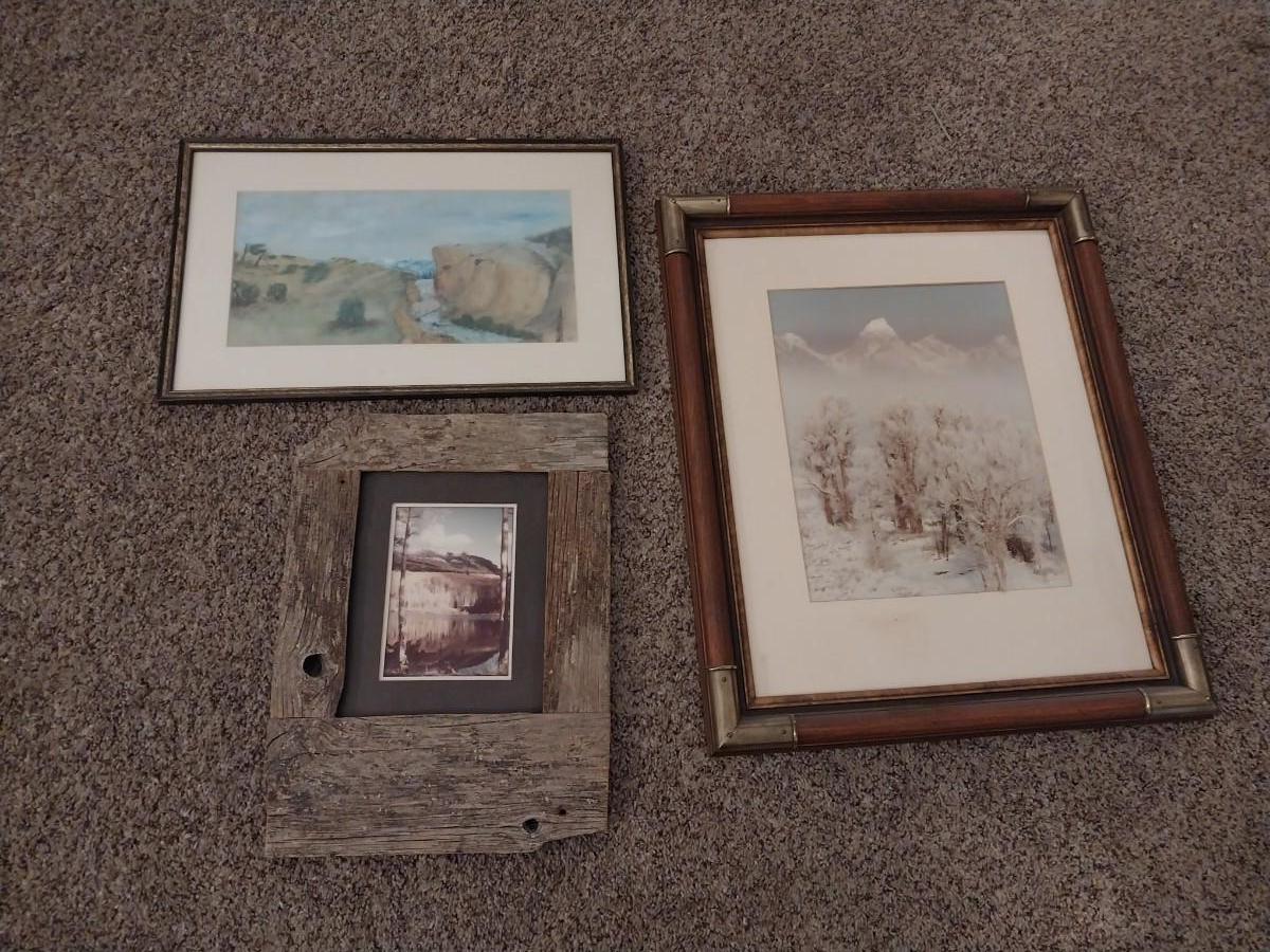 BARN WOOD FRAMED PHOTO, SNOW FILLED FRAMED PHOTO AND 1 MORE PICTURE