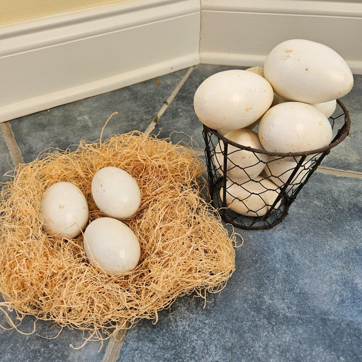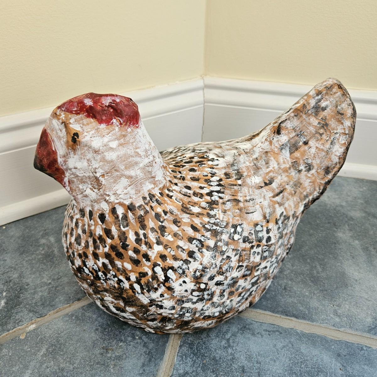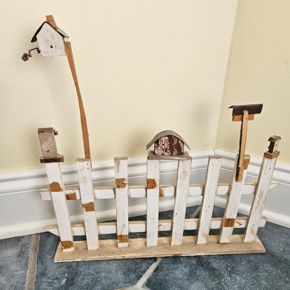 An assortment of home decor pieces that includes a paper mache chicken and pig that are both signed. A vintage, metal chick feeder, a wire basket with wooden eggs, a decorative fence with bird houses and a large metal basket that measures approximately 16" x 10.5" x 16"H. Shipping available