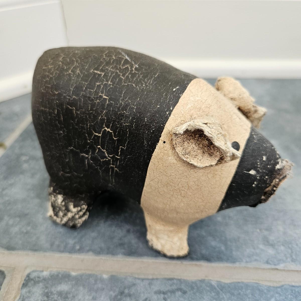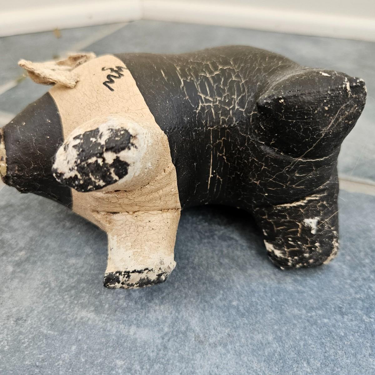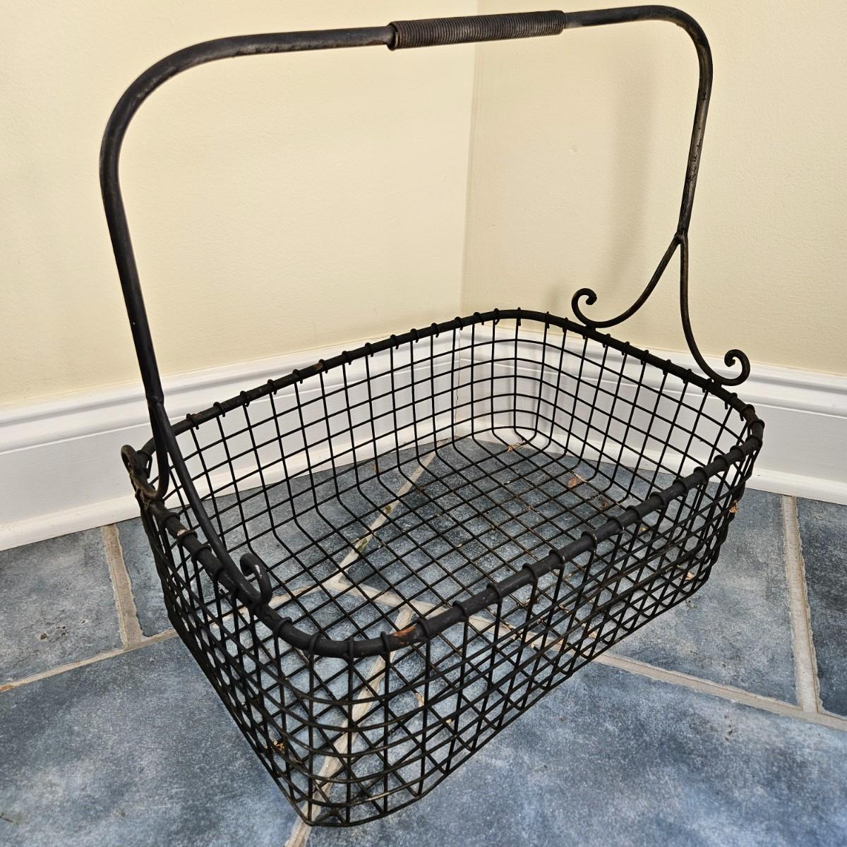 An assortment of home decor pieces that includes a paper mache chicken and pig that are both signed. A vintage, metal chick feeder, a wire basket with wooden eggs, a decorative fence with bird houses and a large metal basket that measures approximately 16" x 10.5" x 16"H. Shipping available