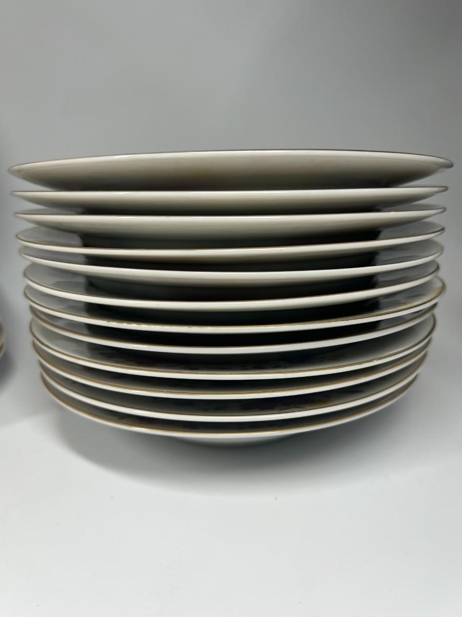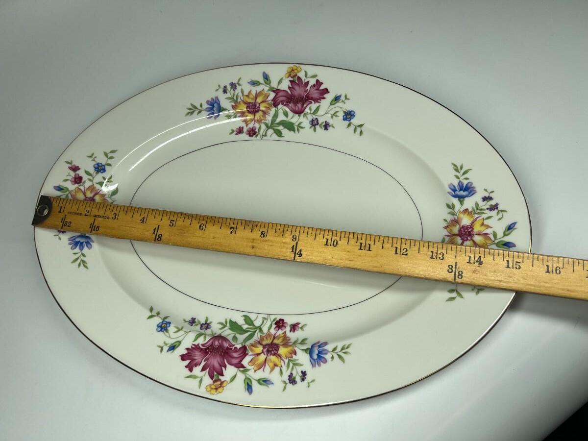 There is little to no wear on most of the pieces, but there is a chip on one of 8 inch plates. The set comes with 8 inch bowls (12), 8 inch plates (12), 6 1/2 inch plates (10), 5 inch bowls (12), 10 inch plates (12), a gravy boat, and 2 large serving dishes. The photos are in order according to the list, check pictures for more details and for sizing.