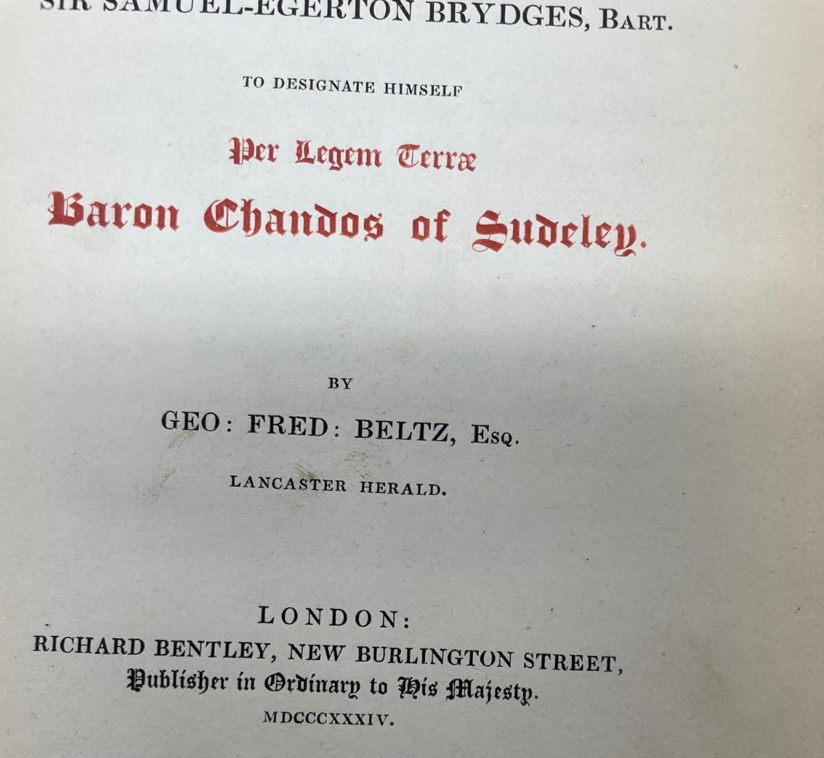 Description: A Review of the Chandos Peerage Case Adjudicated 1803 by Geo:Fred:Beltz, Esq. Copyright 1834; Material: Paper