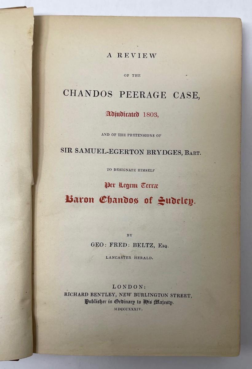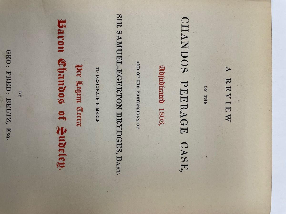 Description: A Review of the Chandos Peerage Case Adjudicated 1803 by Geo:Fred:Beltz, Esq. Copyright 1834; Material: Paper