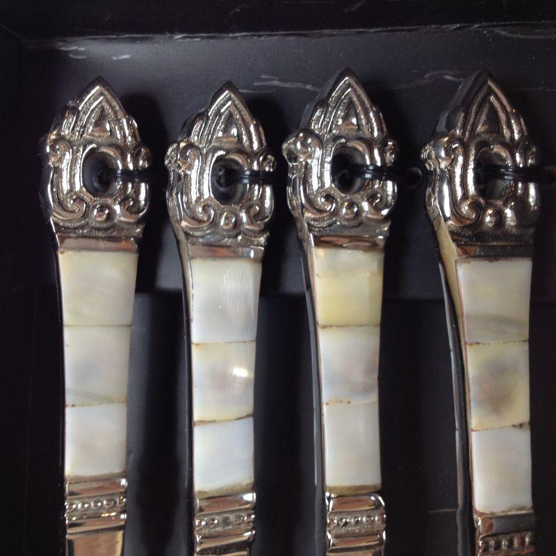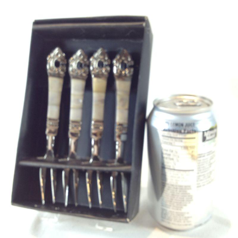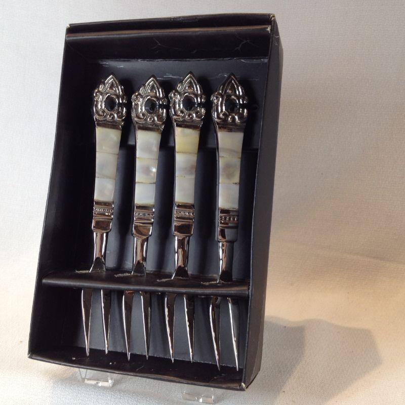 This lot is a set of lovely mother of pearl handle Baroque-style Cocktail Forks in the original box. These are new and have never been used. The tag shows they were originally sold by the Bombay Company.