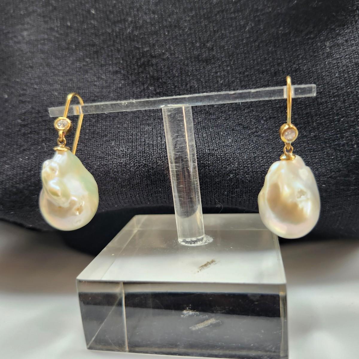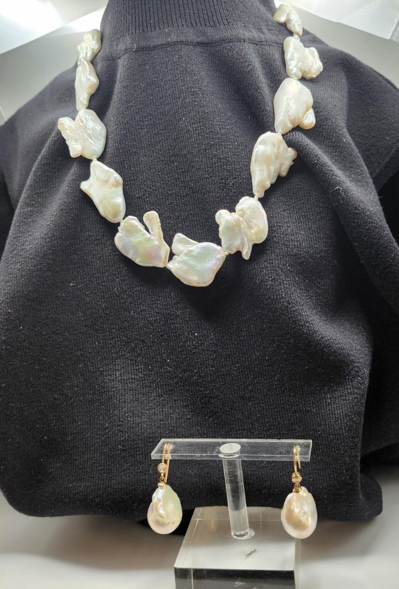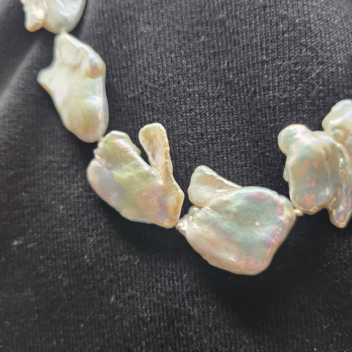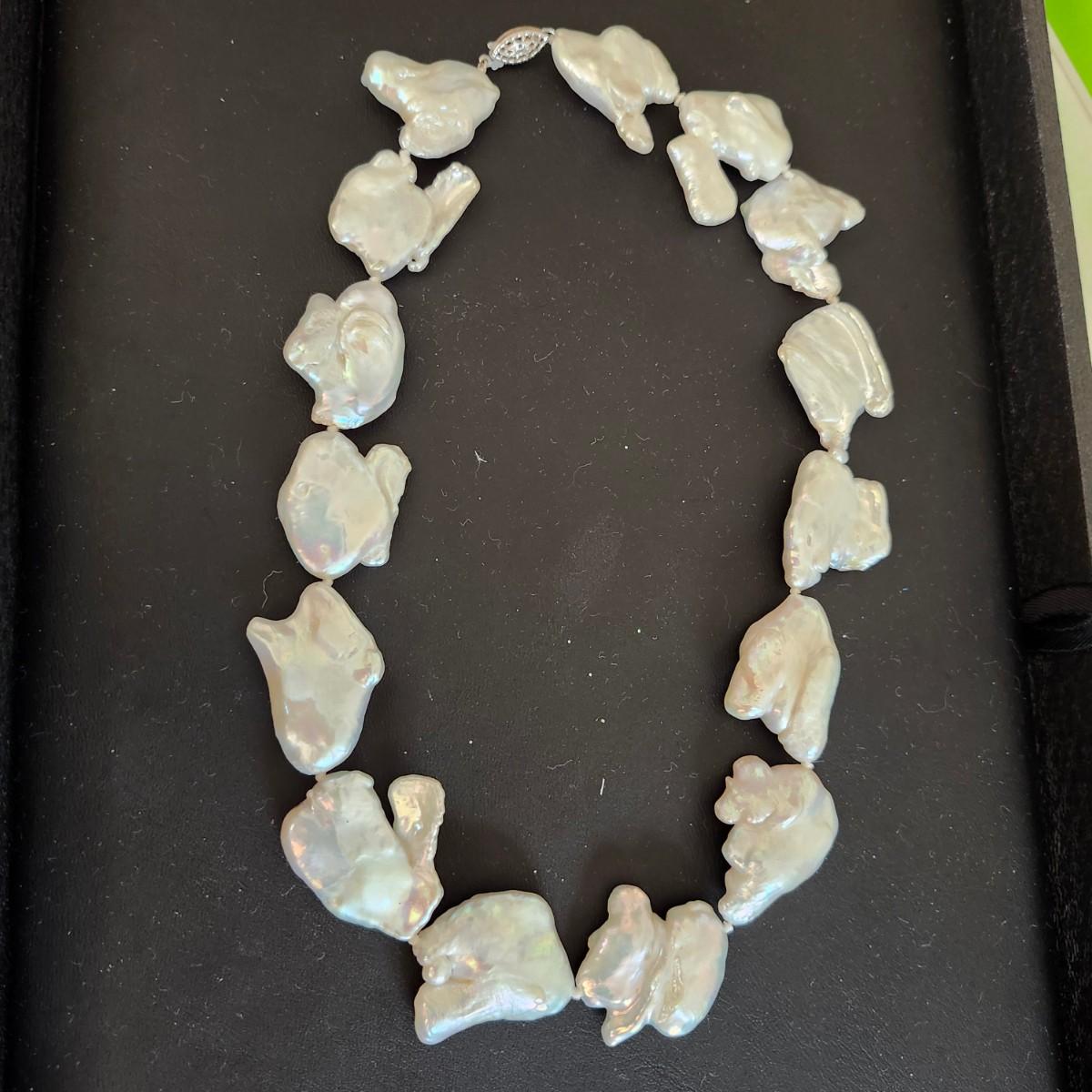 Lovely Keshi pearls, large iridescent fireball pearls are hand knotted into this 18 inch necklace.