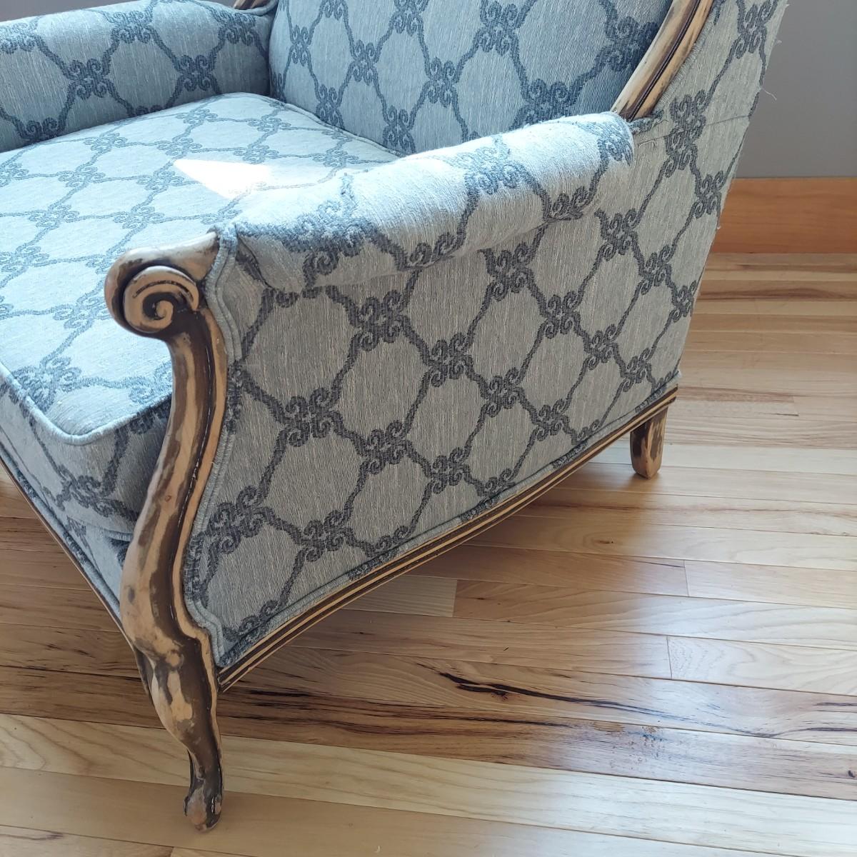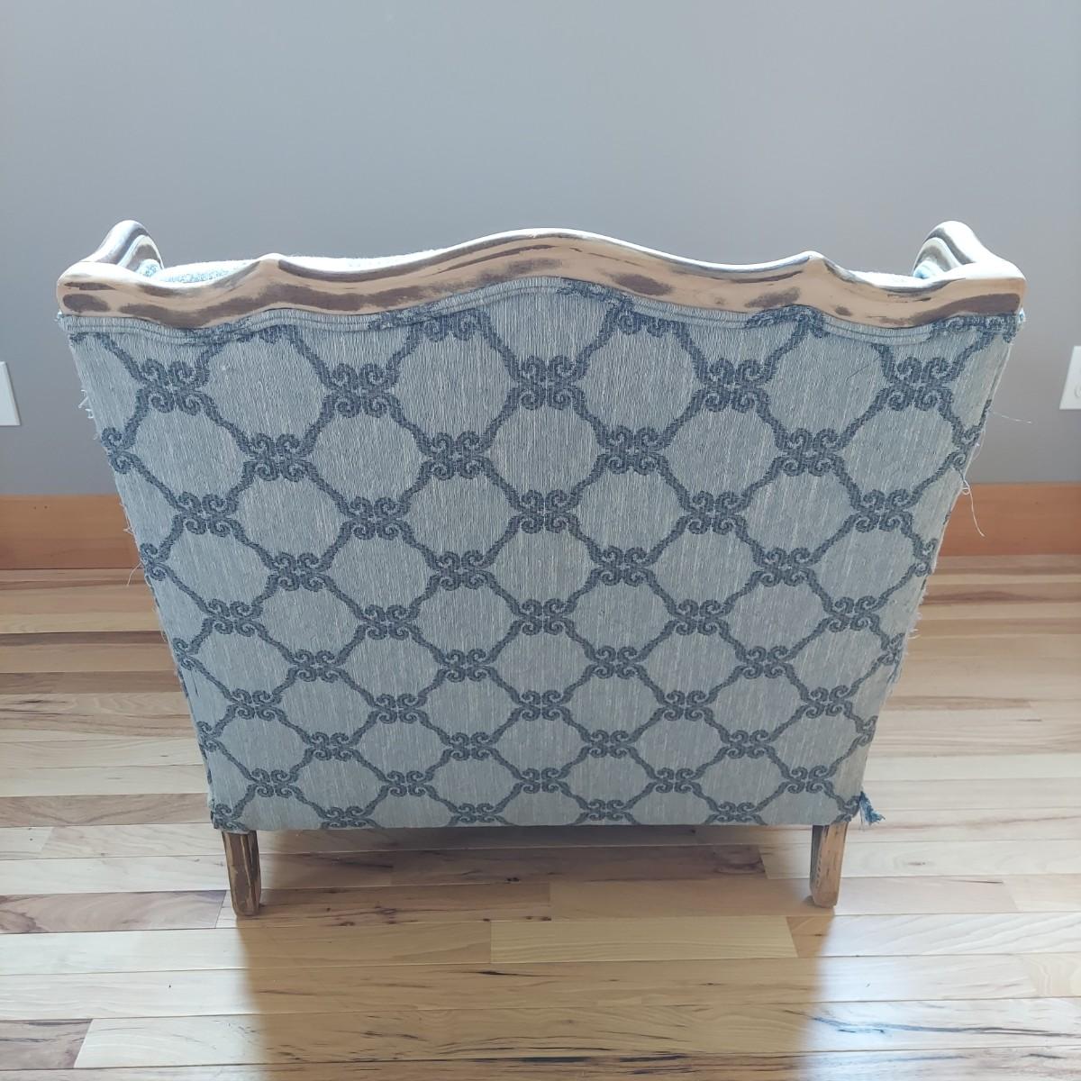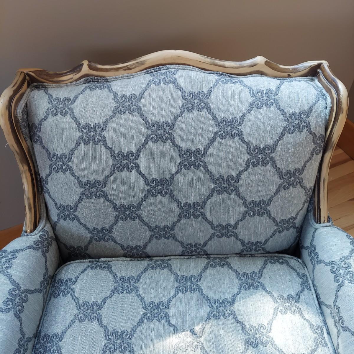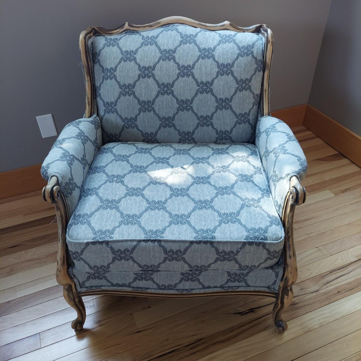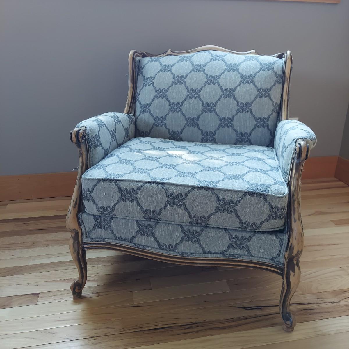 Blue on blue brocade covered armchair with distressed wood trim and legs. There is some wear overall but especially to back edges. Please note item is from a pet owned home. Measures approximately 32 x 32 x 31"H. Seat height is 18". Local Pickup Only.