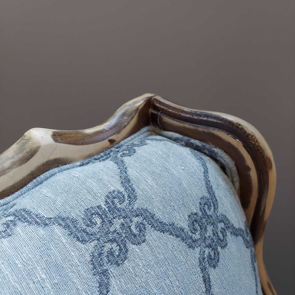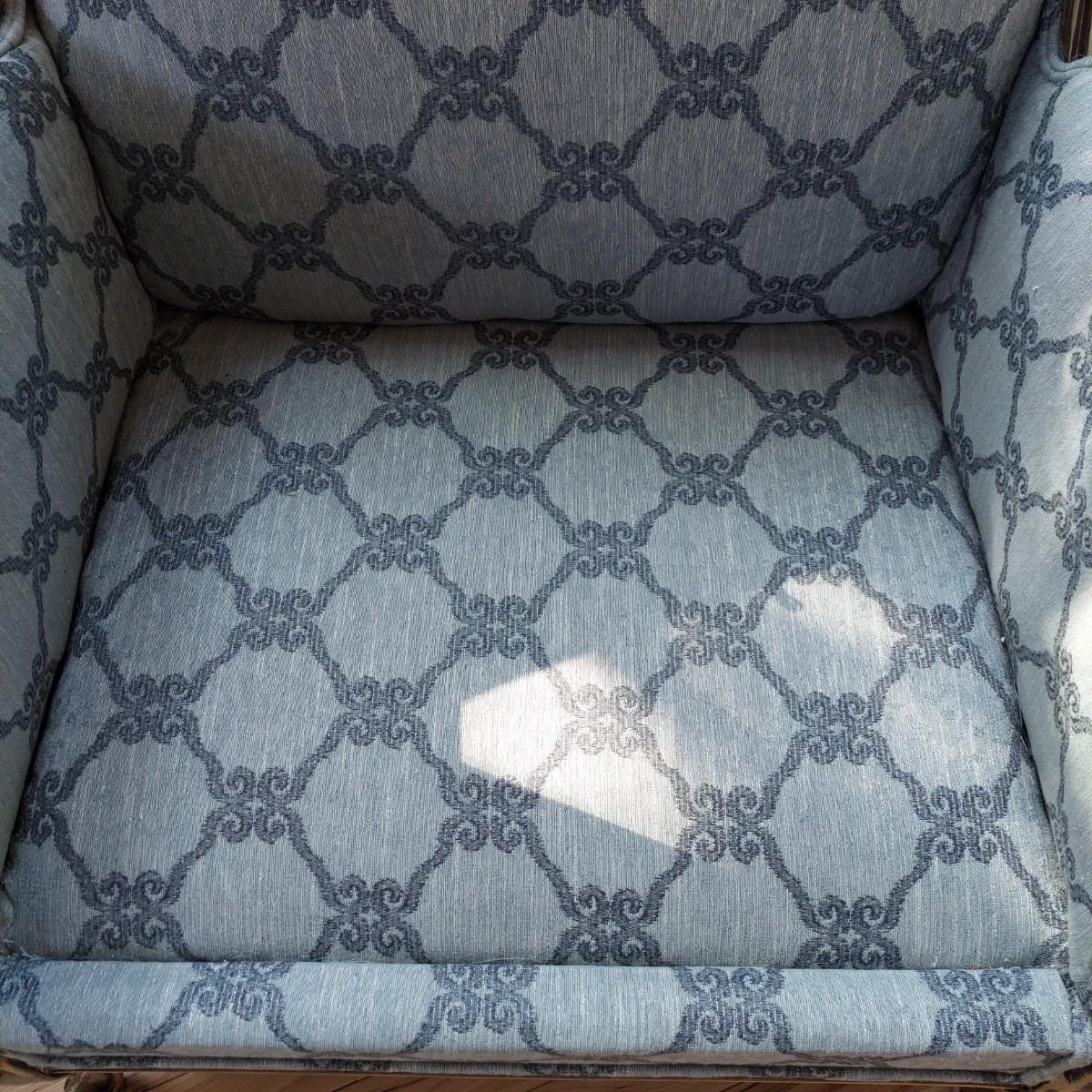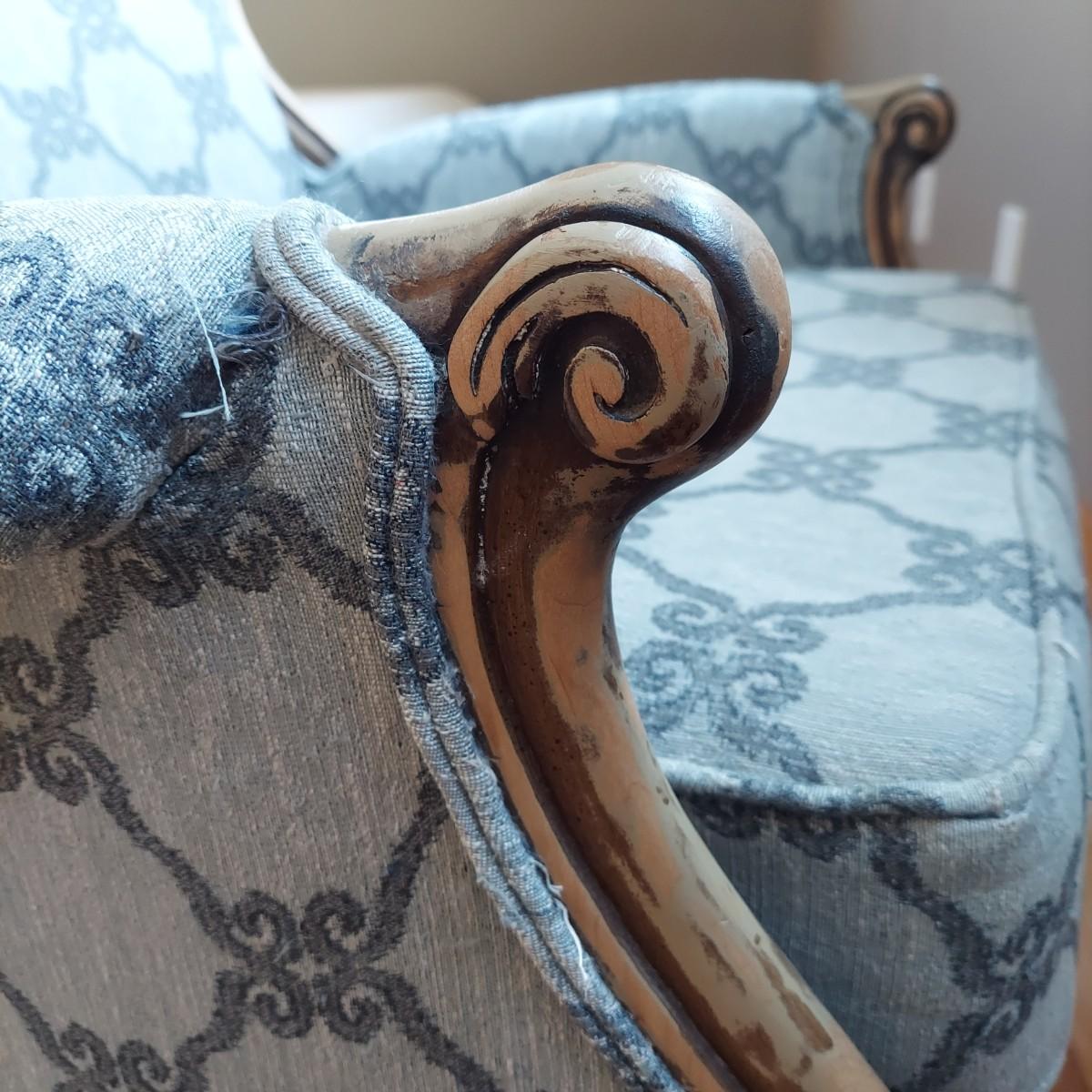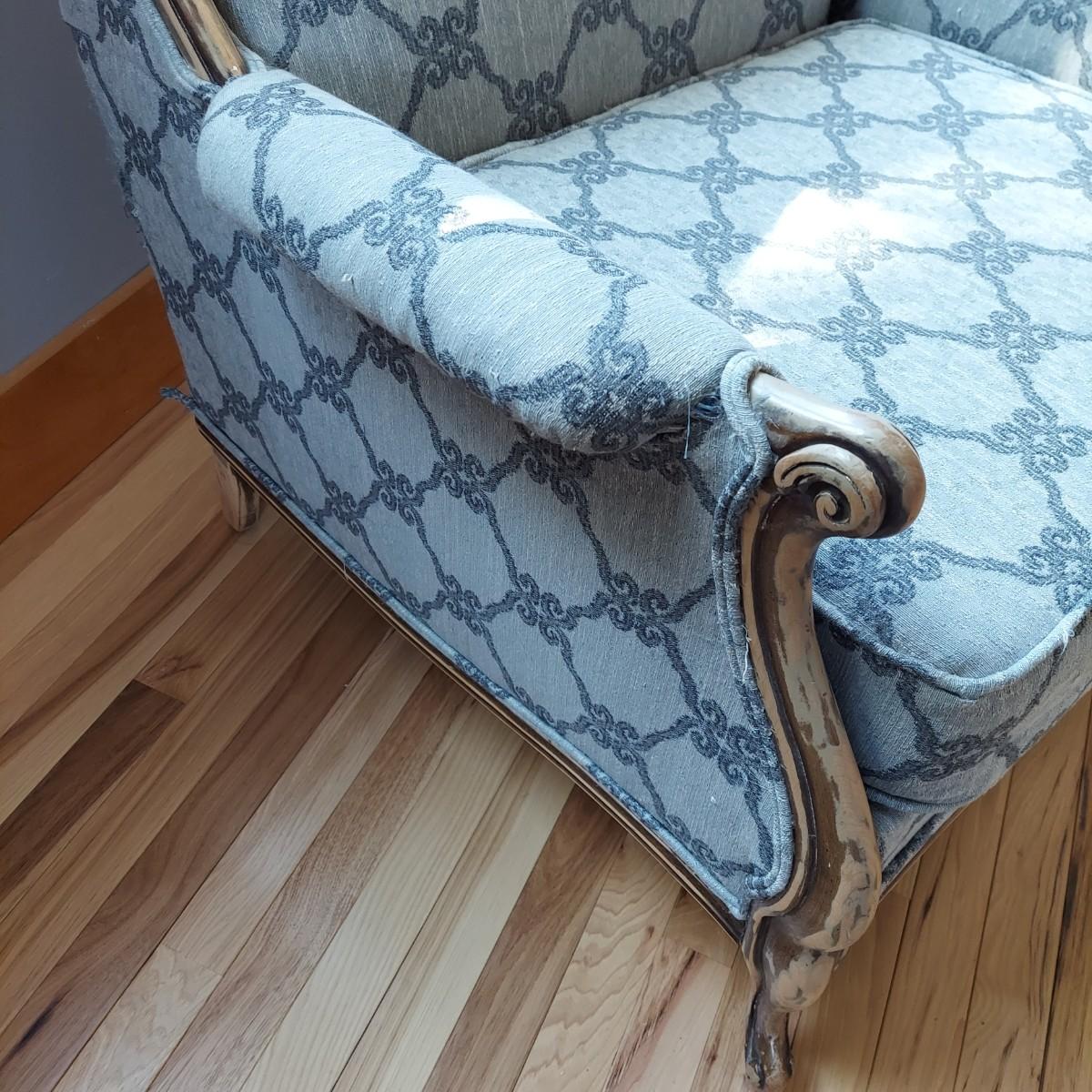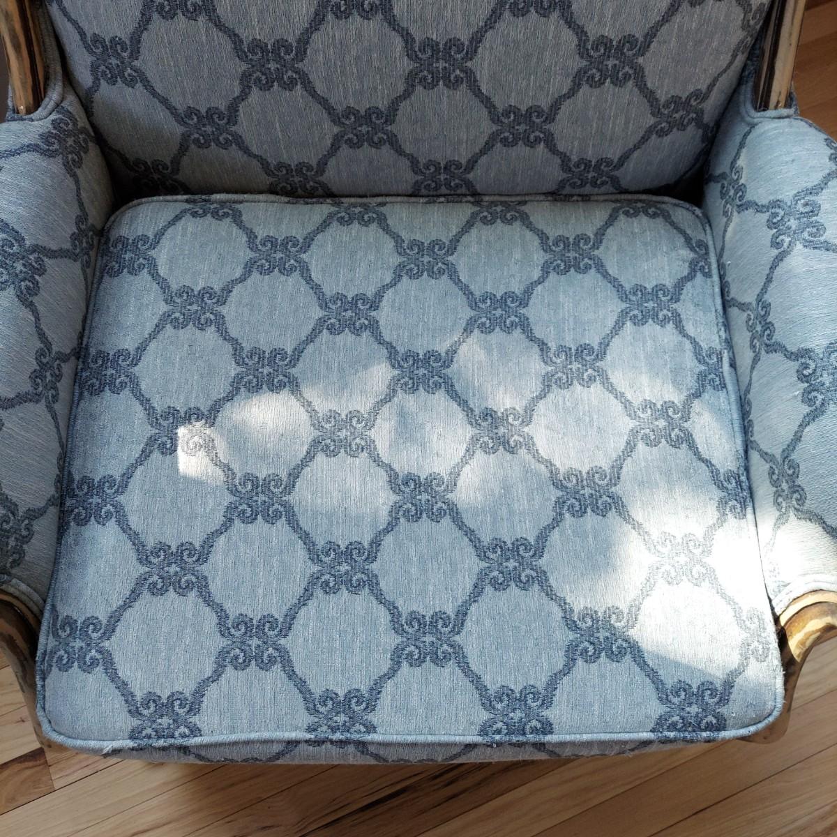 Blue on blue brocade covered armchair with distressed wood trim and legs. There is some wear overall but especially to back edges. Please note item is from a pet owned home. Measures approximately 32 x 32 x 31"H. Seat height is 18". Local Pickup Only.
